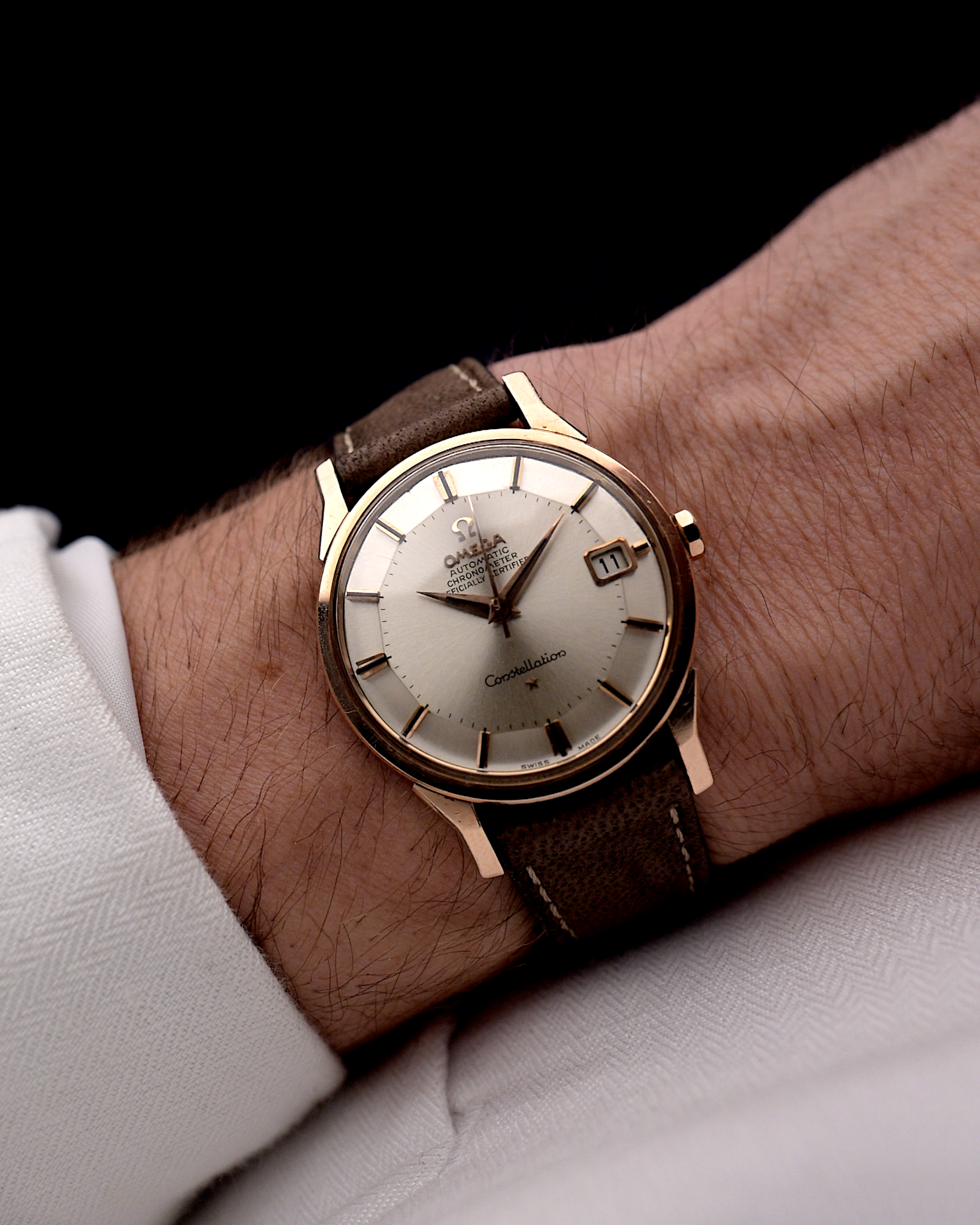 Bien proporcionado, sencillo y clásico, este Constellation cuenta con un fondo de caja atornillado, cronómetro automático Omega Calibre 561 y unas magníficas asas giradas ligeramente hacia abajo.