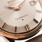 Este compacto y hermoso cronómetro automático Omega Constellation tiene todo lo que usted desea en un reloj de vestir: Caja de acero inoxidable de 34 mm chapada en oro rosa (muy poco común), segundero central, una esfera plateada sunburst muy bonita y unos raros índices de bastón delgados con incrustaciones de ónice y una esfera Pie Pan. Lanzado por primera vez en 1952, el Constellation fue la respuesta de Omega al Rolex Datejust.