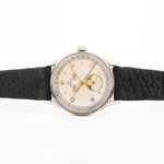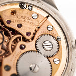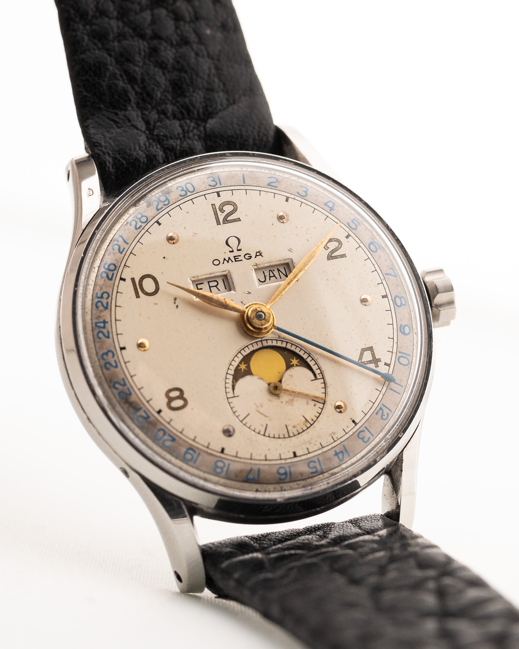 El Omega Cosmic se presentó en 1947 y estuvo en catálogo hasta 1956 como el reloj más prestigioso del catálogo de la marca. Este ejemplar es una referencia 2471-1 en acero inoxidable, mide 35 mm y alberga el movimiento Omega Cal. 27 DL PC de fases lunares.