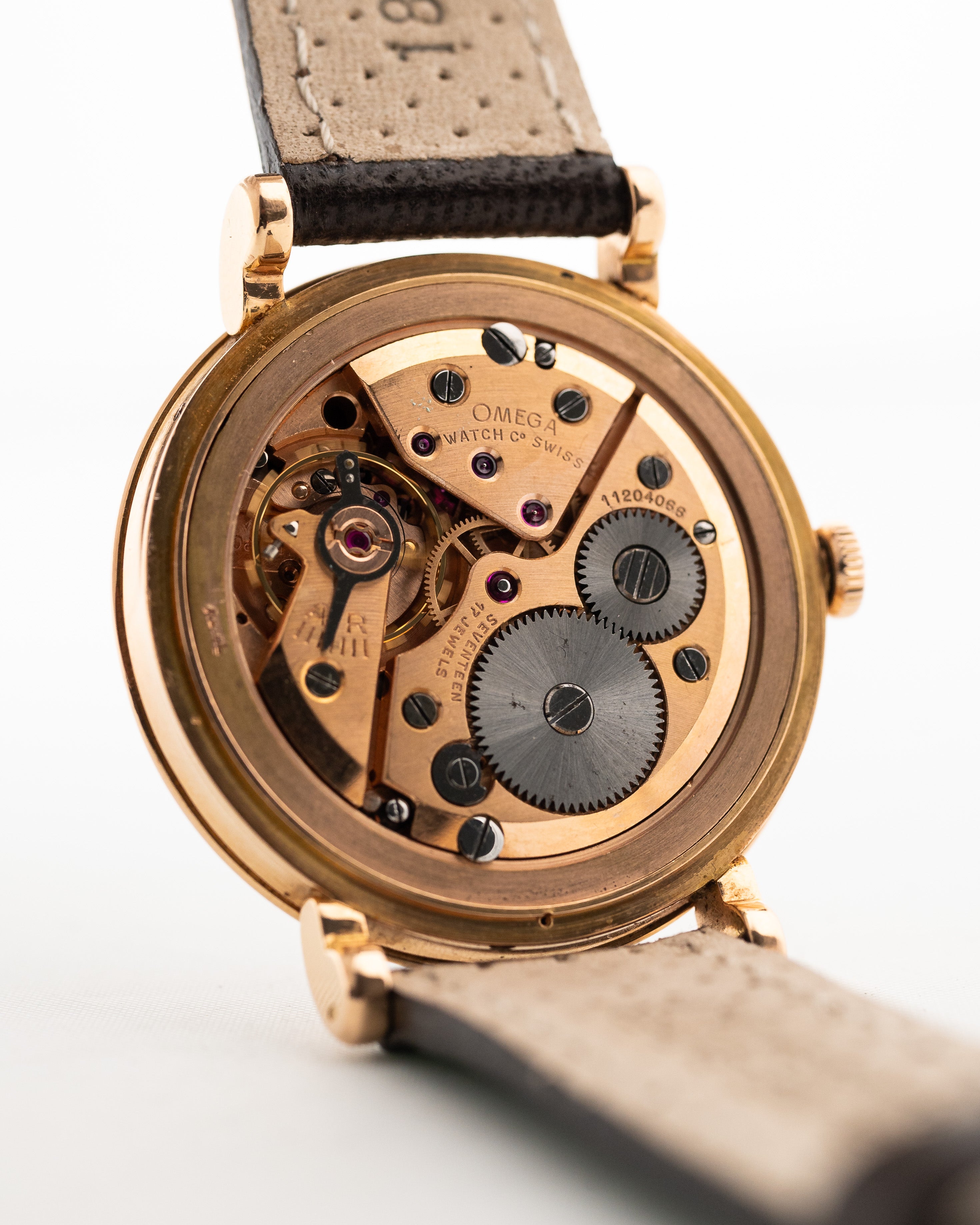 El Omega Cosmic se presentó en 1947 y estuvo en catálogo hasta 1956 como el reloj más prestigioso del catálogo de la marca. Nuestro ejemplar es una referencia 2485 en oro rosa de 18 quilates, mide un jumbo de 37,5 mm y alberga el movimiento Omega Calibre 27 DL PC basado en Lemania.