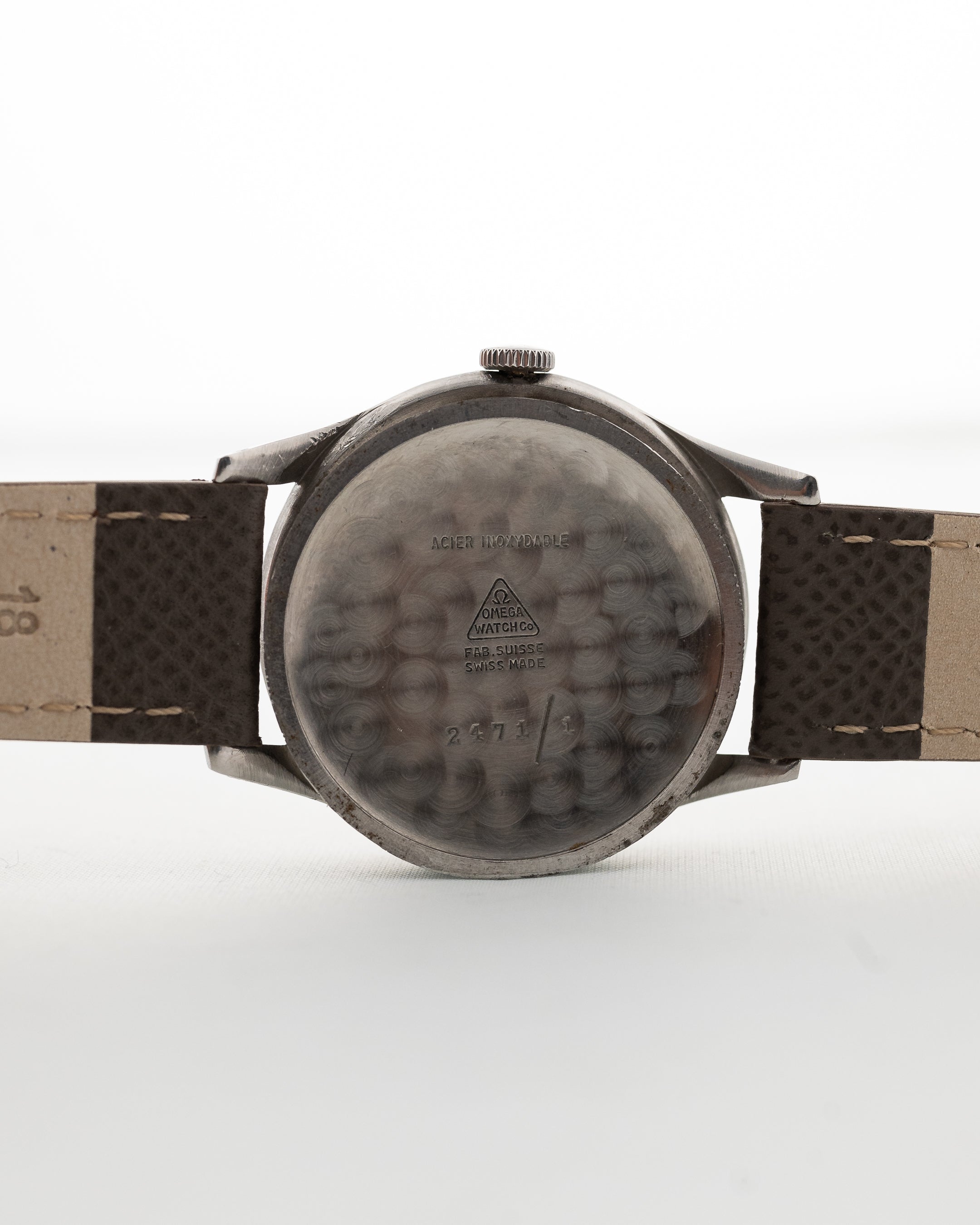 El Omega Cosmic se presentó en 1947 y estuvo en catálogo hasta 1956 como el reloj más prestigioso del catálogo de la marca. Este ejemplar es una referencia 2471-1 en acero inoxidable, mide 35 mm y alberga el movimiento Omega Calibre 27 DL PC basado en Lemania.