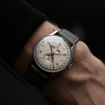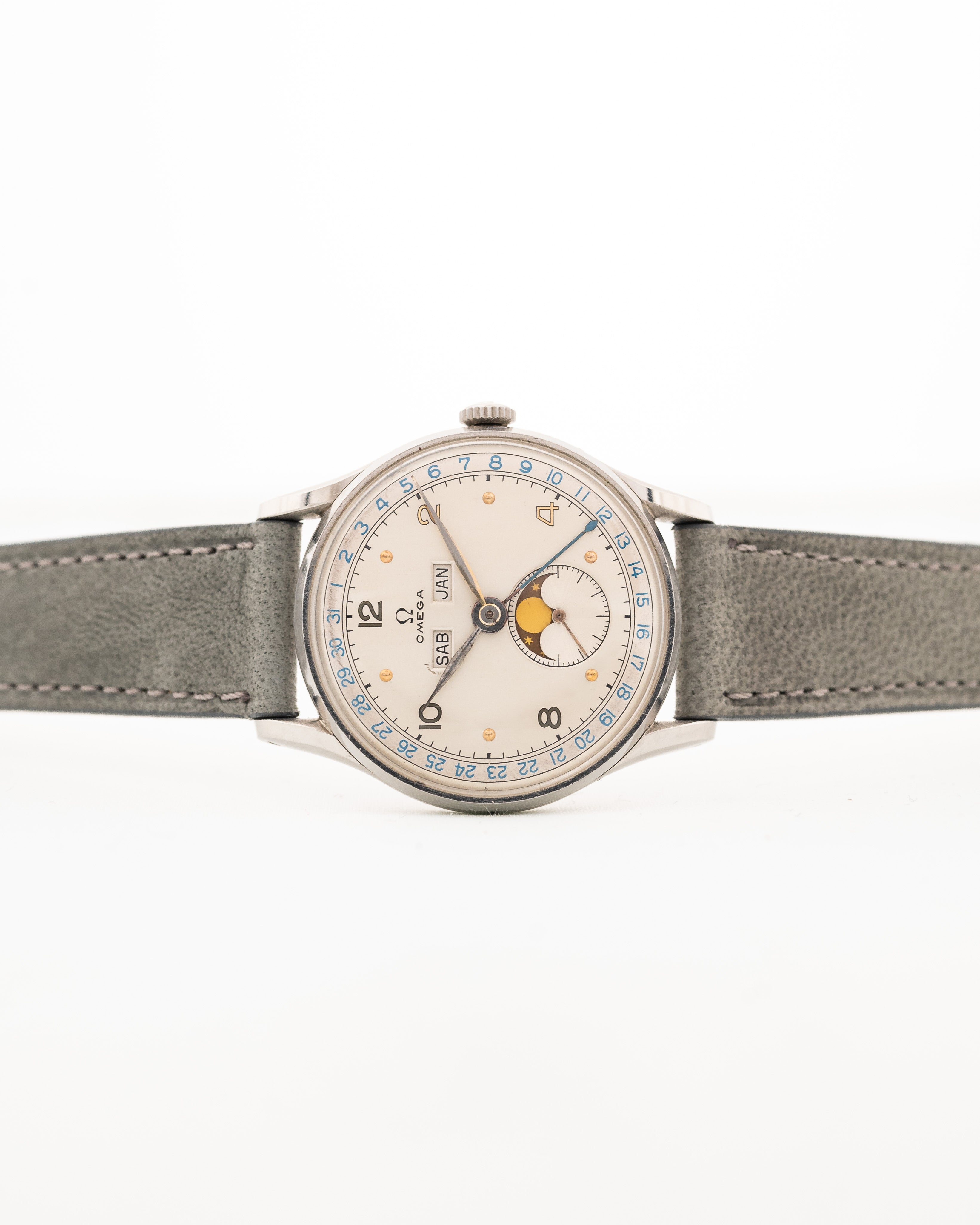 El Omega Cosmic se presentó en 1947 y estuvo en catálogo hasta 1956 como el reloj más prestigioso del catálogo de la marca. Este ejemplar es una referencia 2471-1 en acero inoxidable, mide 35 mm y alberga el movimiento Omega Cal. 381 de fases lunares.