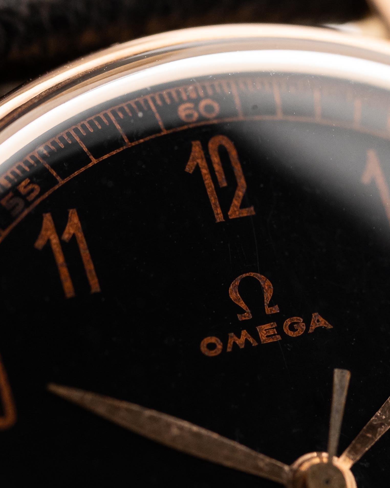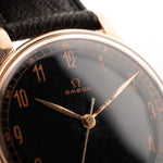 Este Omega de 1944 tiene todo lo que usted desea en un reloj de vestir: una caja mediana de 35 mm, una esfera negra profunda con números Art Déco en rosa y una hermosa caja de oro rosa, agujas de hoja y logotipo Omega.