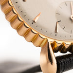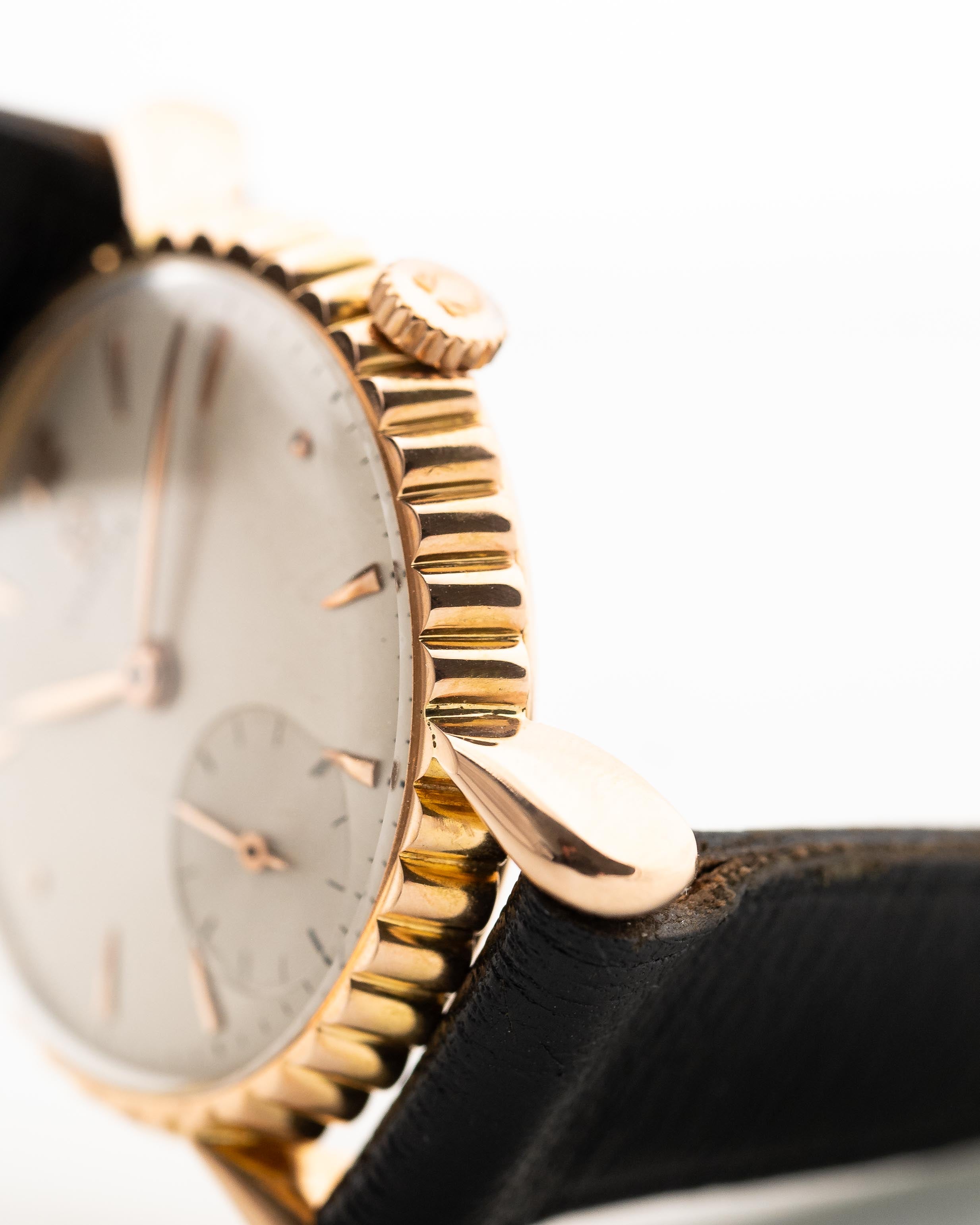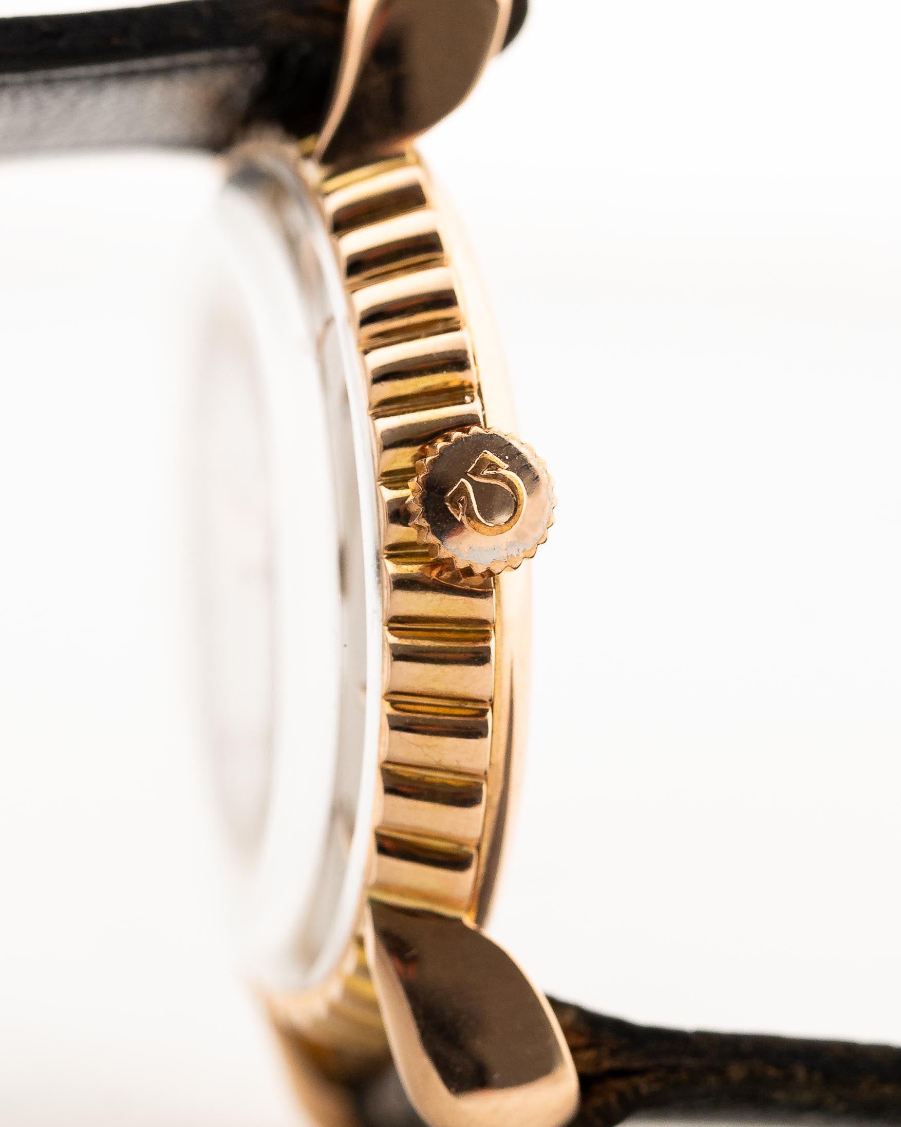 Este Omega de 1947 es algo muy único. Este diseño de caja lo encontrará muy raramente - en este estado casi imposible. La caja de 32 mm es ligeramente más grande debido al diseño especial de la caja. Una limpia esfera plateada con segundero subsidiario y la hermosa caja de oro rosa, las manecillas y el logotipo Omega de oro rosa aplicado lo llevan a otro nivel de los relojes de vestir.