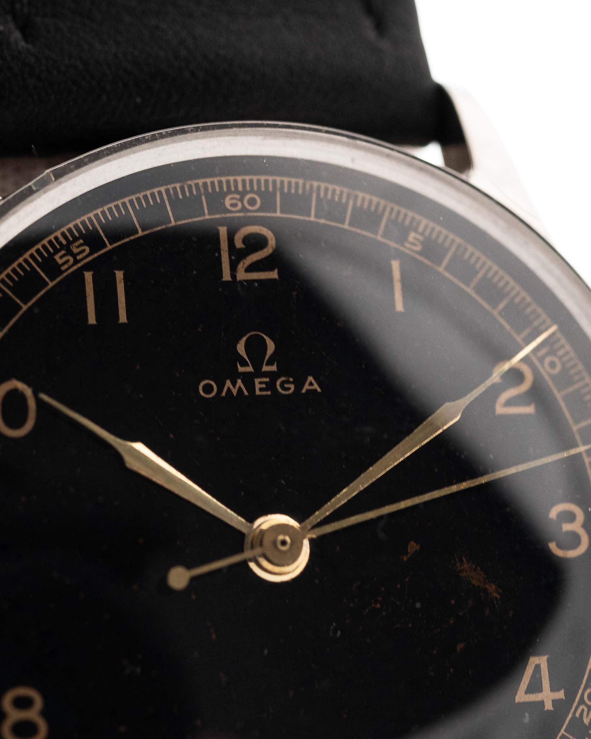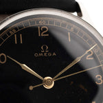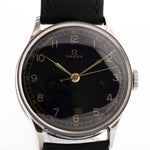 Reloj vintage Omega Gilt Syringe de 1939, caja de acero inoxidable de 33 mm, esfera dorada negra, movimiento de cuerda manual, correa de piel negra