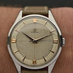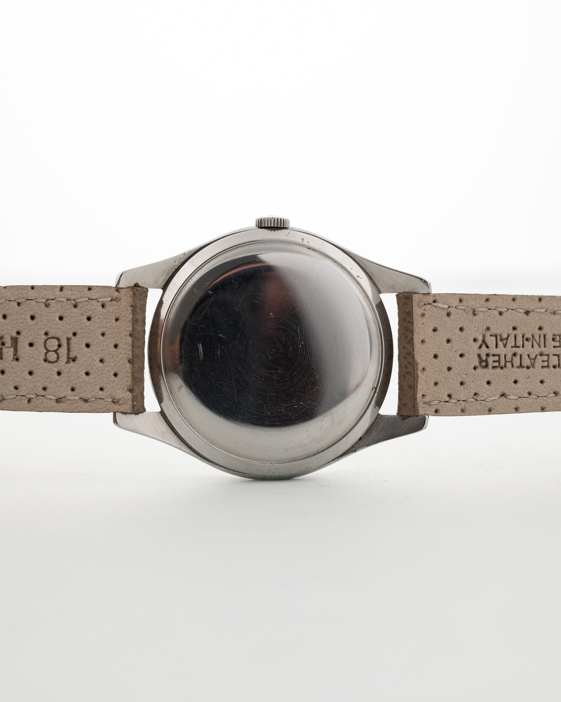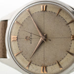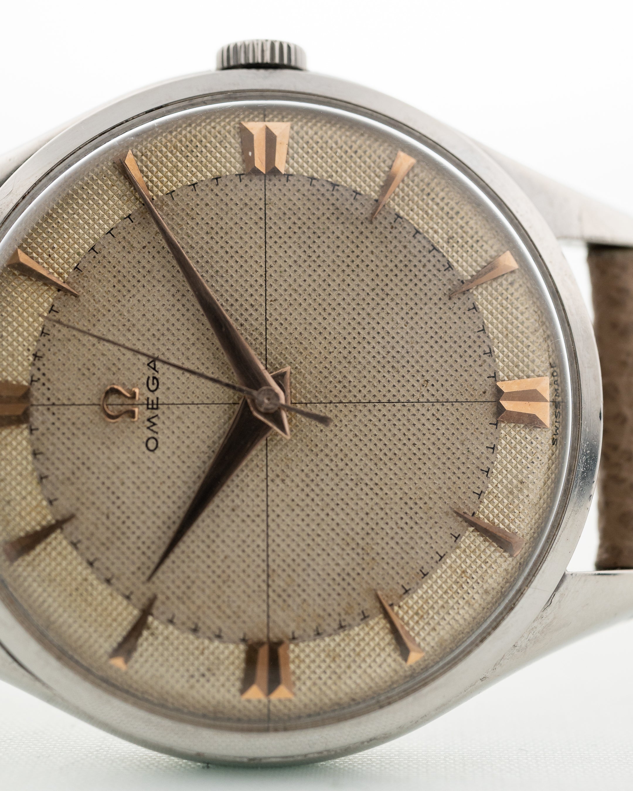 Los Omega vintage son los reyes de los relojes de vestir discretos y esta versión de nido de abeja no es diferente. Este Omega de 1952 tiene todo lo que se busca en un reloj de vestir: una caja sobredimensionada de 38 mm, una estupenda esfera nido de abeja con segundero subsidiario y hermosas manecillas dauphine de oro rosa. Además, cuenta con unos índices en flecha de oro rosa superpuestos muy elegantes y el muy preciso calibre Omega 283.