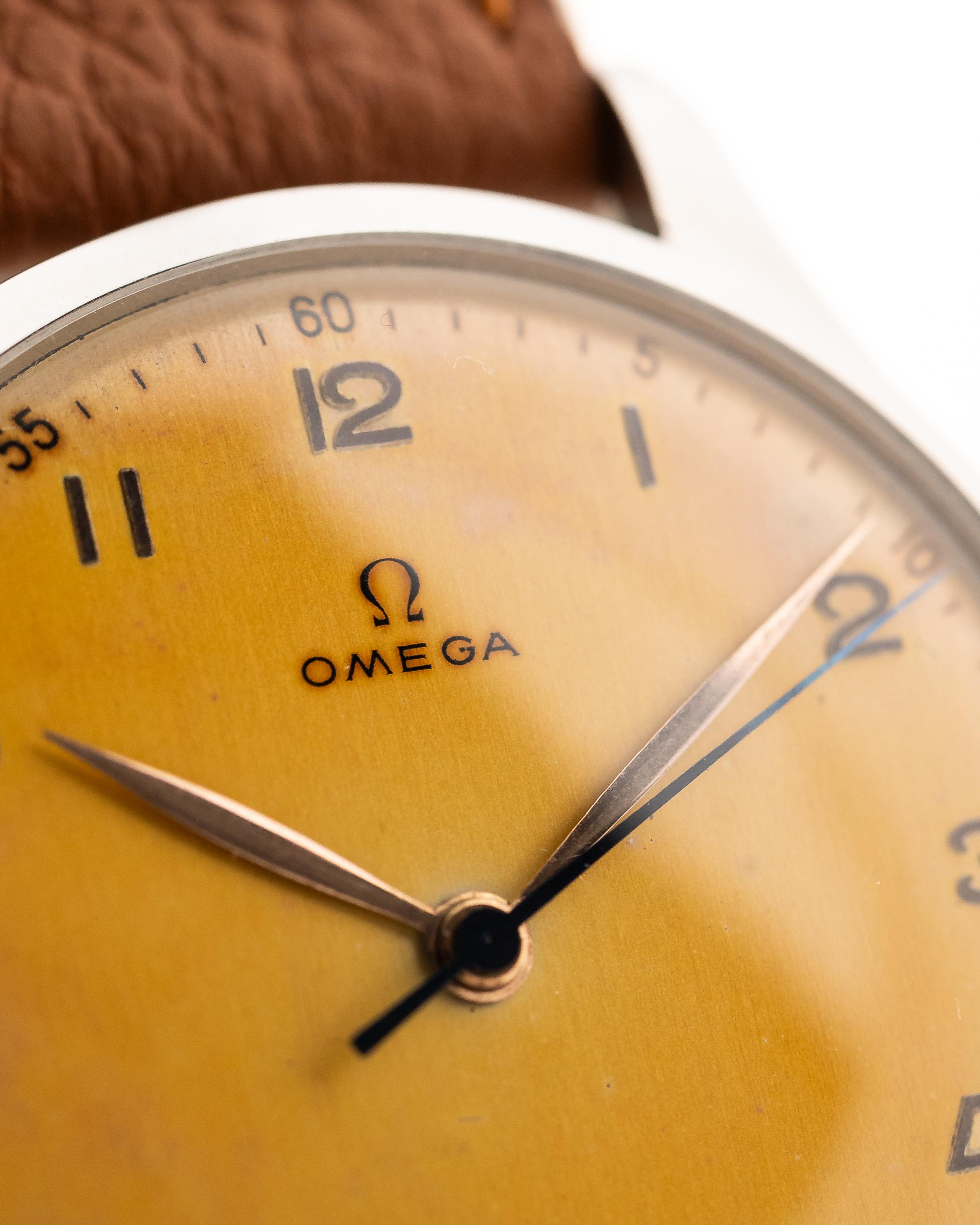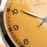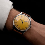 La década de 1940 fue una buena época para Omega, como ejemplifica este hermoso reloj de vestir. Este ejemplar no sólo es bonito, sino también sustancioso. Equipado con una enorme caja de acero inoxidable de 38 mm, asas curvadas hacia abajo y con una preciosa esfera de color miel, realmente no hay nada mejor que este reloj.