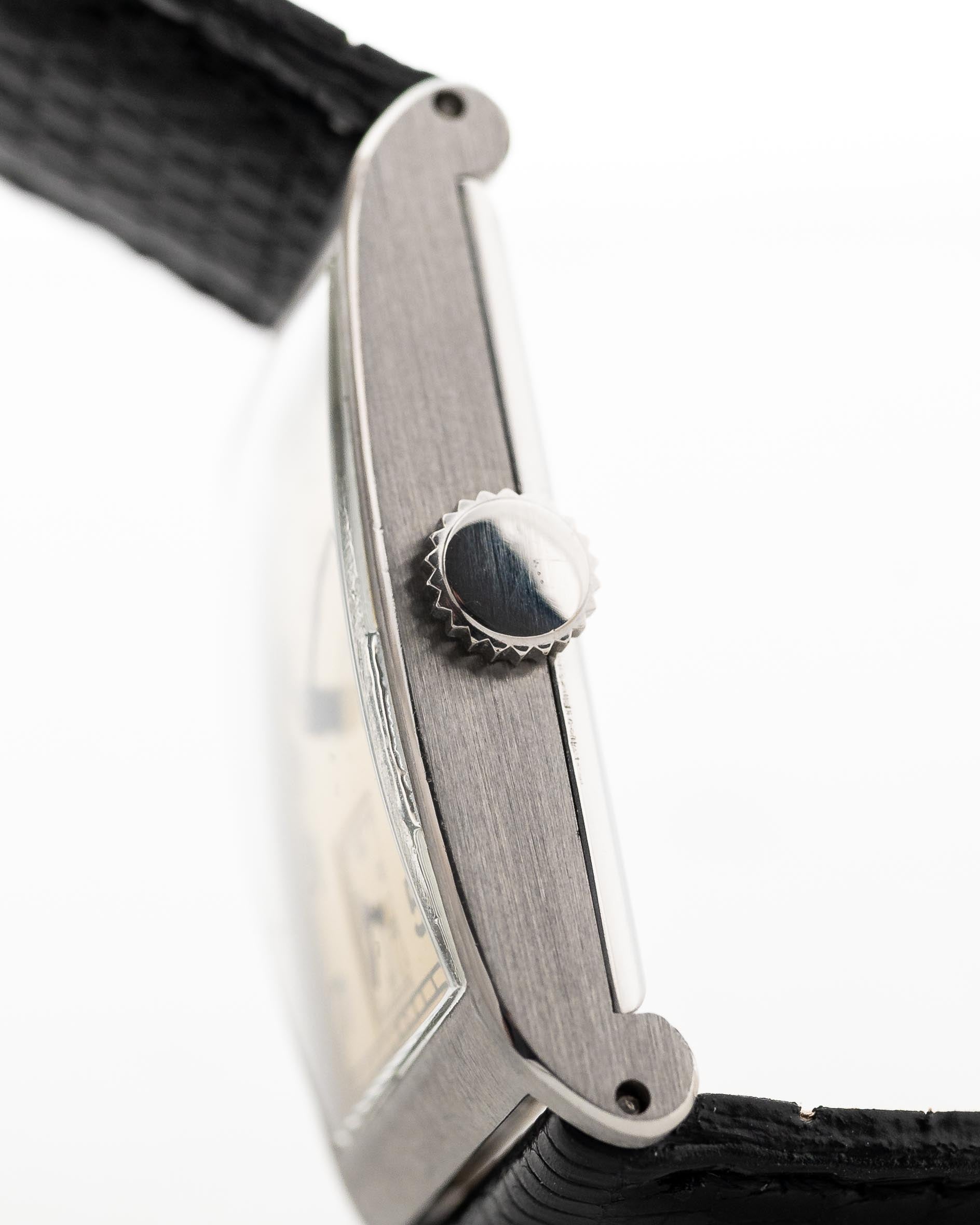 No es el primer reloj Omega Art Déco de vestir del que nos enamoramos. Este ejemplar cuenta con una caja rectangular de acero y resulta aún más atractivo por sus fantásticas agujas de hoja de acero azulado y su esfera dorada con números árabes Art Déco y segundero subsidiario, y luce más grande gracias a su enorme diámetro de orejeta a orejeta.