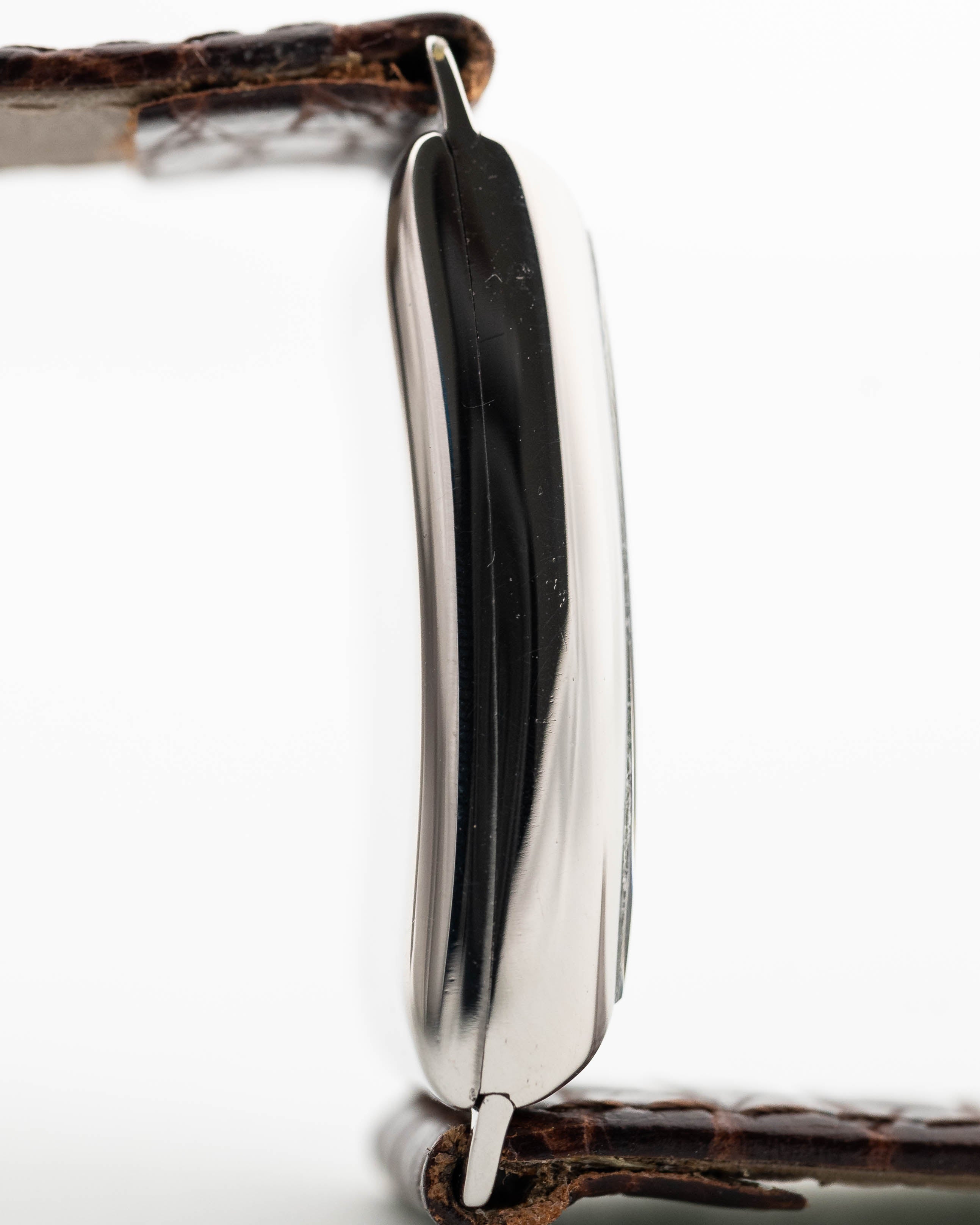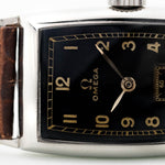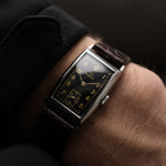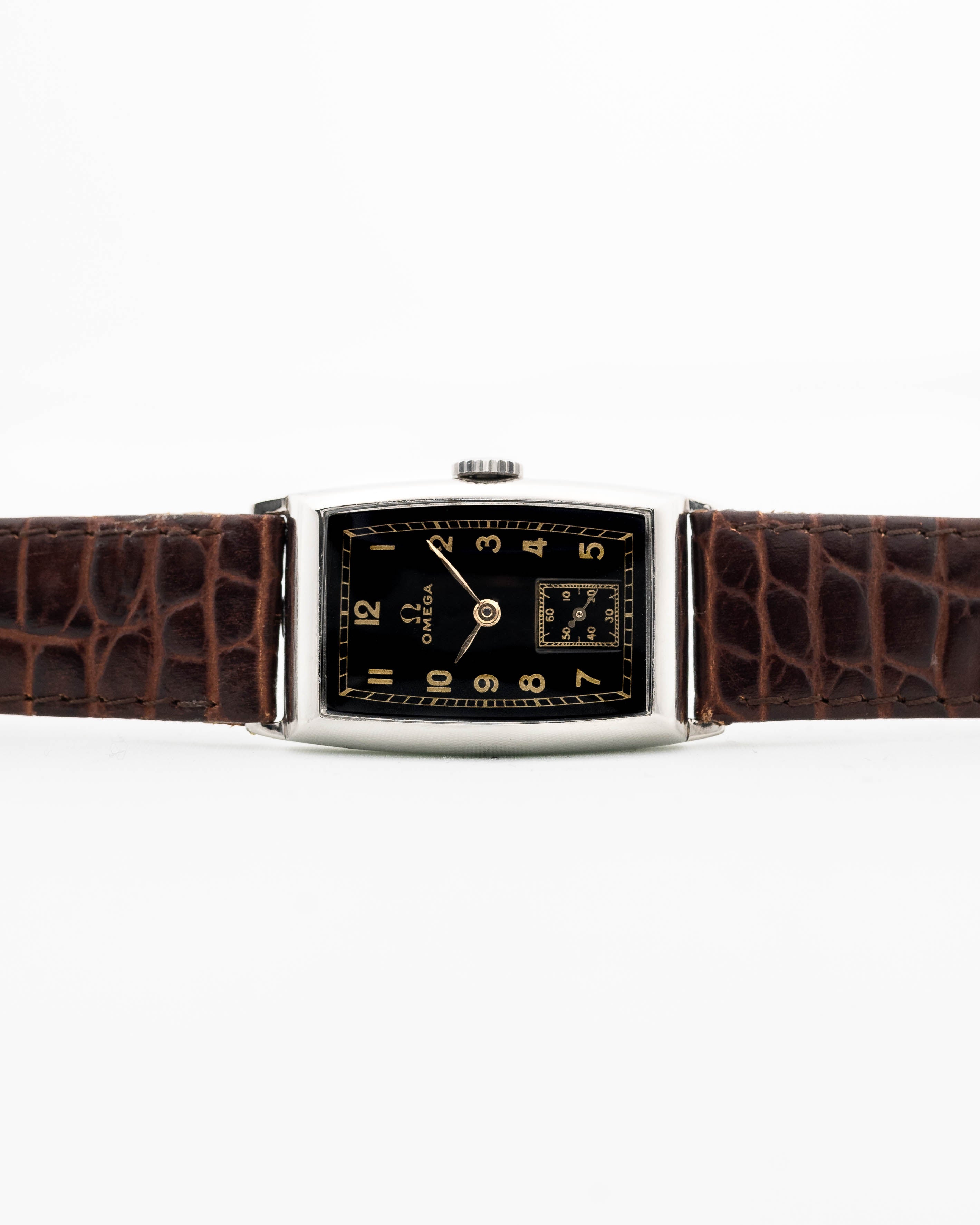 No es el primer reloj de vestir Omega Art Déco del que nos enamoramos. Este ejemplo cuenta con una caja rectangular de acero en forma de tanque y resulta aún más atractivo gracias a su preciosa esfera dorada negra brillante con números árabes Art Déco, segundero subsidiario y un maravilloso y exclusivo minutero dorado. Y la guinda del pastel es su magnífico estado de conservación.