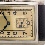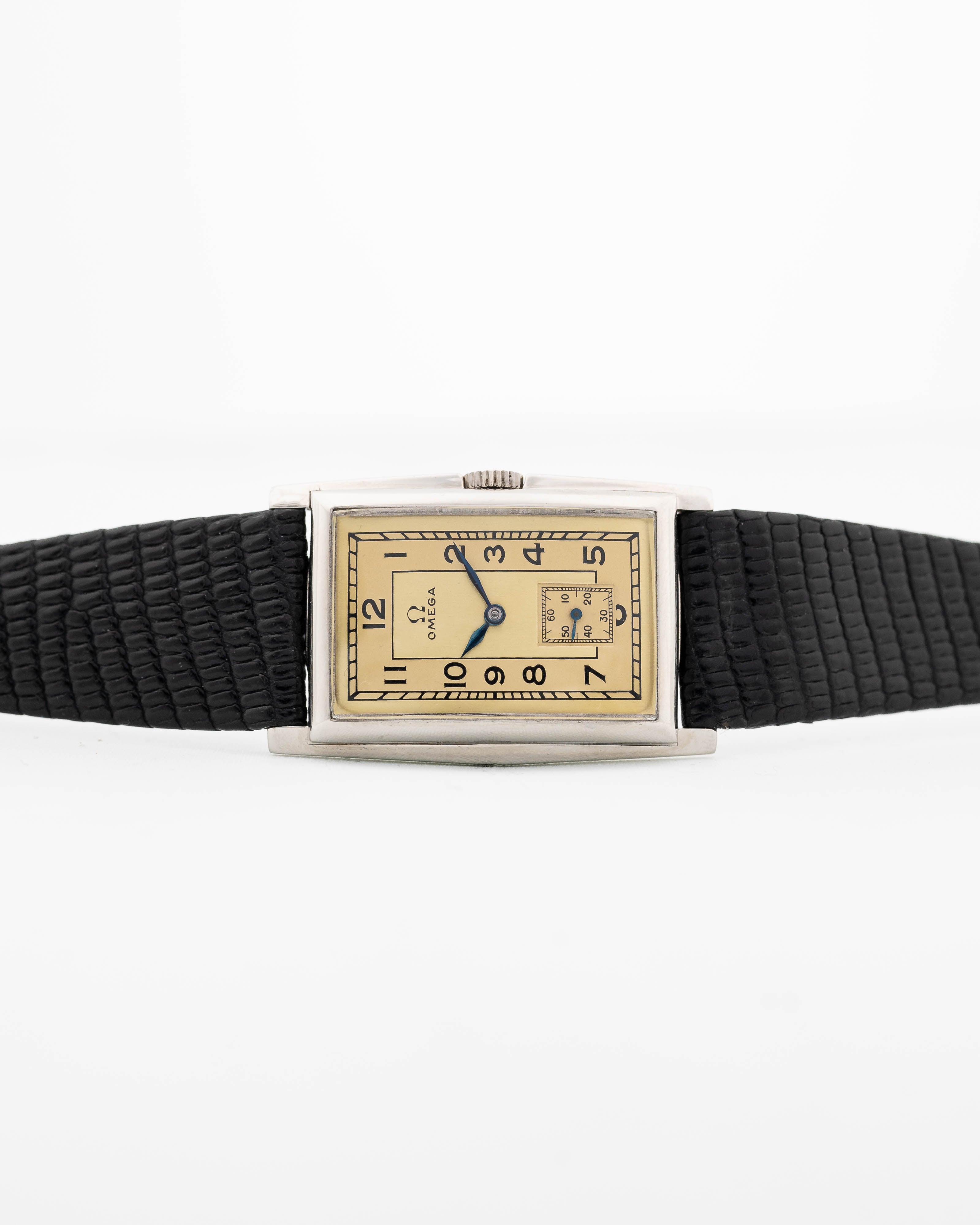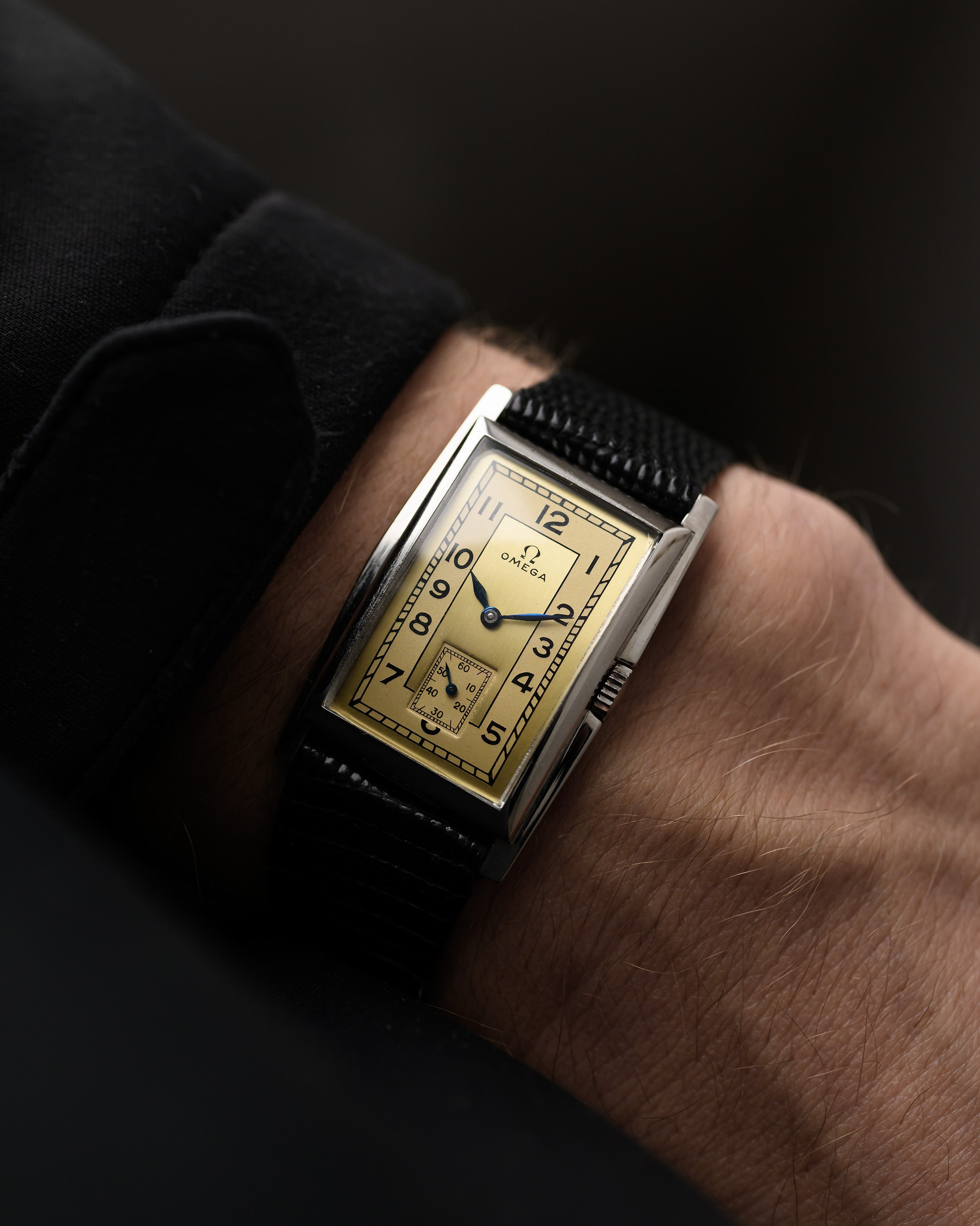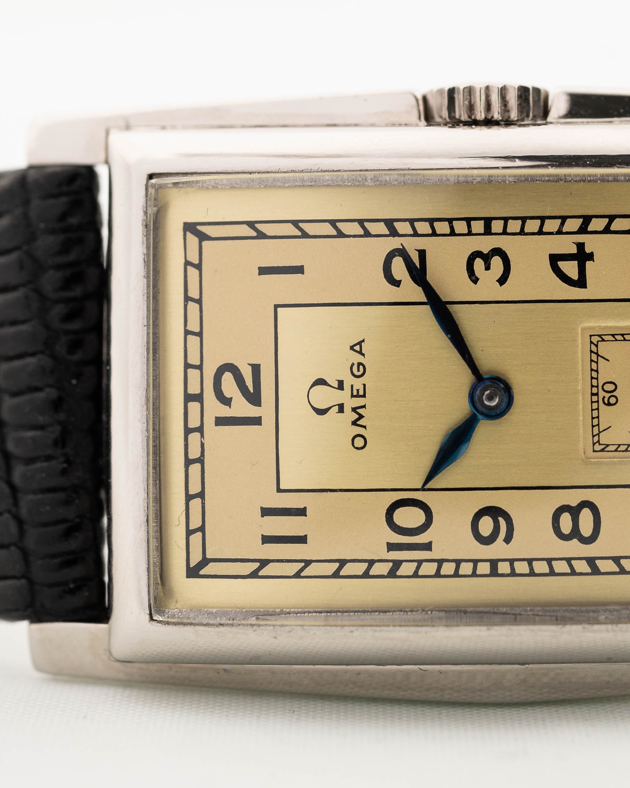 No es el primer reloj de vestir Omega Art Déco del que nos enamoramos. Este ejemplar cuenta con una enorme caja rectangular de acero y resulta aún más atractivo por su preciosa esfera de color ligeramente dorado con números árabes Art Déco, segundero subsidiario y un maravilloso y exclusivo segundero azul. Y la guinda del pastel es su estado ¡casi nos!