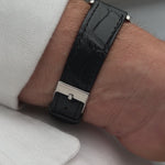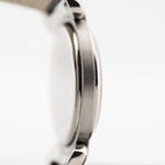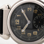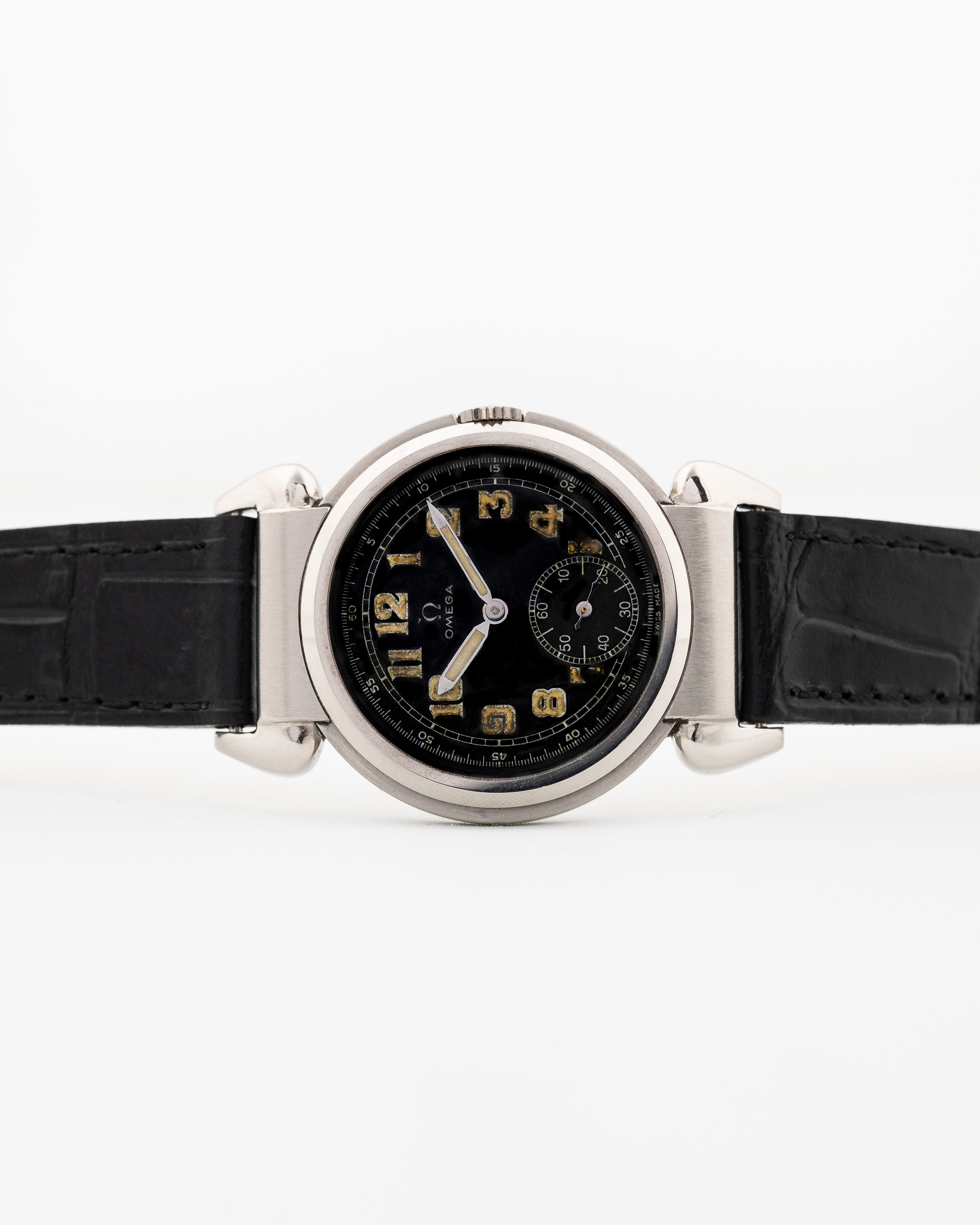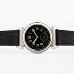 Esta belleza presenta un gran diseño de caja con una fantástica esfera negra mate de 1935. Debido al enorme diámetro de 49 mm de orejeta a orejeta se lleva más bien como una pieza de 37/38 mm.
