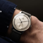 Este ejemplar no sólo es atractivo, sino también sustancial. Equipado con una caja de acero de 35 mm, asas atrevidas, y con una preciosa esfera bicolor blanca/gris con un enorme segundero secundario, realmente no se puede superar a este reloj.