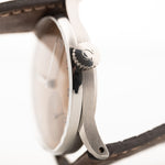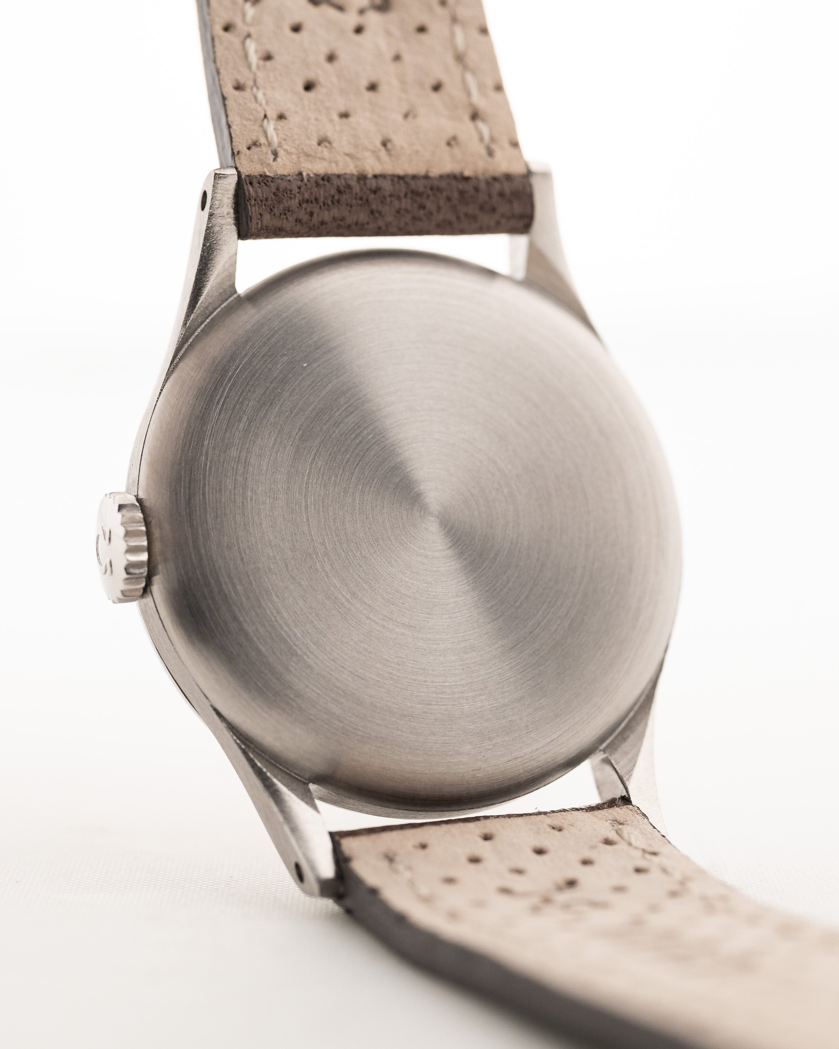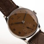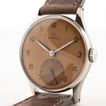 Aquí puede ver un fascinante reloj de vestir fabricado por Omega en 1947. Presenta una caja de acero inoxidable de 33 mm con asas angulares finas y sencillas y una impresionante esfera capuchina en perfecto estado y agujas de hoja de acero inoxidable, una pieza que le dejará sin aliento.