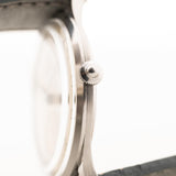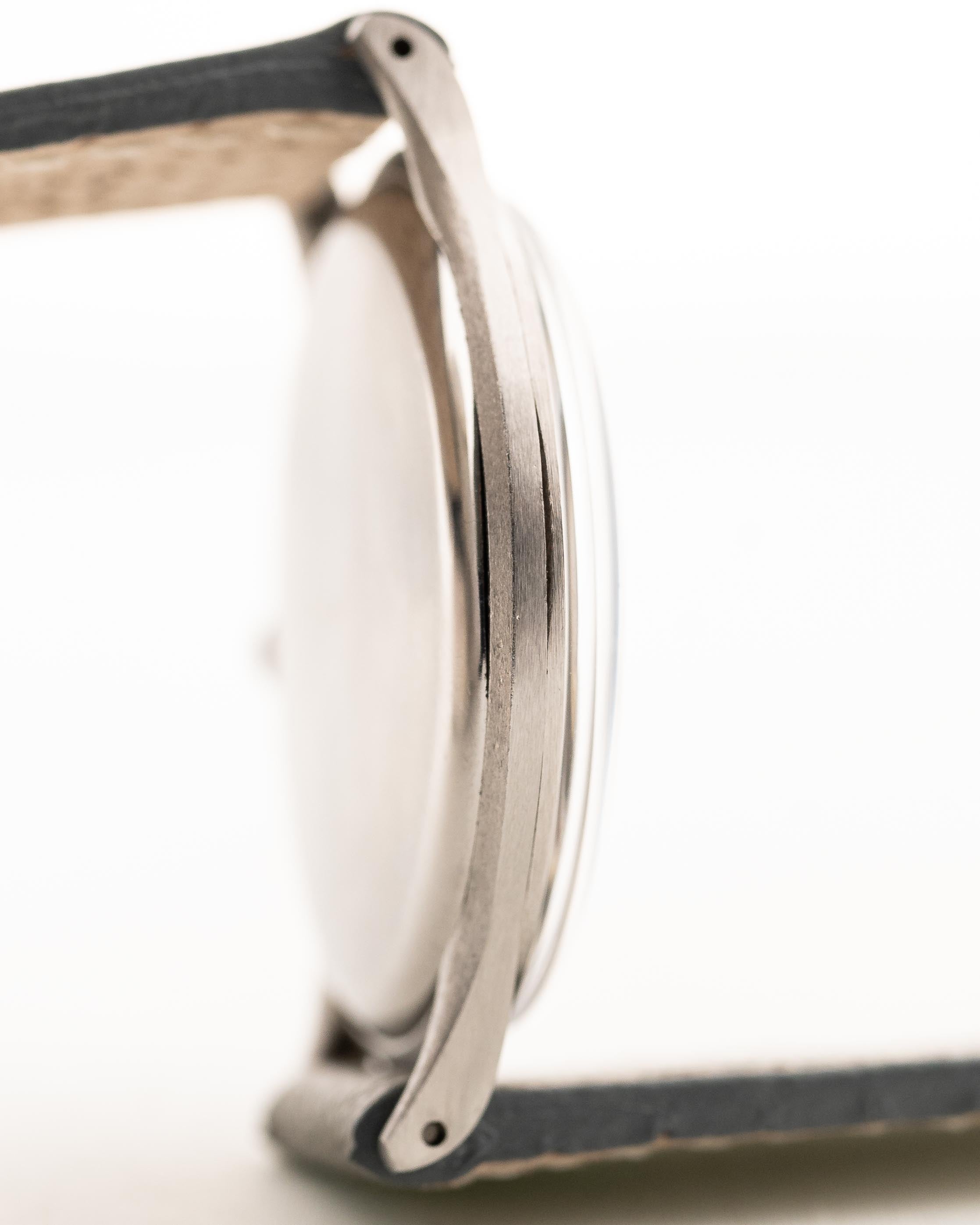 Esta belleza con una afilada caja de acero inoxidable y las asas ligeramente torneadas hacia abajo es aún más rara por el logotipo de Omega con la inscripción "Fab. Suisse" escrito debajo.