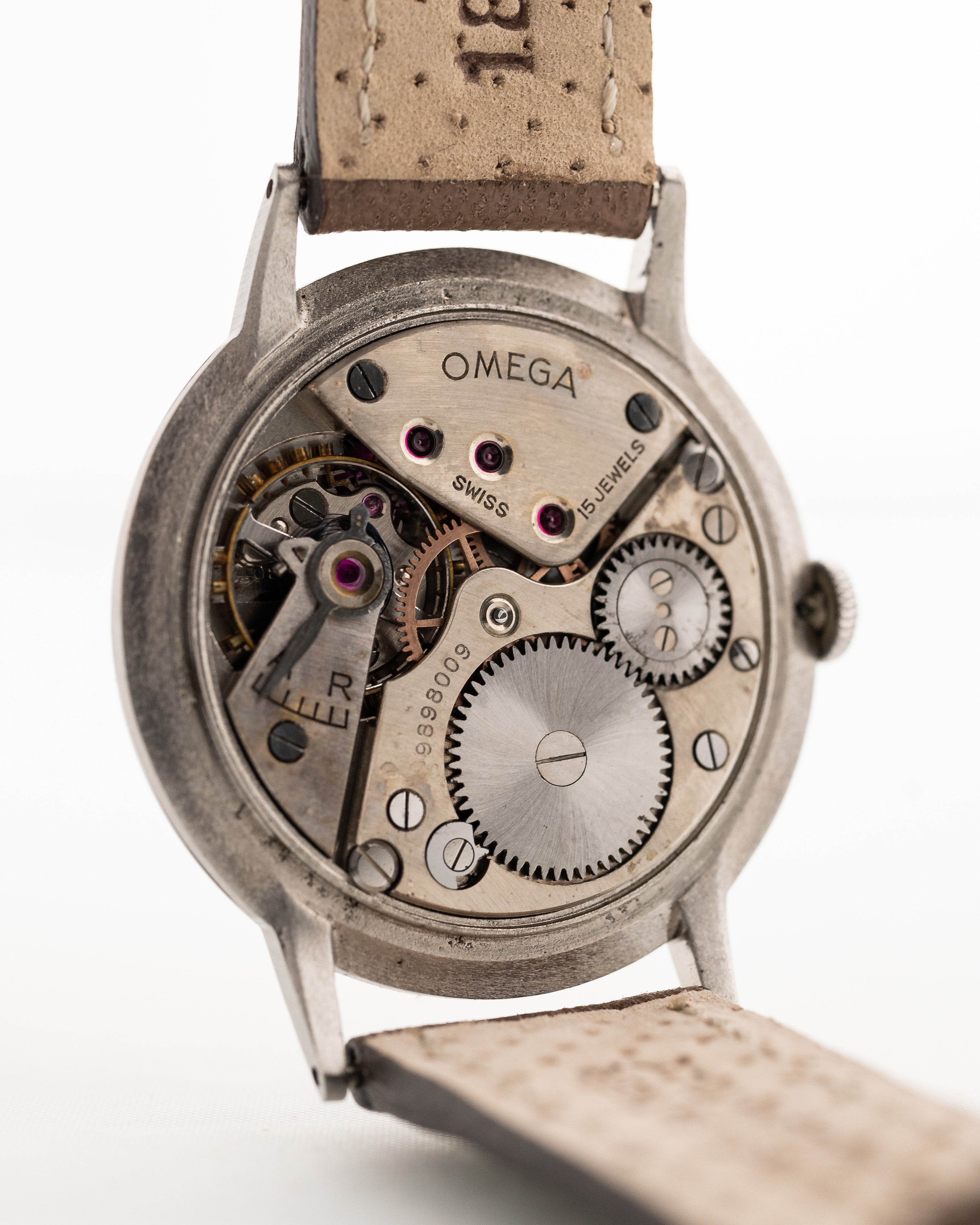 La década de 1940 fue una buena época para Omega, como ejemplifica este hermoso reloj de vestir. Este ejemplar no sólo es bonito, sino también sustancial. Equipado con una enorme caja de acero de 37 mm, asas curvadas hacia abajo y con una preciosa esfera bicolor ligeramente crema, realmente no hay nada mejor que este reloj.