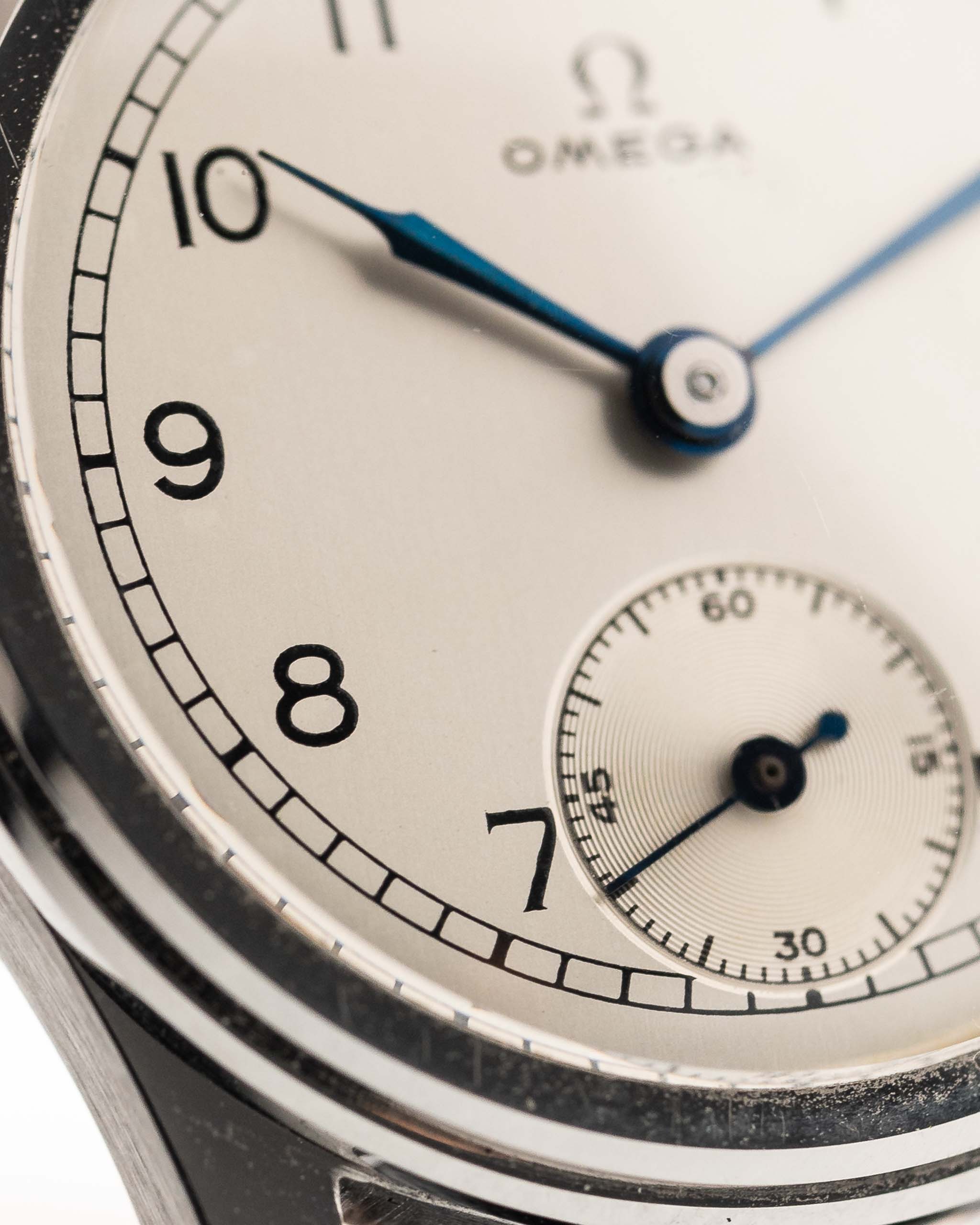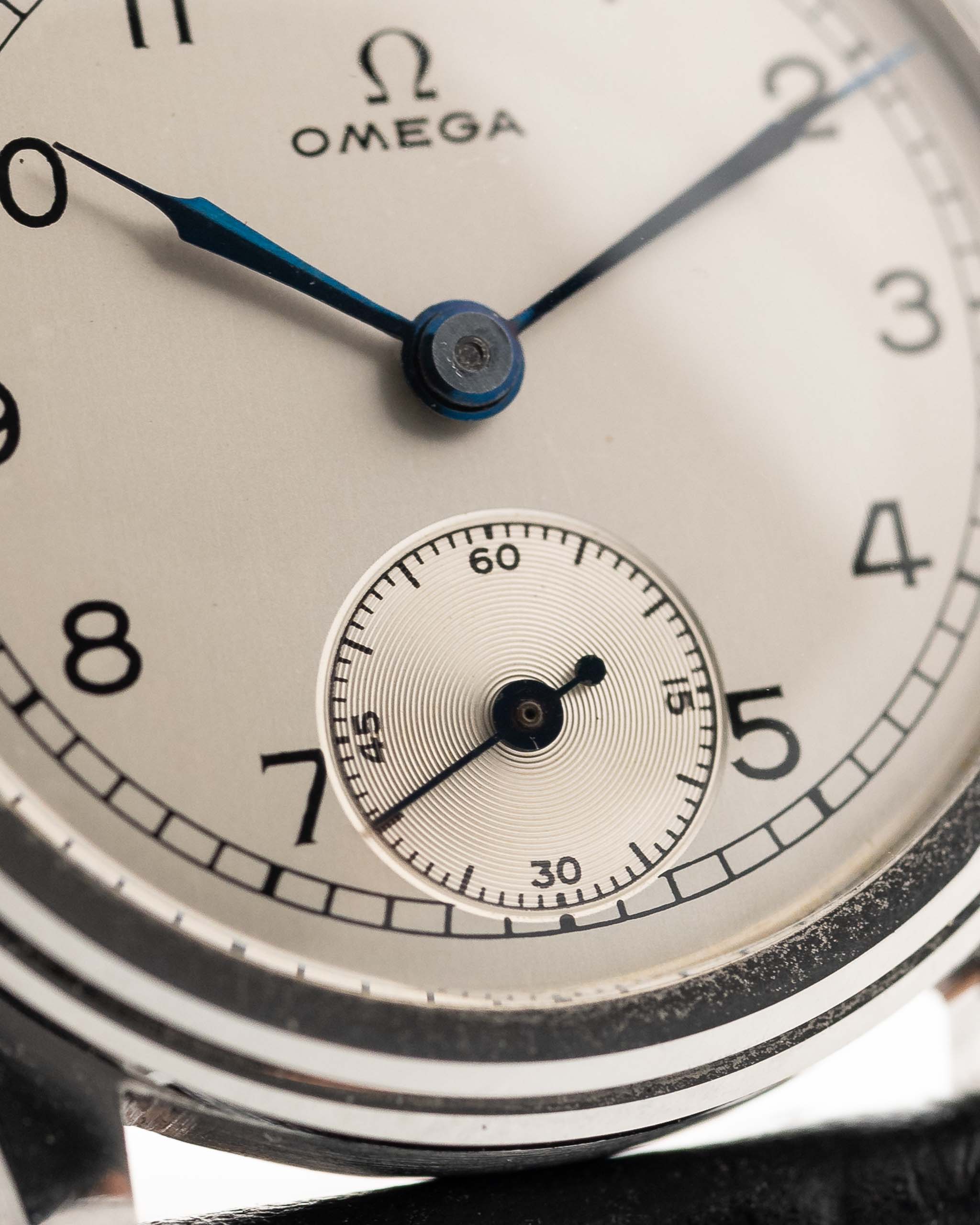 Otro raro hallazgo de Omega de los años 30 en un estado increíble. Esfera plateada limpia, números arábigos, agujas de jeringa de acero azulado y sub segundero a las seis - una composición de elegancia.