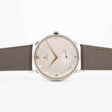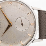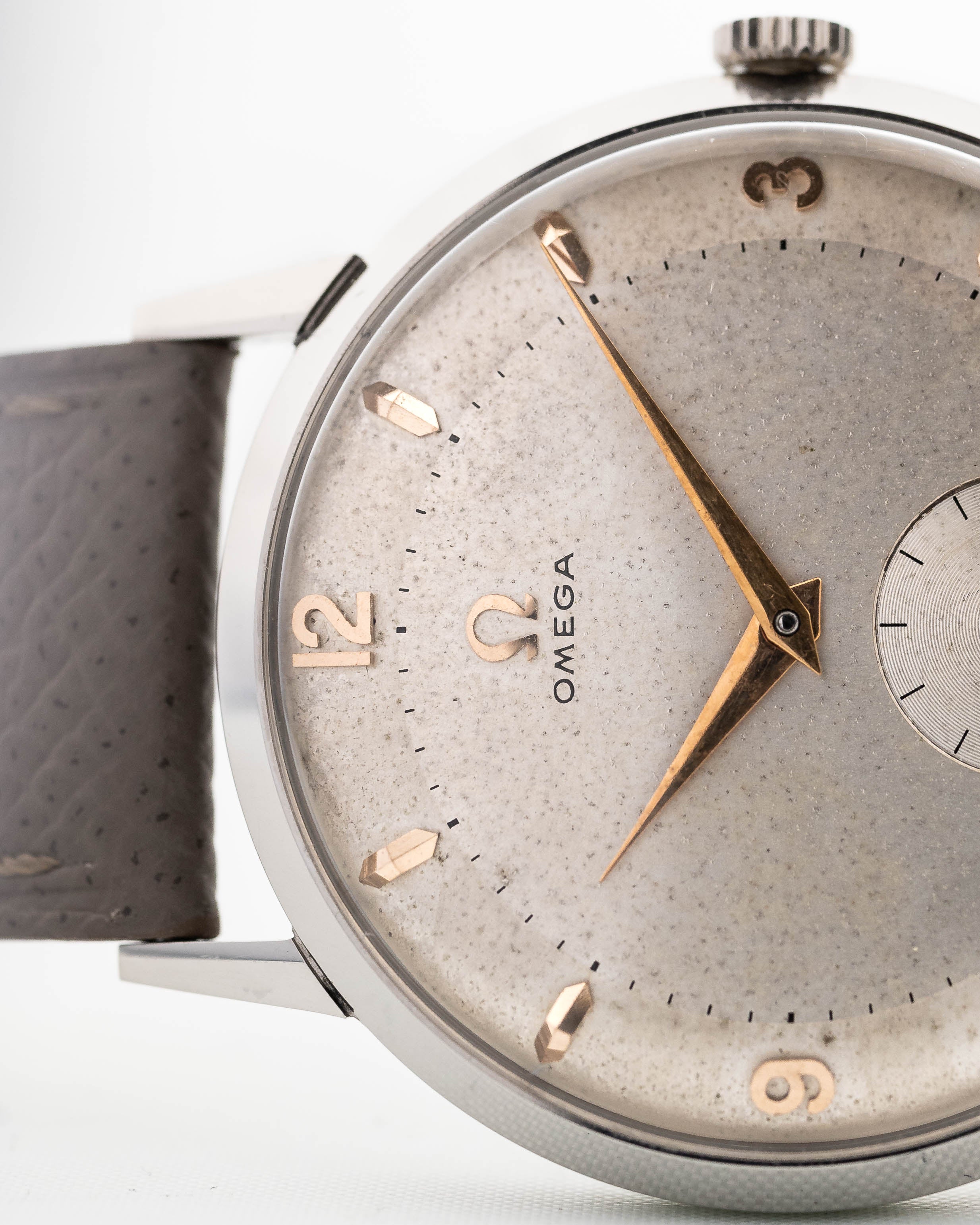 Aquí puede ver un fascinante reloj de vestir fabricado por Omega en 1954. Presenta una enorme caja Jumbo de acero inoxidable de 37,5 mm con asas en ángulo de gran belleza, una esfera bicolor blanca/plateada y marcadores horarios y agujas de oro amarillo de formas asombrosas.