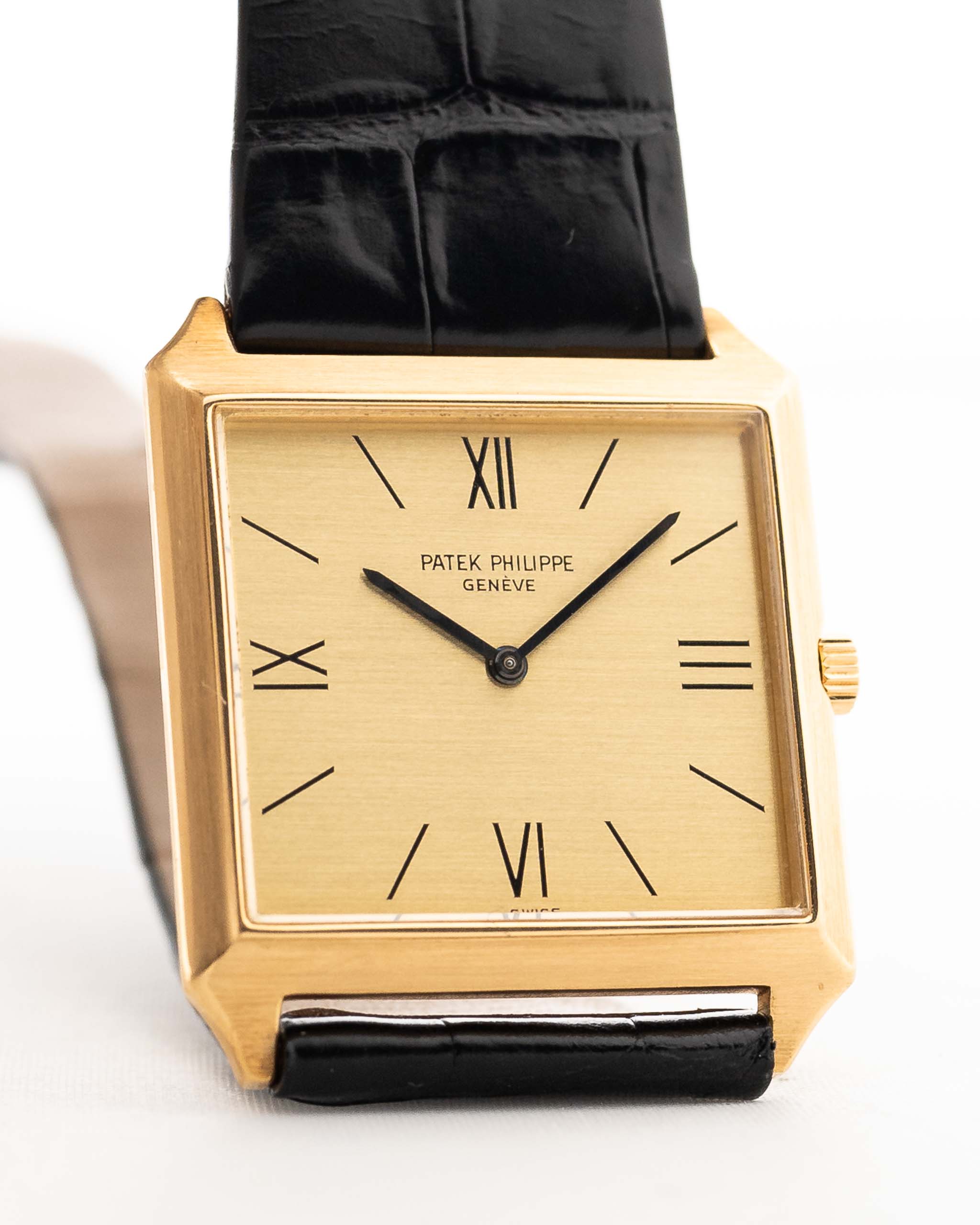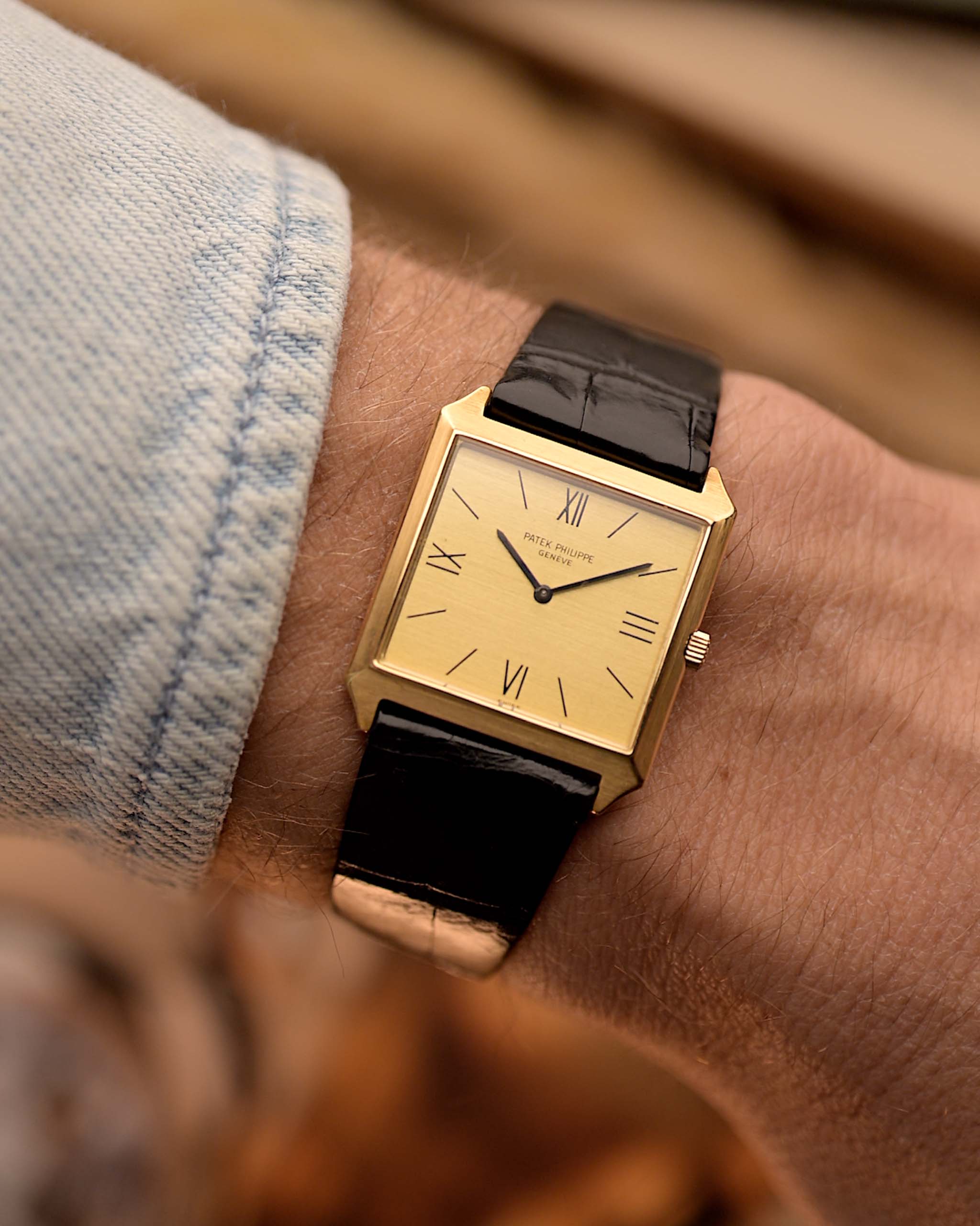El Patek Philippe Ref. 3526 no es un reloj que se encuentre a menudo. Su llamativa forma rectangular-casi cuadrada está tallada en oro amarillo macizo de 18 quilates y encarna el espíritu de la colección Gondolo: geometría elegante, proporciones clásicas y lujo discreto.