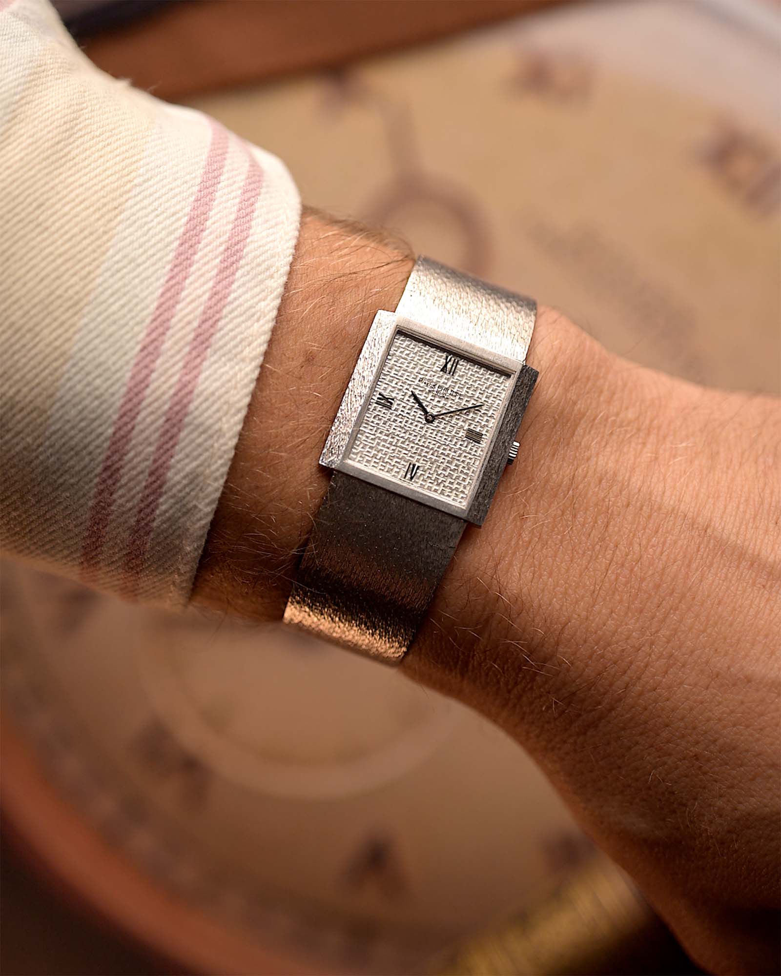 El Patek Philippe Gondolo Ref. 3572 es el lujo de los años 70 visualizado en un reloj. Elaborada íntegramente en oro blanco de 18 quilates, esta pieza combina el minimalismo con el buen arte, desde la caja cuadrada sin asas hasta la esfera de oro martillado, increíblemente rara.
