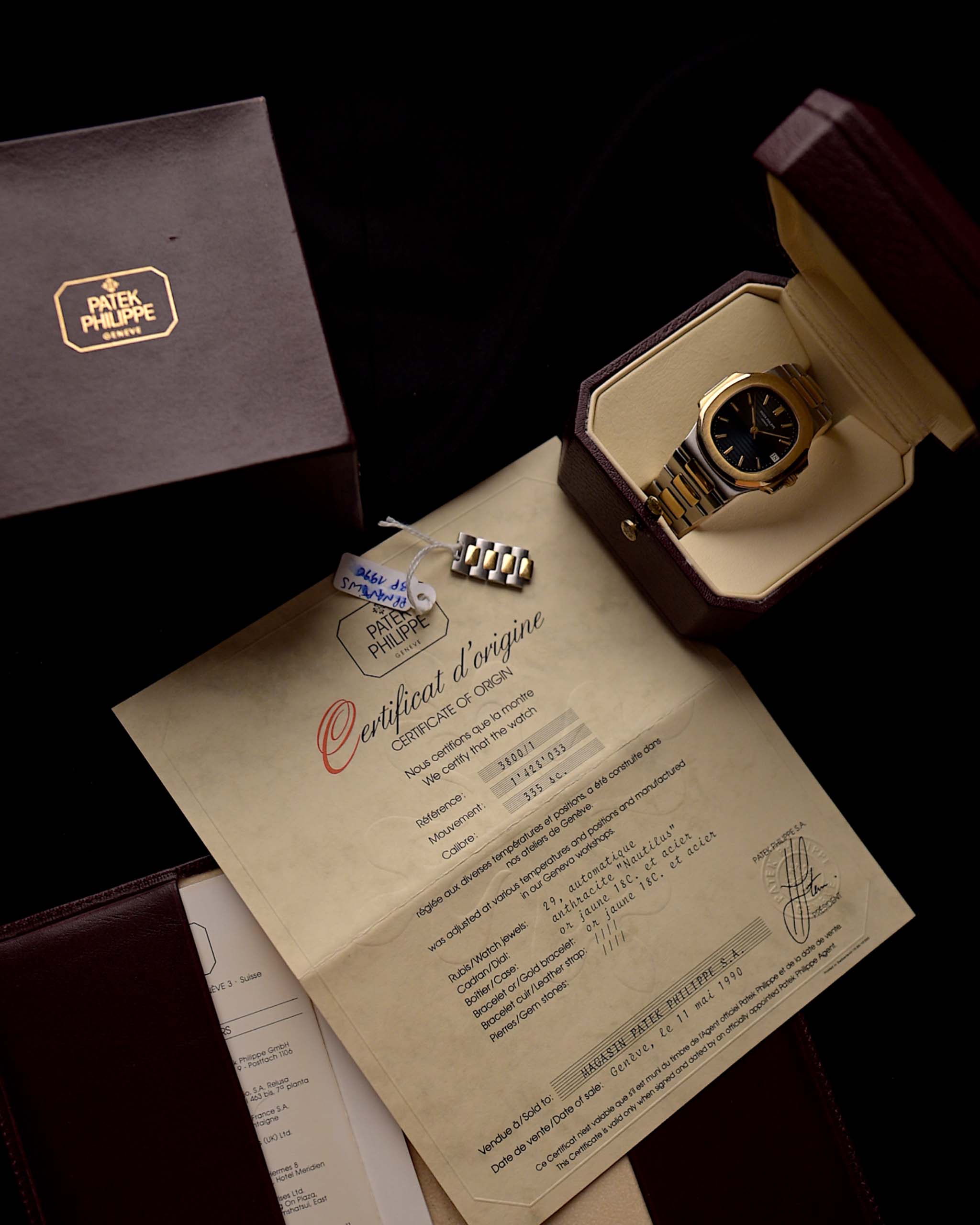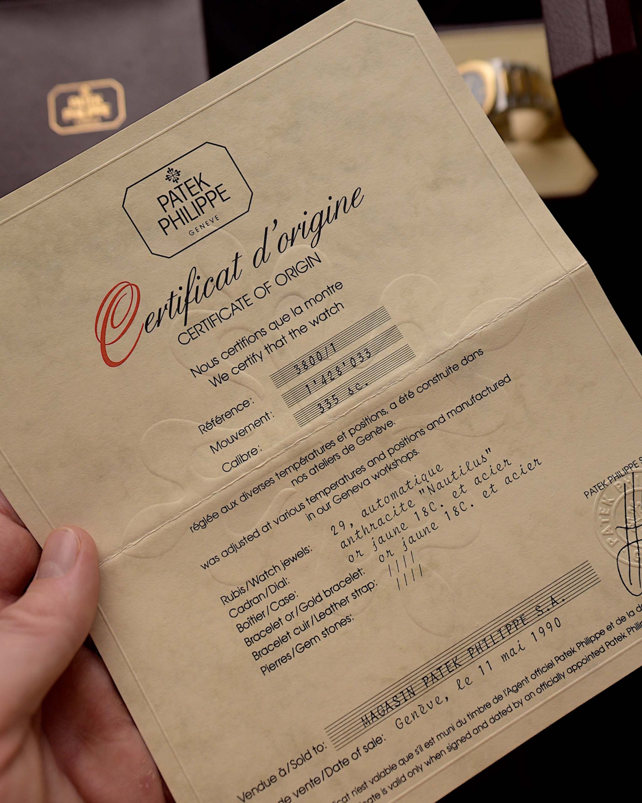 La mejor parte de esta pieza en particular que viene en un juego completo con el certificado original de Patek Philippe y la caja del primer propietario que compró en mayo de 1990.
