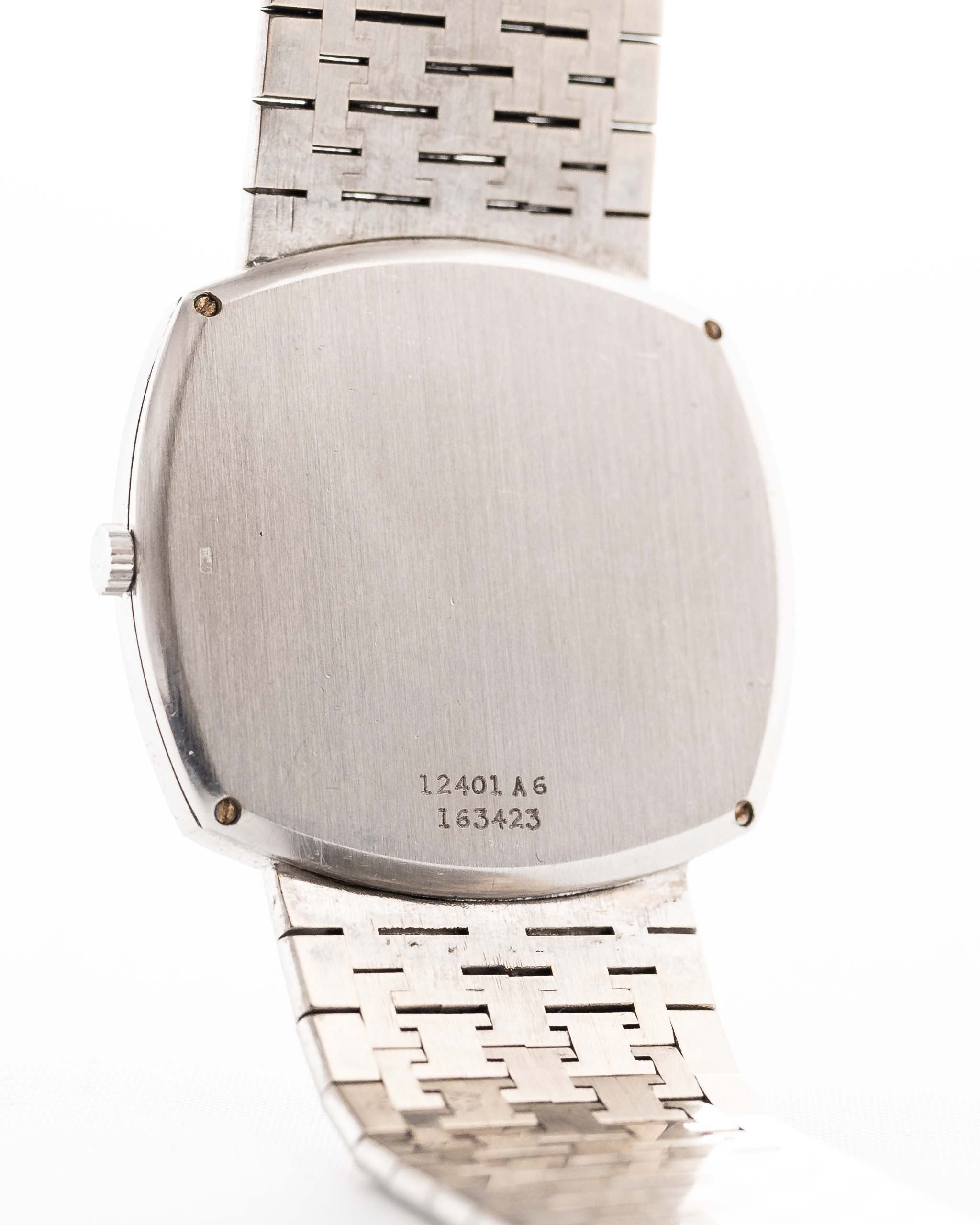 Presentado en un estado casi impecable, cuenta con una espectacular pulsera integrada de oro blanco de 18 quilates y una esfera martillada de oro blanco sin defectos. La distintiva caja con forma de televisor y acabado rugoso en todo el bisel, la esfera y la pulsera convierten este reloj en una auténtica obra de arte que se puede llevar puesta.