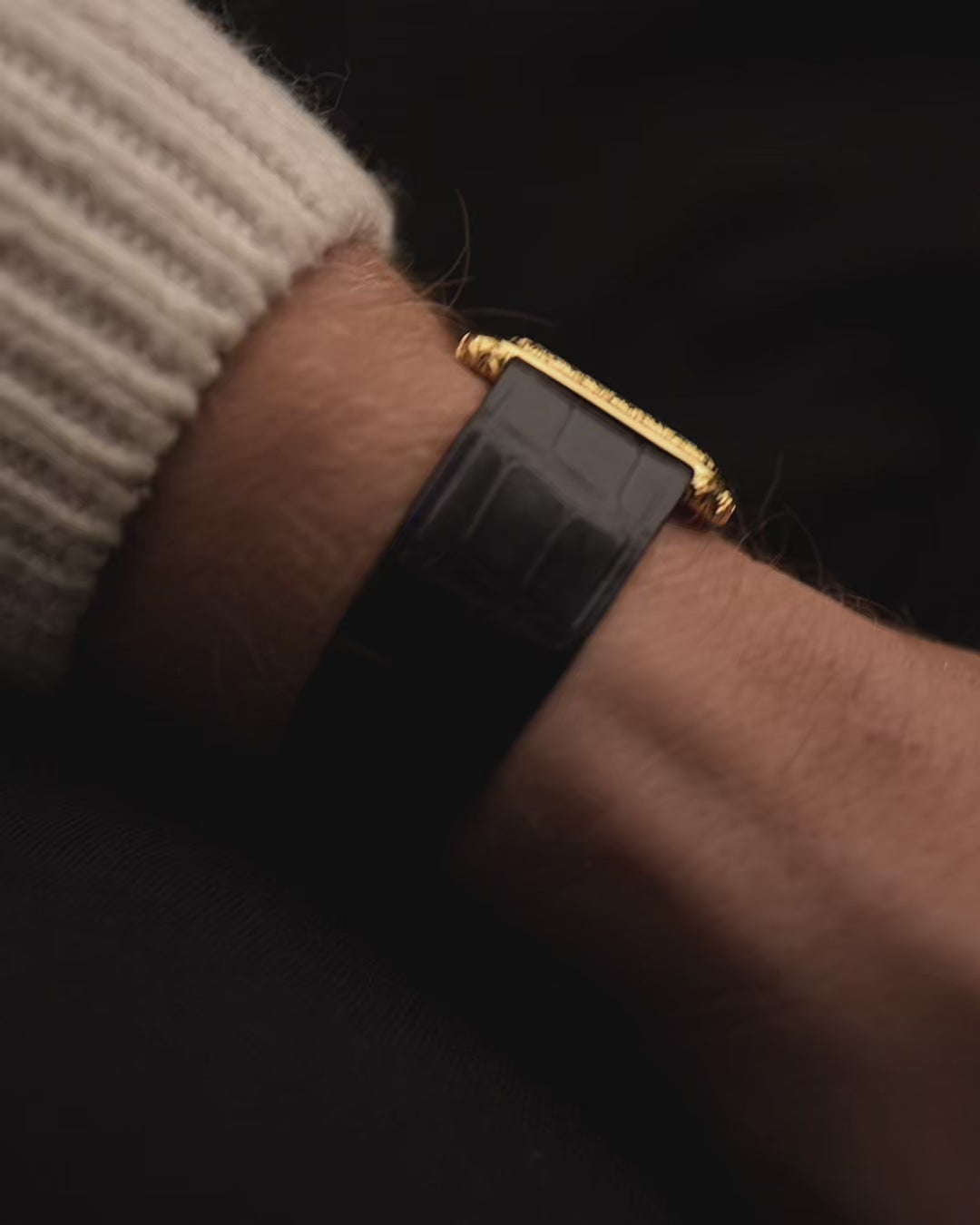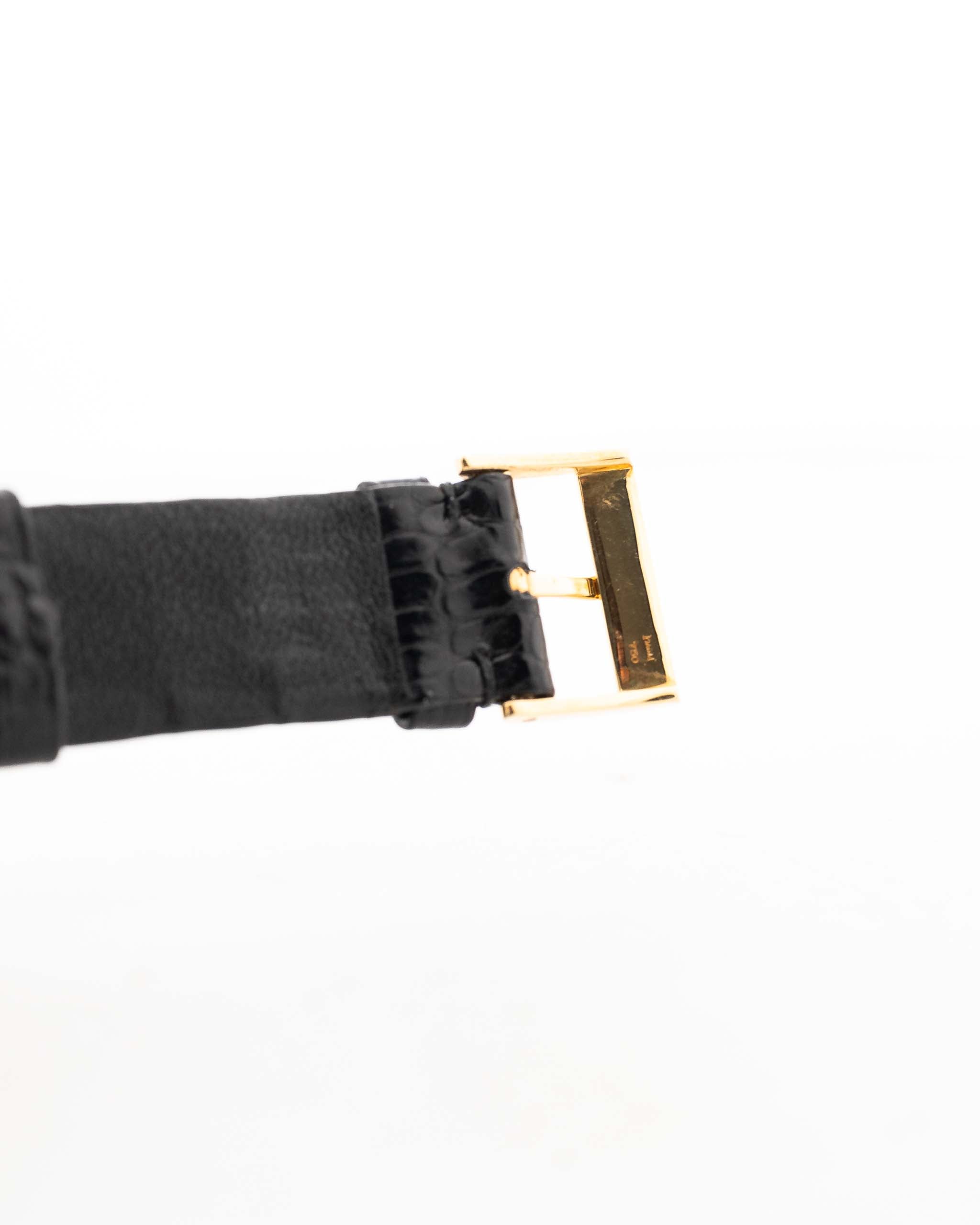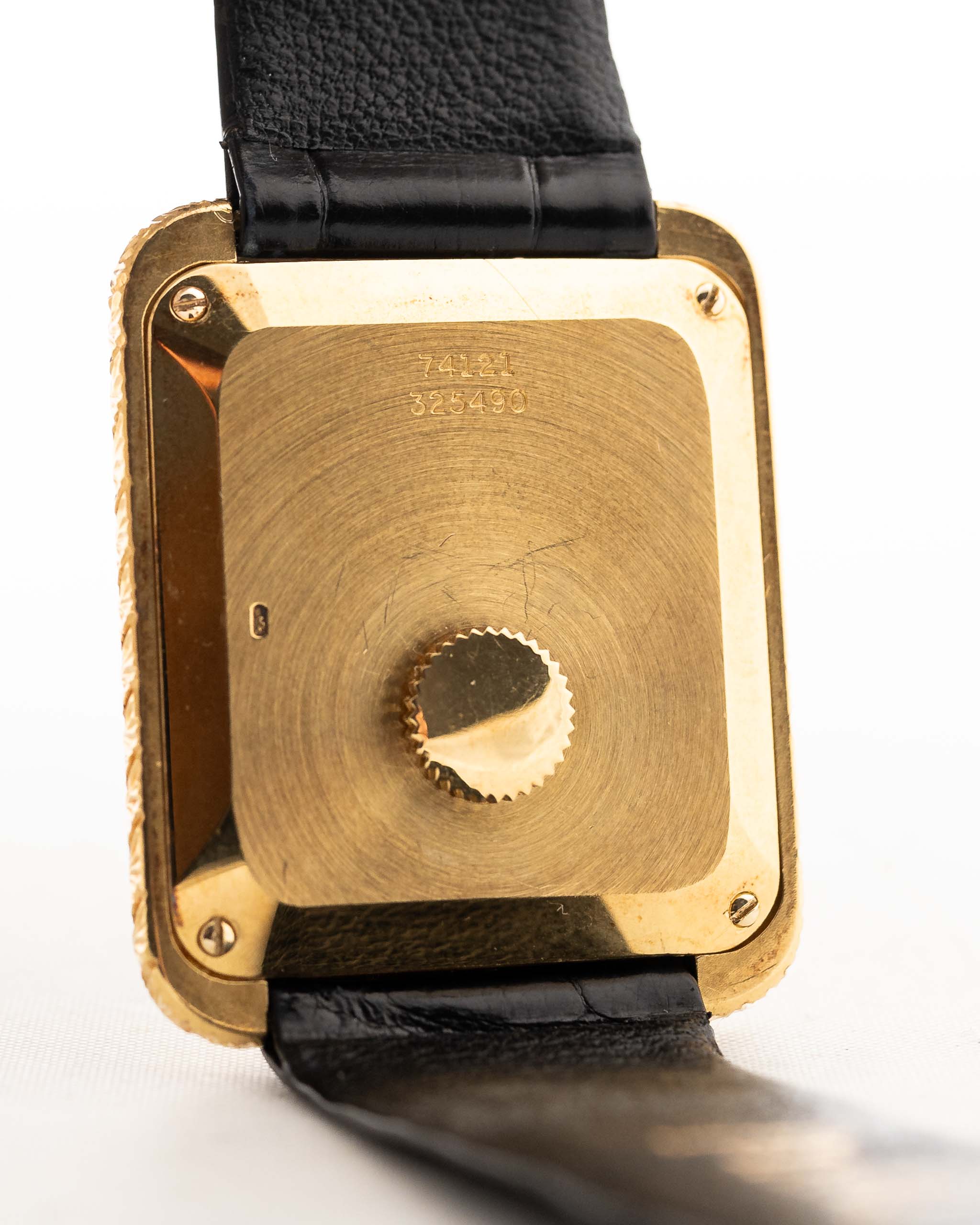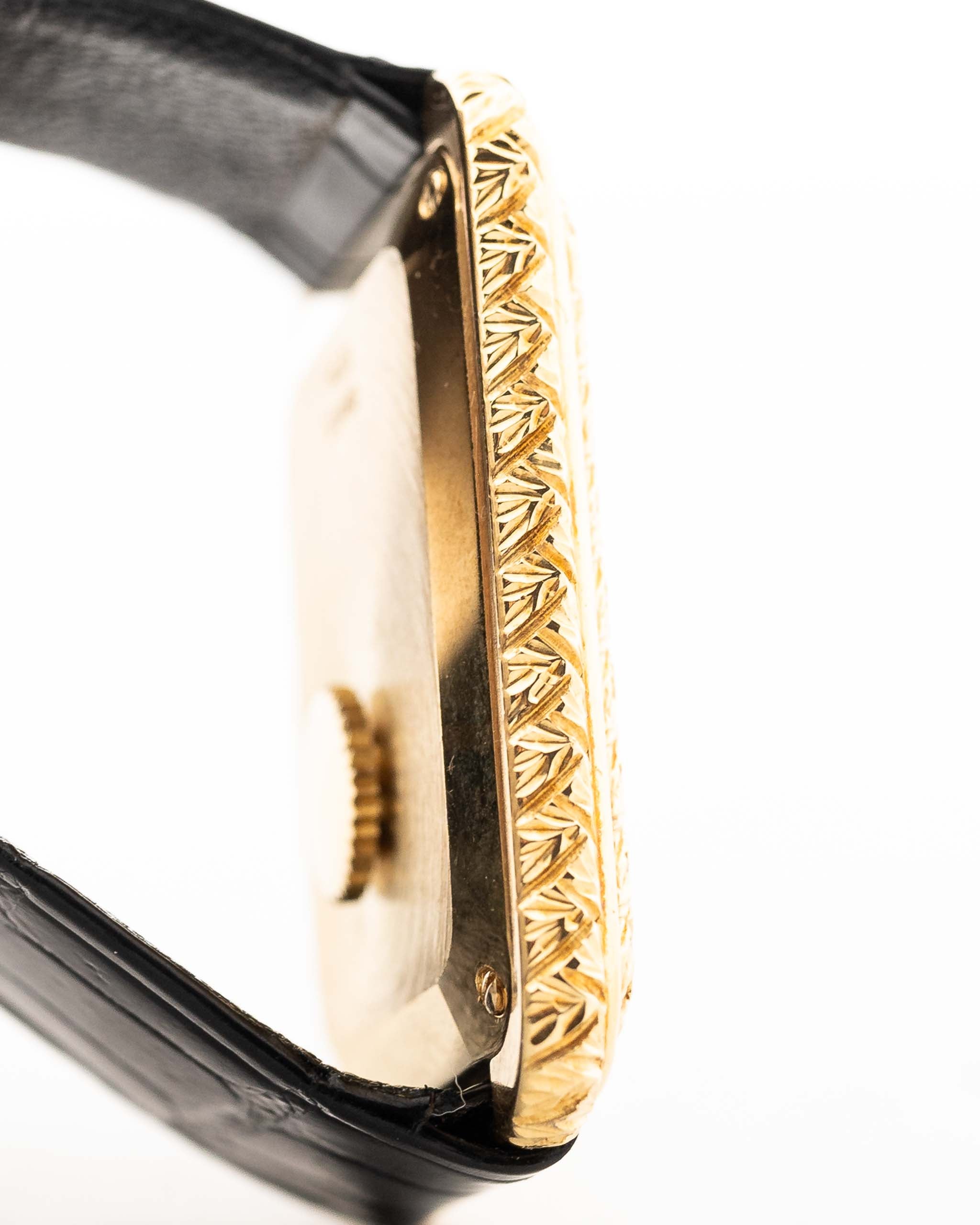Esbelta y refinada, esta caja rectangular se lleva con elegancia en la muñeca, mientras que las estrías naturales de la esfera garantizan que no haya dos ejemplares iguales. El reloj se conserva en magníficas condiciones y se combina con una correa de piel minimalista para un lujo discreto.