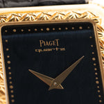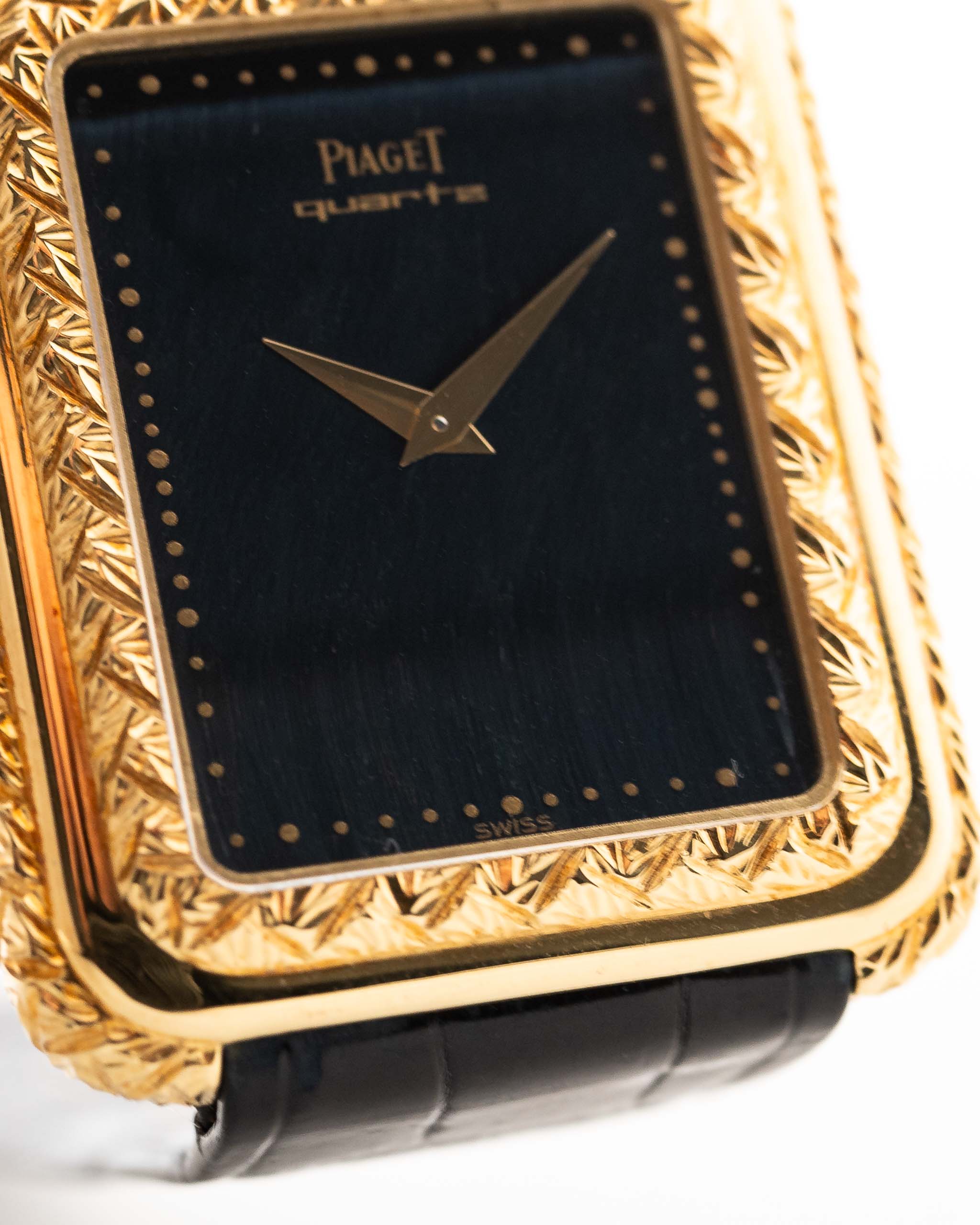 Reloj Piaget 74121 vintage, oro amarillo 18 quilates, esfera azul ojo de halcón, caja rectangular, movimiento de cuarzo, sobre fondo negro