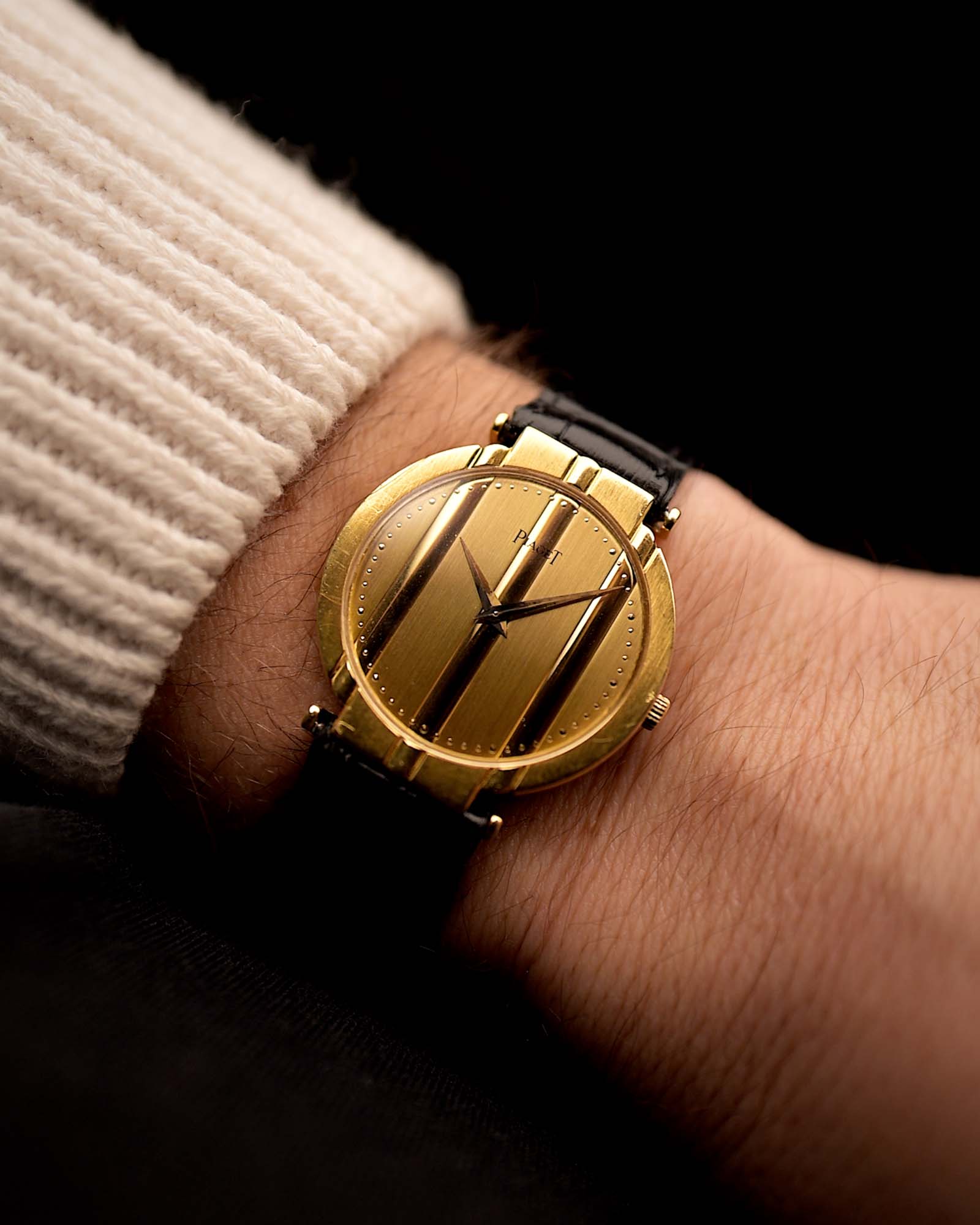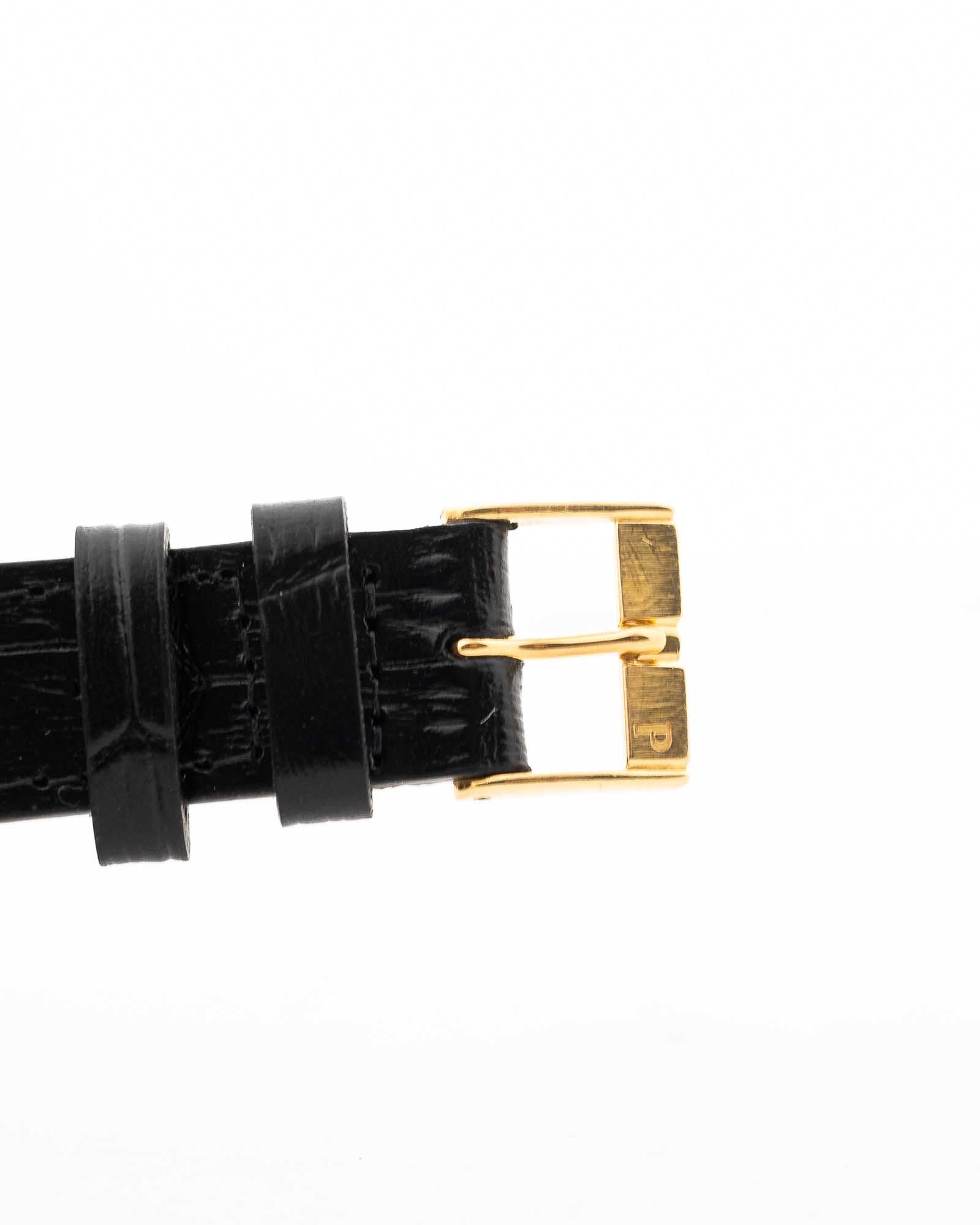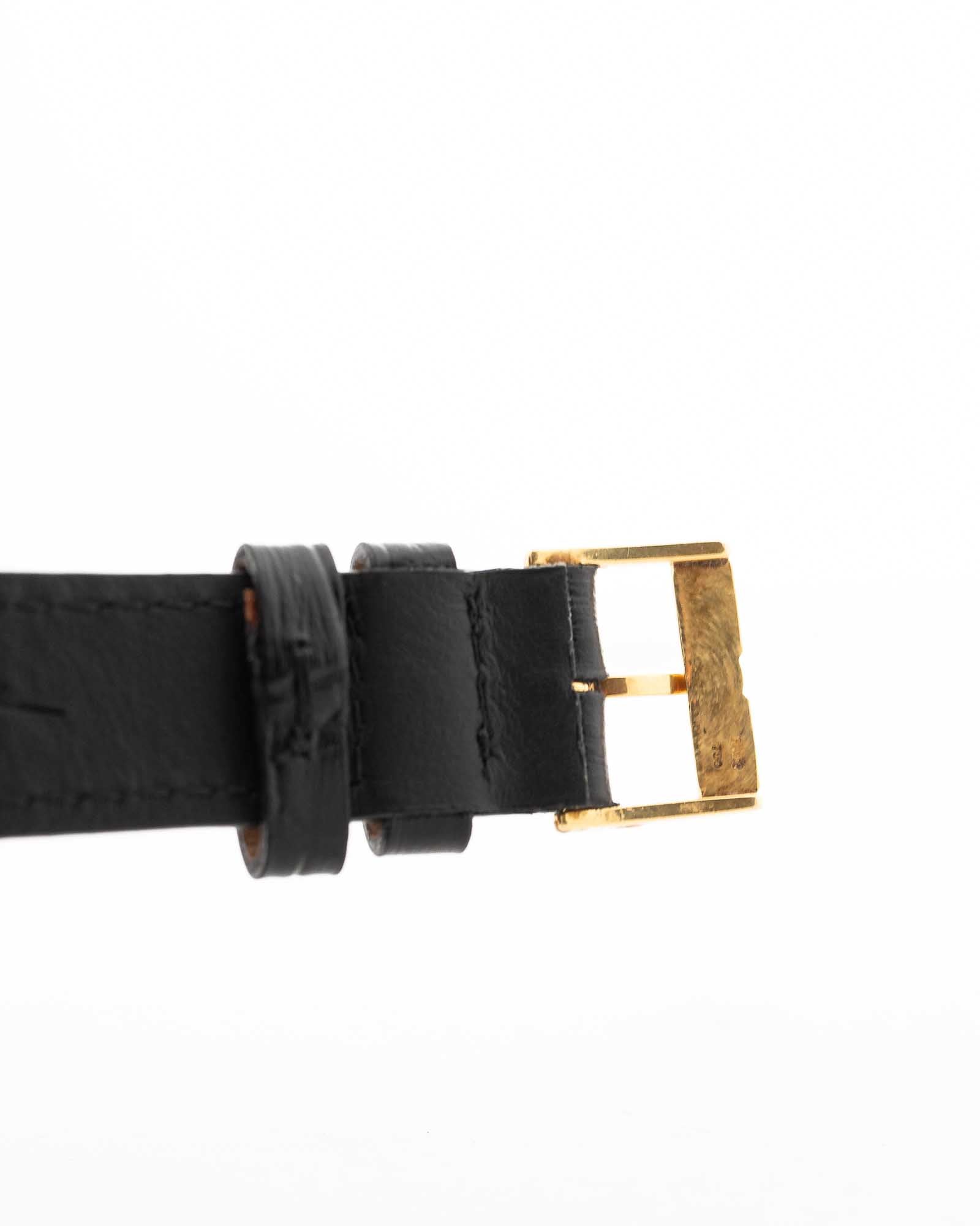 La impecable esfera de oro amarillo de 18 quilates mantiene la elegancia monocromática y depurada del modelo, realzada por las clásicas agujas Piaget y los detalles característicos de la marca. Delgada, sofisticada e inconfundiblemente Polo, esta pieza captura el glamour y la confianza de su época.