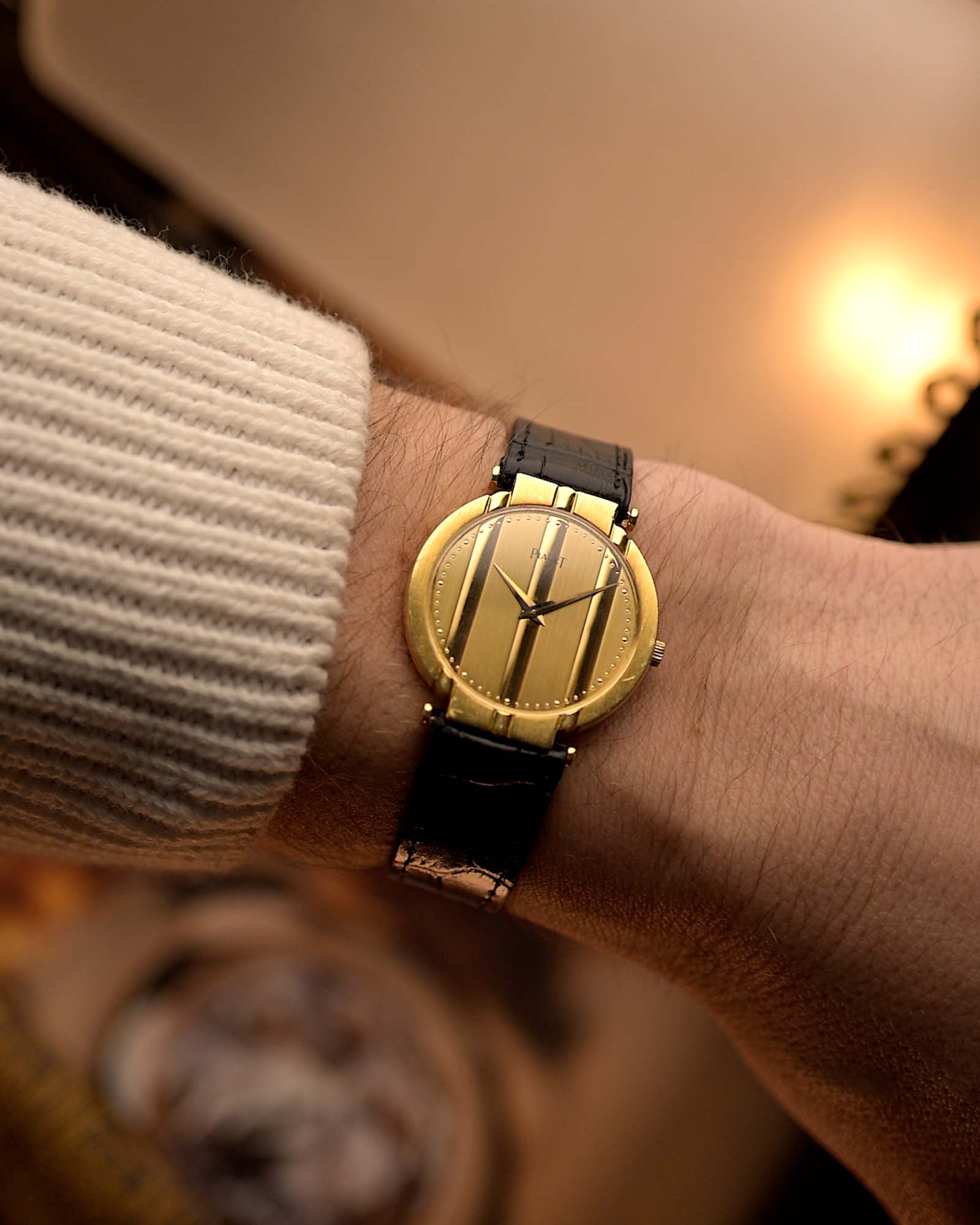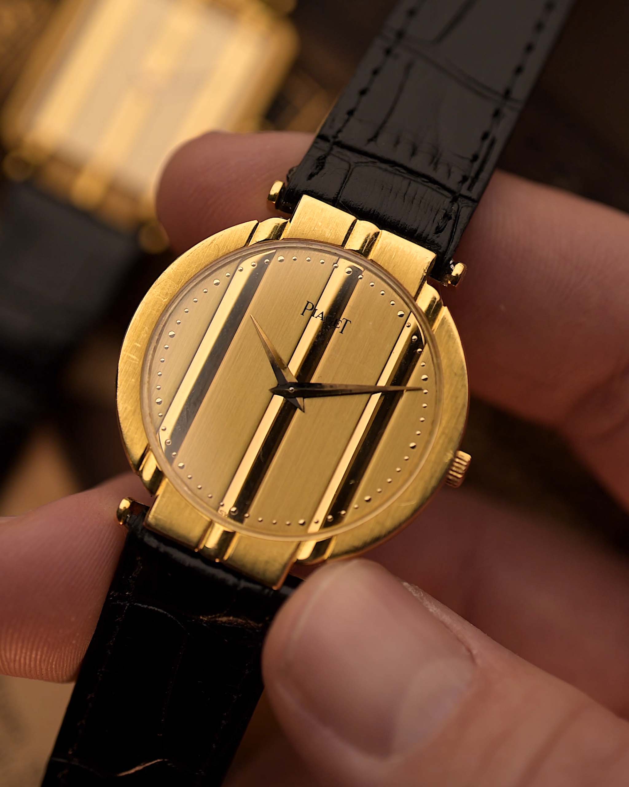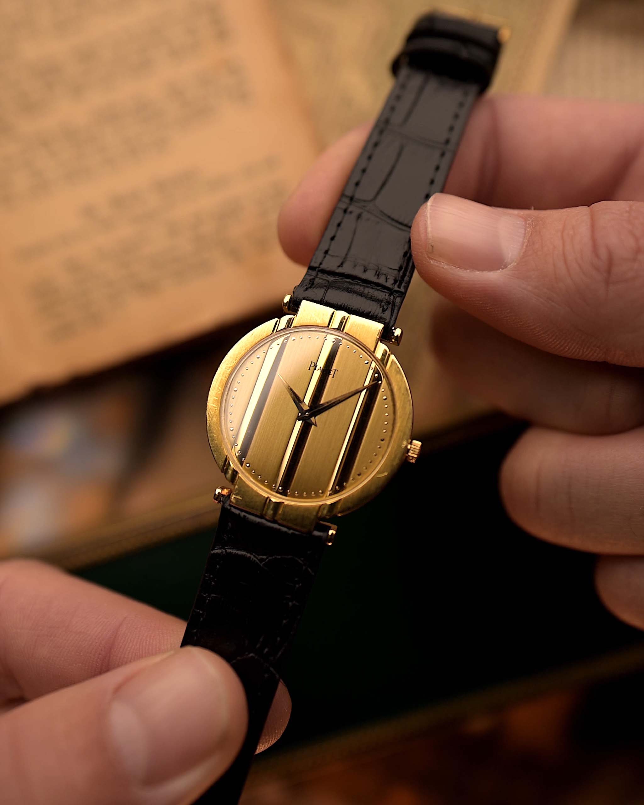 La impecable esfera de oro amarillo de 18 quilates mantiene la elegancia monocromática y depurada del modelo, realzada por las clásicas agujas Piaget y los detalles característicos de la marca. Delgada, sofisticada e inconfundiblemente Polo, esta pieza captura el glamour y la confianza de su época.
