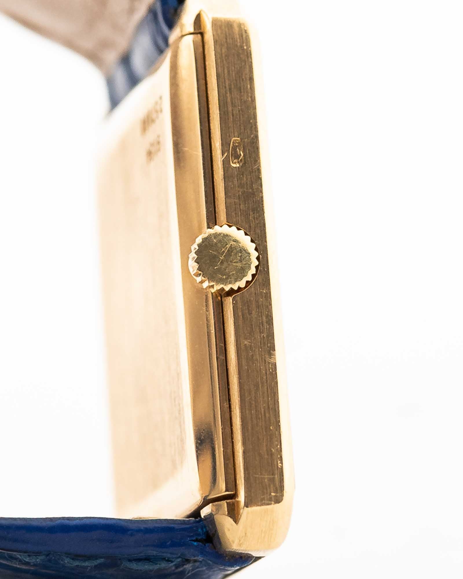 Pocos relojes encarnan la elegancia de los años 70 como este Piaget Ref. 9154, una elegante creación con forma de tanque, elaborada en oro amarillo macizo de 18 quilates y equipada con una esfera de lapislázuli natural que brilla con una profundidad en capas.