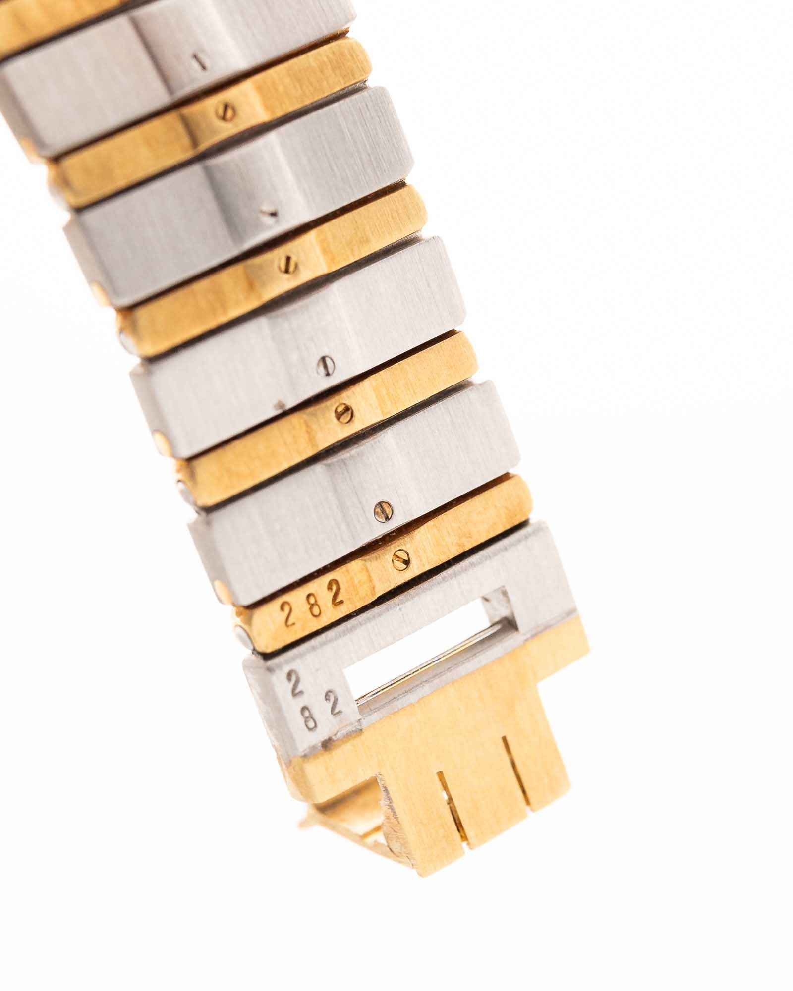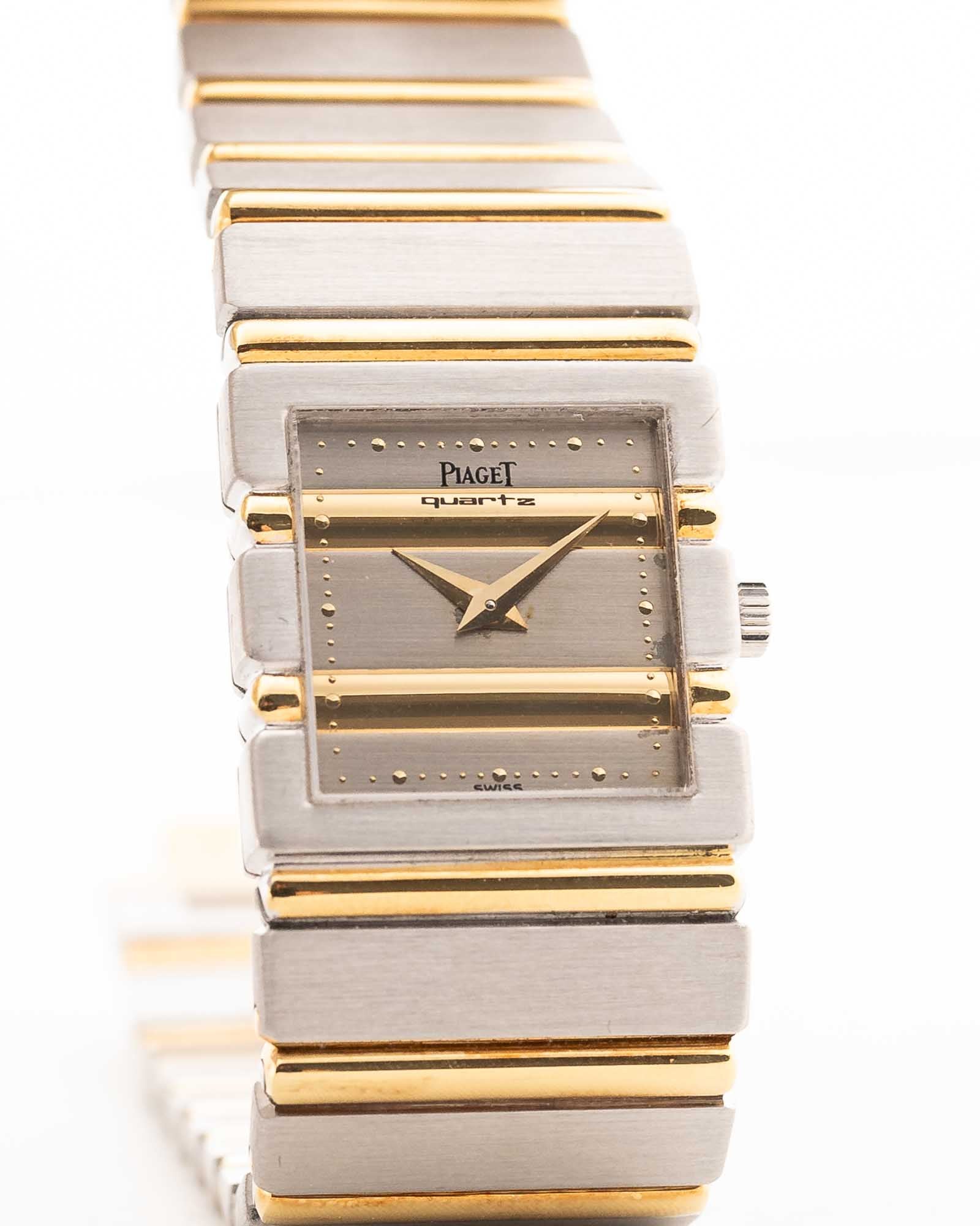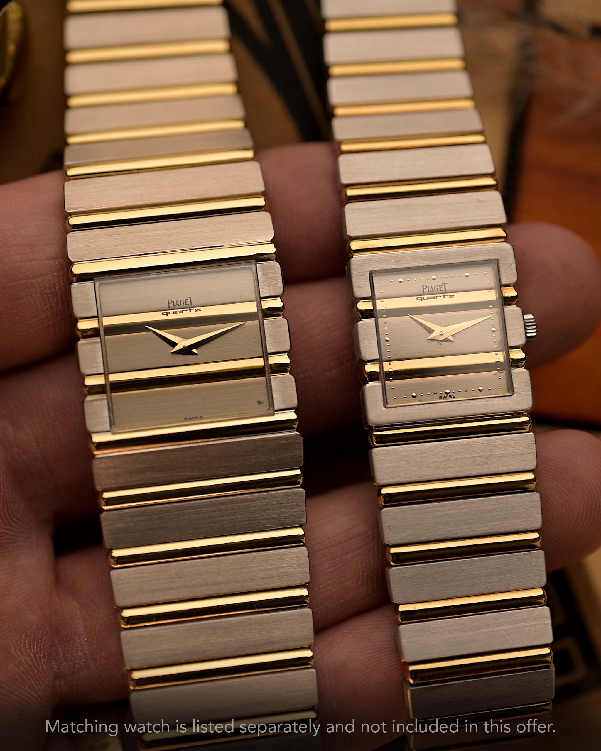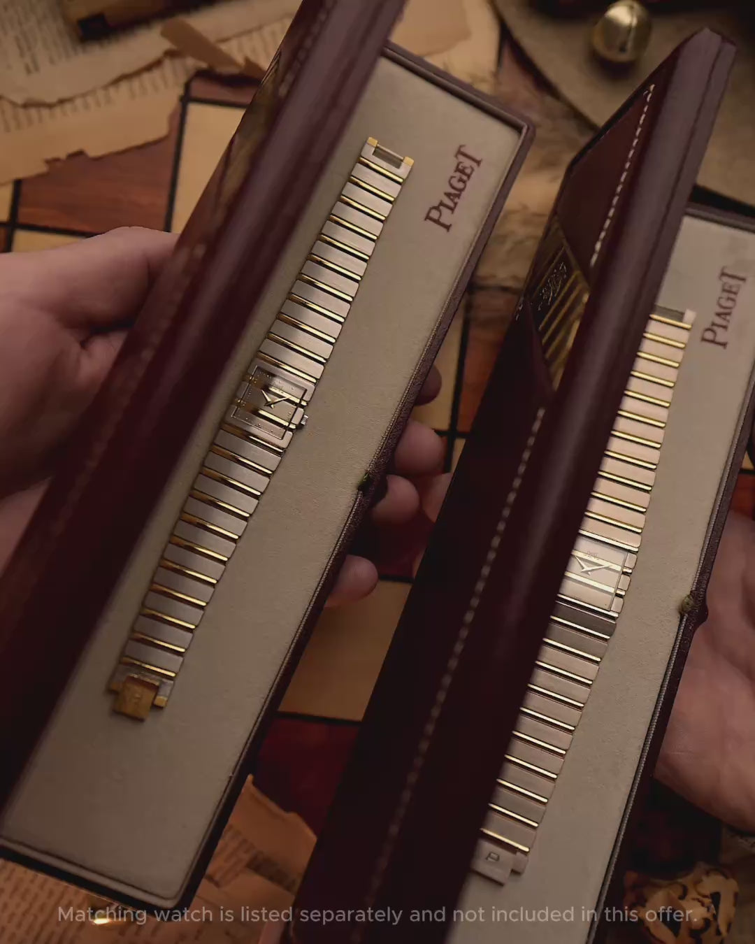 Su brazalete de oro sin soldaduras, integrado en la caja escultural, refleja el estilo característico de Piaget, que combina materiales preciosos con una ingeniería ultrafina. La elegante esfera, intacta y en perfecto estado, prescinde por completo de los números, dejando que el oro bicolor sea el protagonista absoluto.