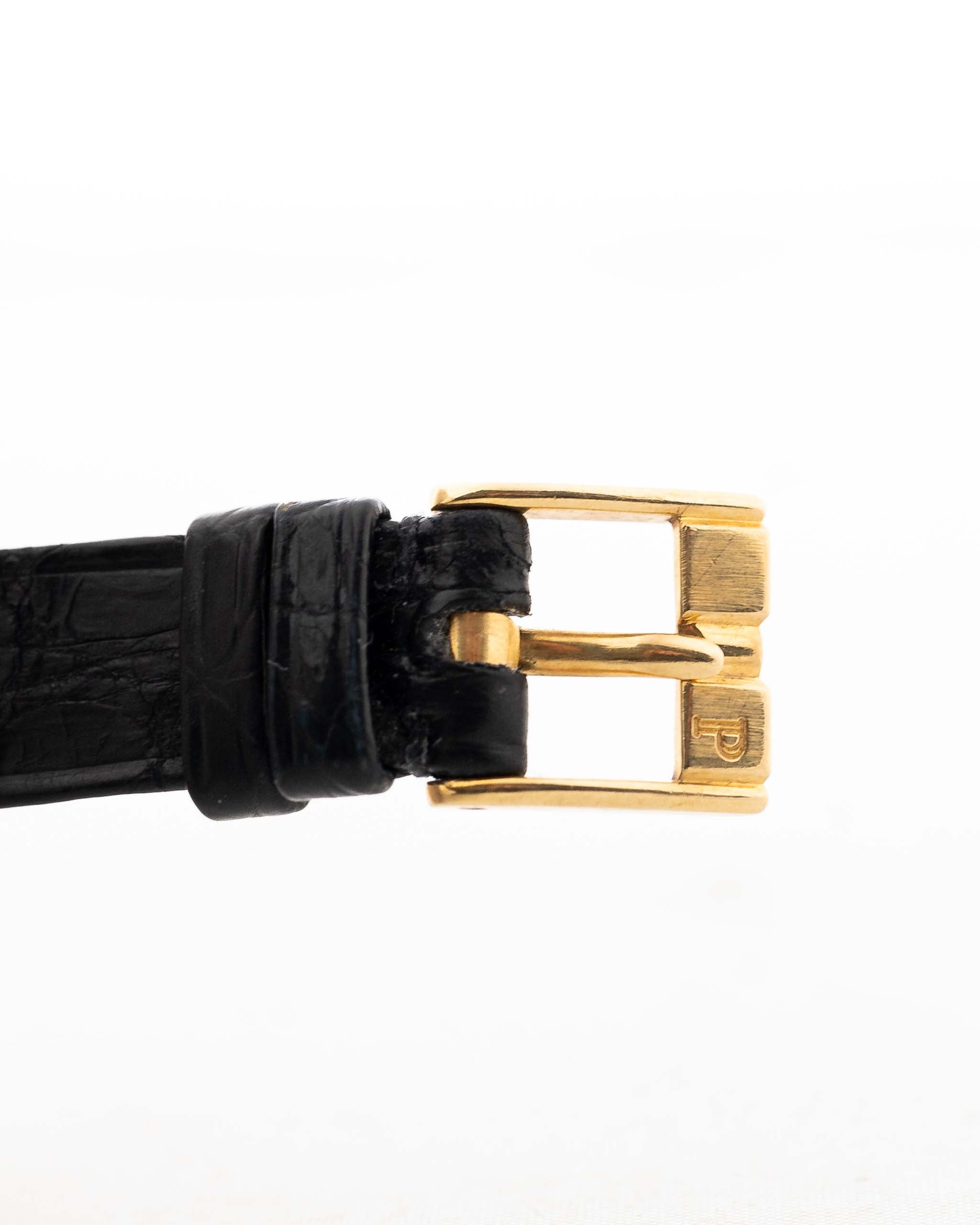 Foto de un Piaget Polo 8193 Rectangular vintage de los años 80 en muñeca. En oro amarillo de 18 quilates, 20 mm con movimiento de cuarzo, esfera dorada original, correa de piel original y cierre de oro de 18 quilates.