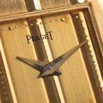 Foto de cerca de un Piaget Polo 8193 Rectangular vintage de los años 80 en una muñeca. En oro amarillo de 18 quilates, 20 mm con movimiento de cuarzo, esfera dorada original, correa de piel original y cierre de oro de 18 quilates.