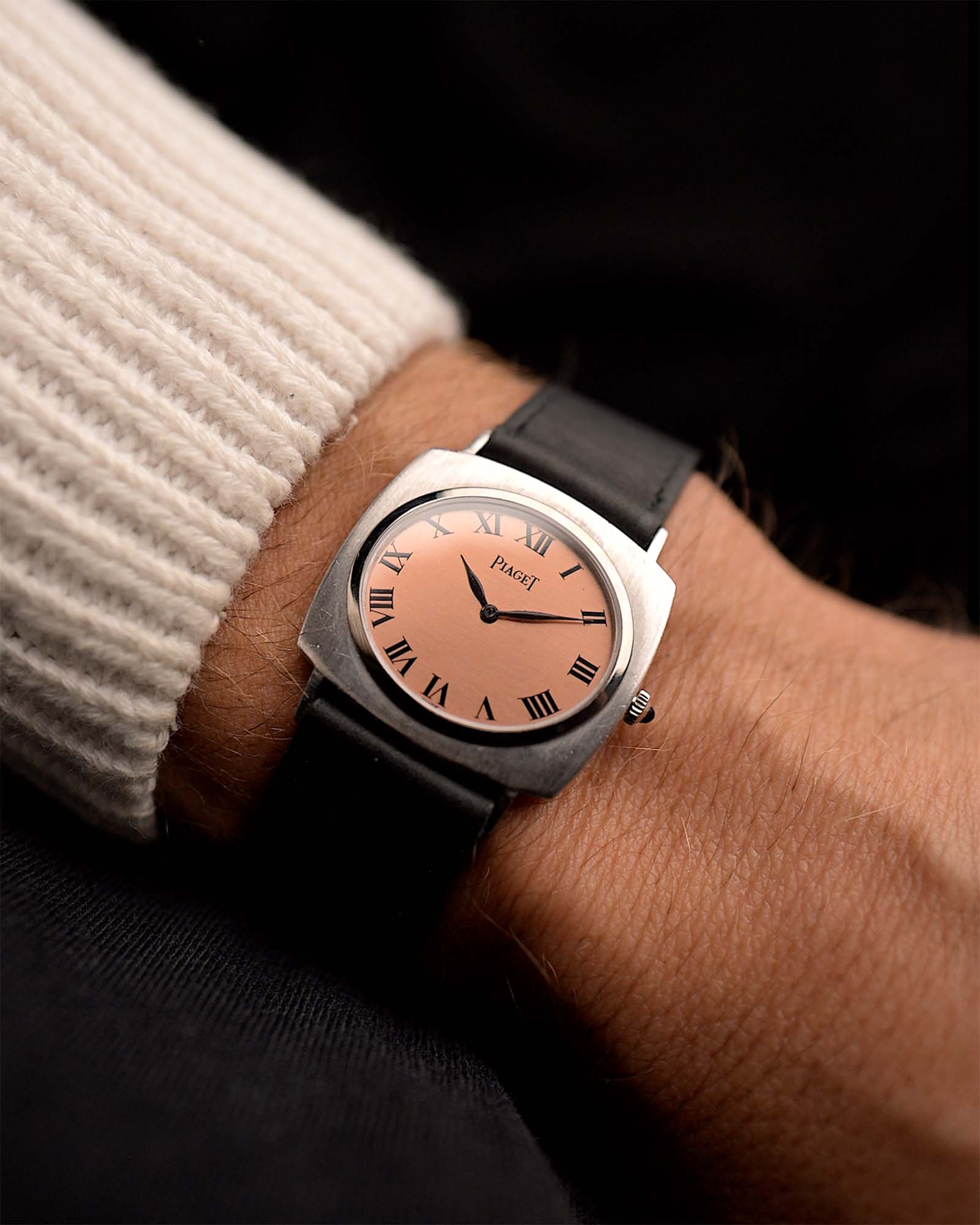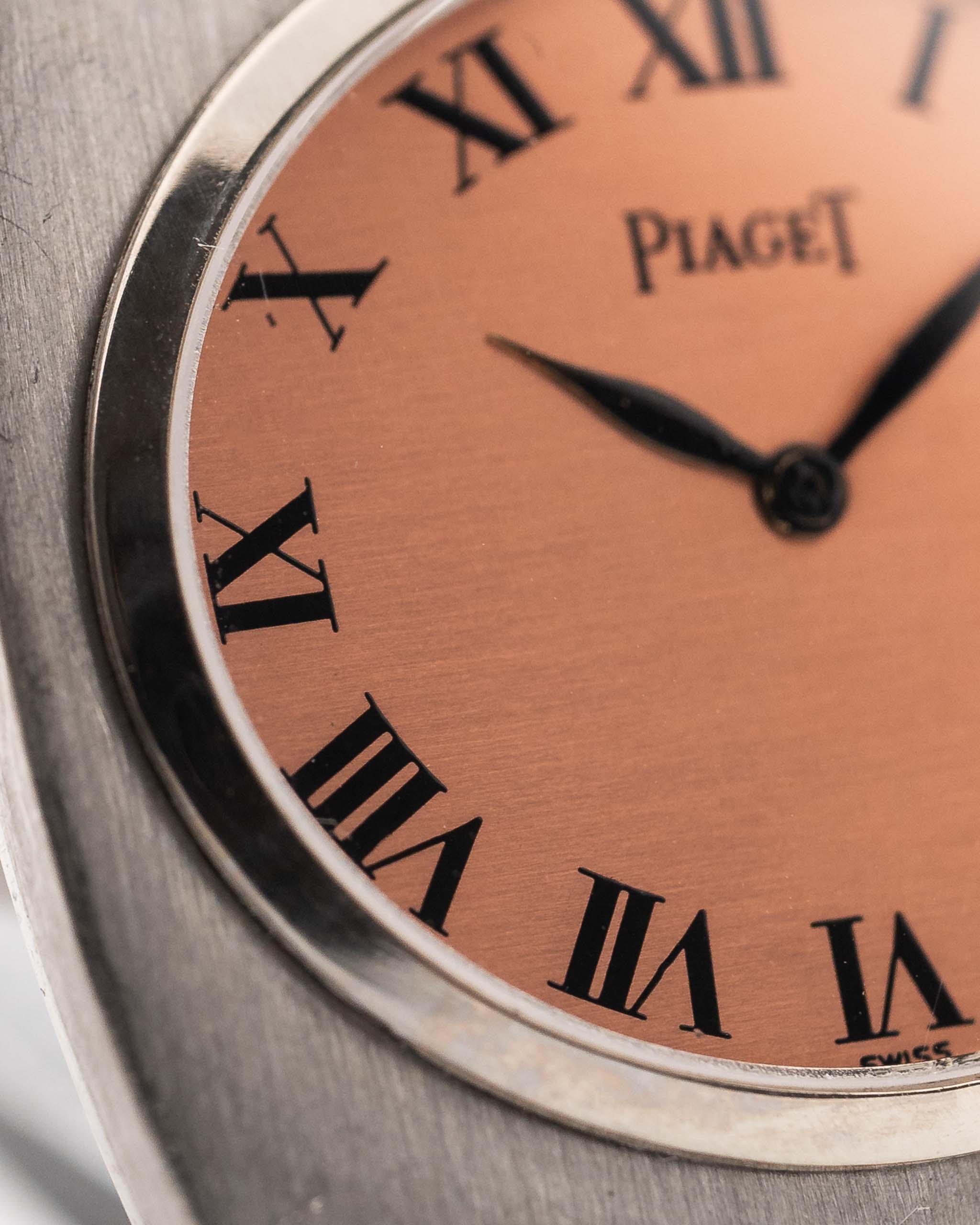 Nuestra pieza se presenta en un estado general fantástico, con una esfera salmón poco común impecable, números romanos, forma de caja de TV y volante de hoja. En su interior encontramos el fino calibre manual Piaget 9P.