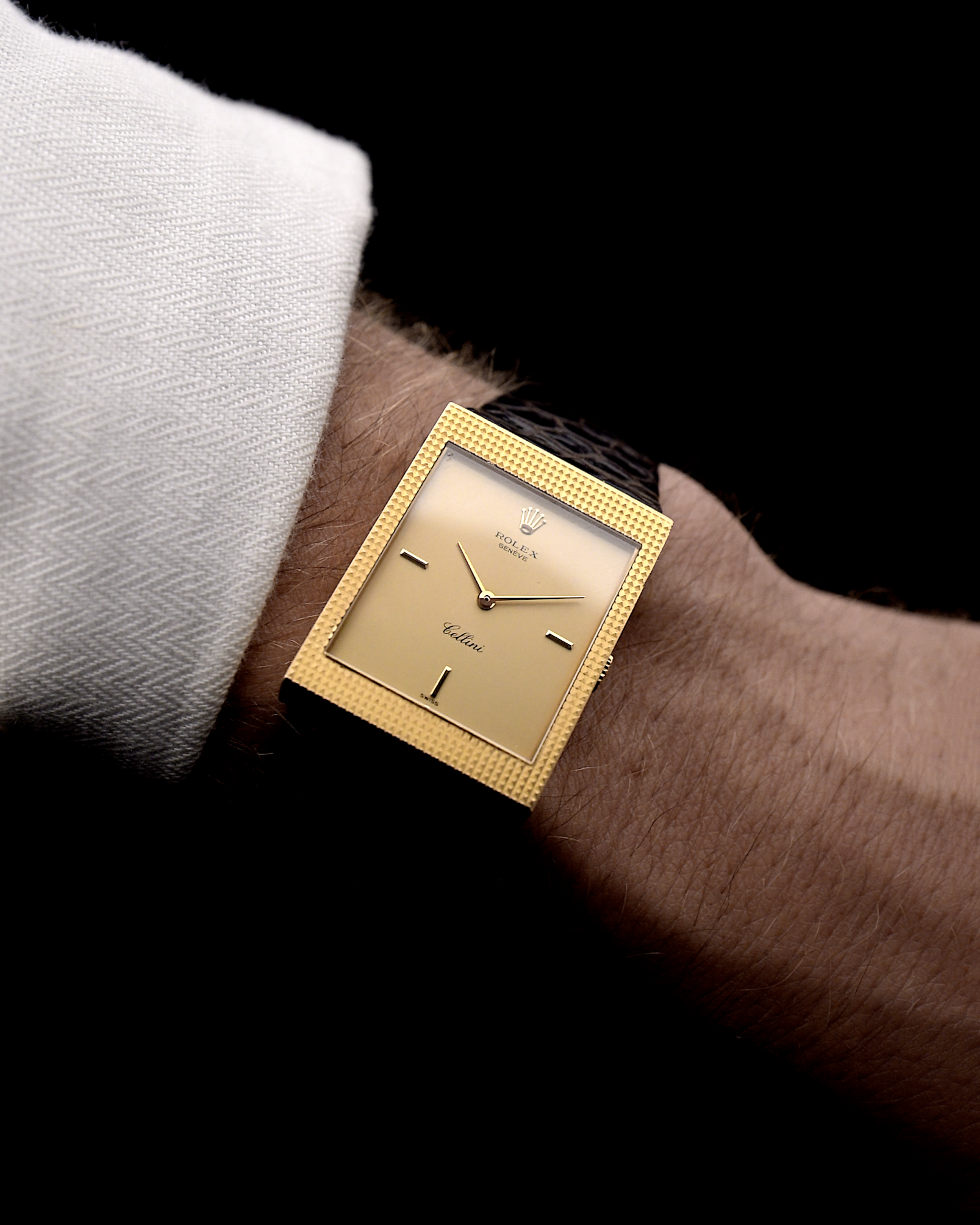 La línea Cellini de Rolex muestra el lado más elegante de Rolex en comparación con sus modelos deportivos más conocidos. Esta versión tiene una caja cuadrada de oro amarillo de 18 quilates, una forma poco habitual en Rolex.