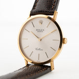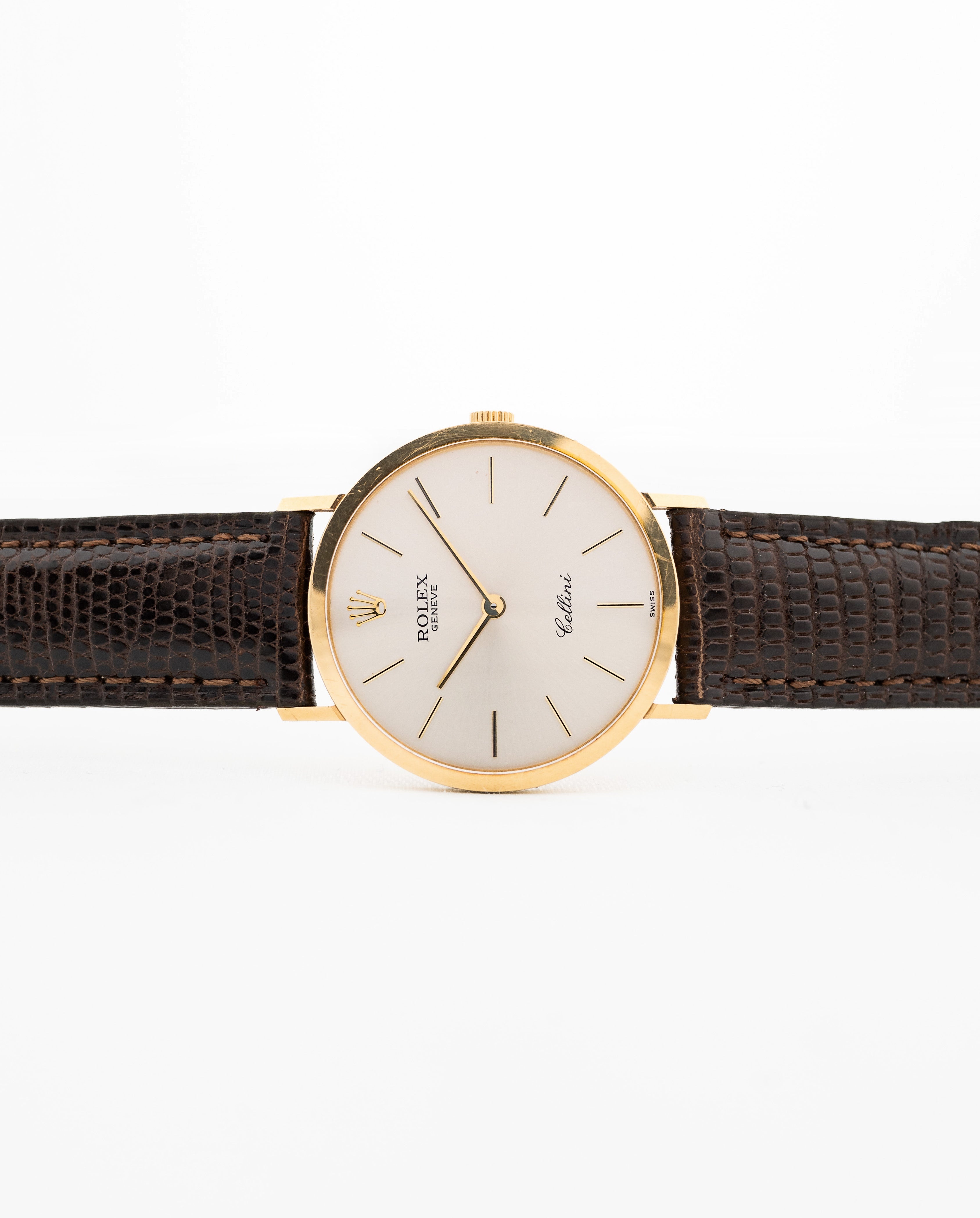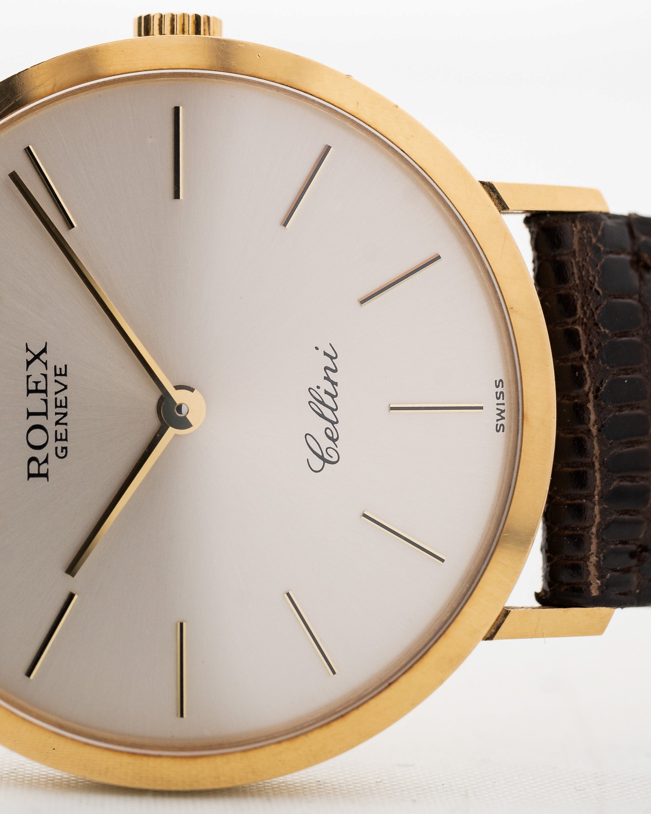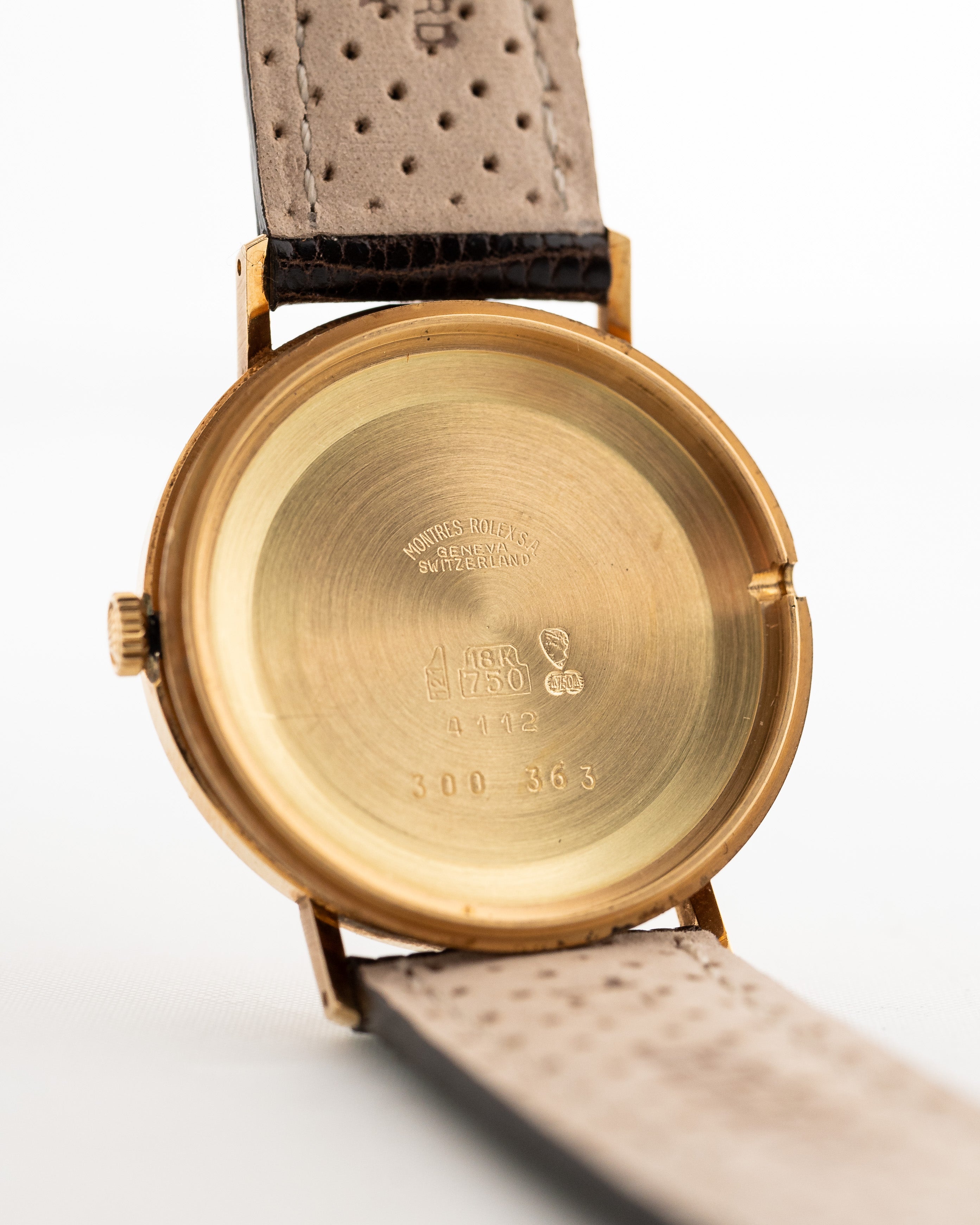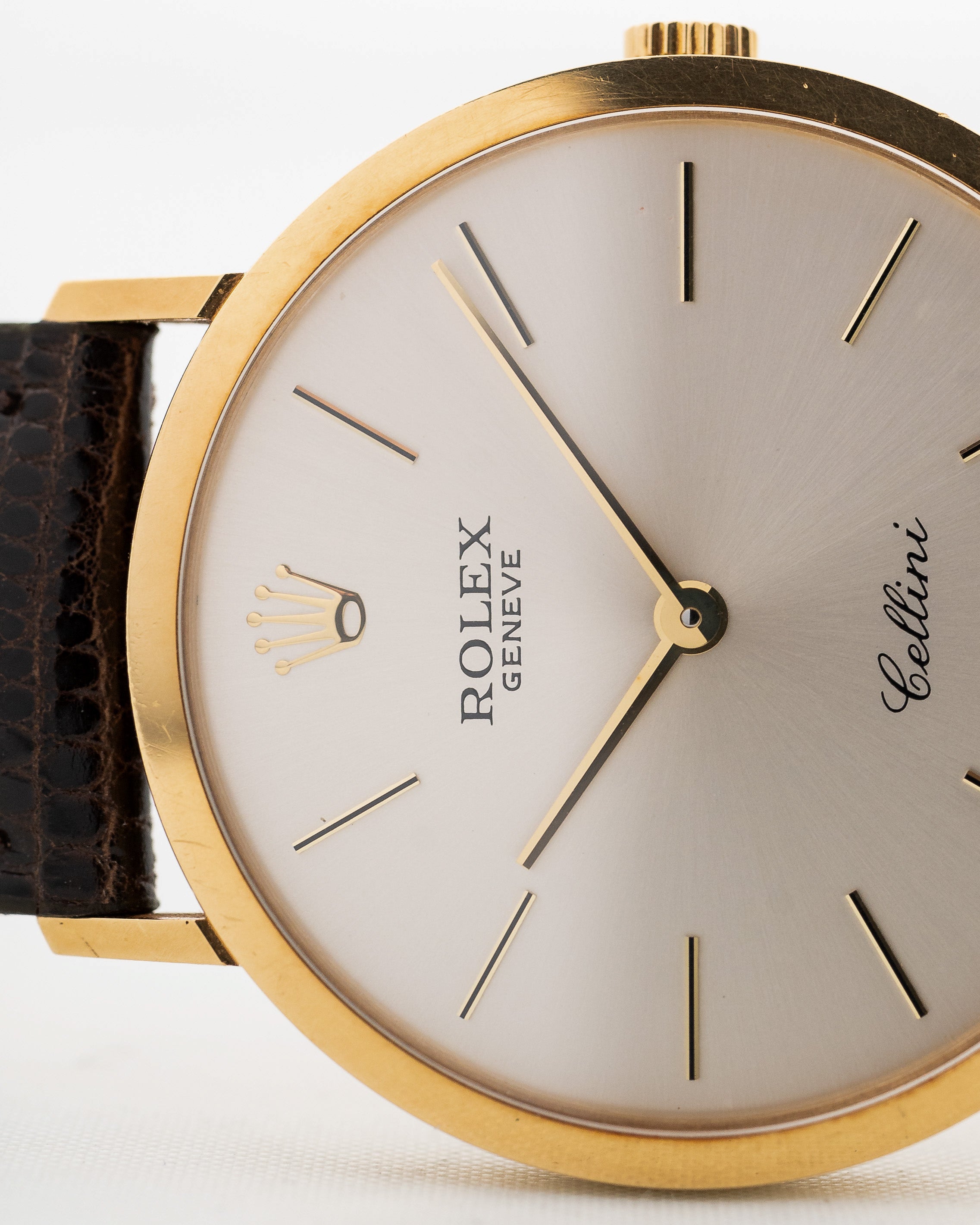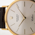 La línea Cellini de Rolex muestra el lado más elegante de Rolex en comparación con sus modelos deportivos más conocidos. Nuestra versión Ref. 4112 está equipada con una caja de oro amarillo de 18 quilates y una hermosa y muy rara esfera blanca/plata impecable con un limpio diseño de esfera de calatrava.