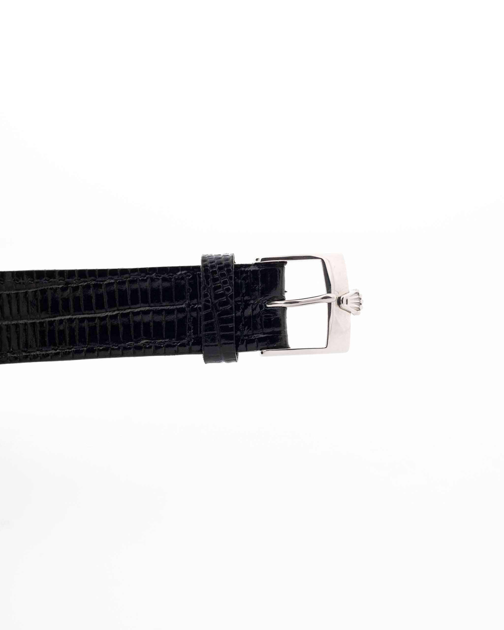 Impulsando esta refinada pieza se encuentra el Calibre Rolex 1601, un movimiento de cuerda manual que proporciona una precisión atemporal. ¿Y el toque final? La hebilla Rolex original de oro blanco de 18 quilates, un extra raro y elegante para coleccionistas y entendidos por igual.