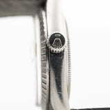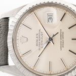 Nuestra pieza en particular con la Referencia 16030 de 1984 destaca por su bisel torneado a motor, una hermosa esfera plateada en perfecto estado y una caja muy robusta con bordes afilados.