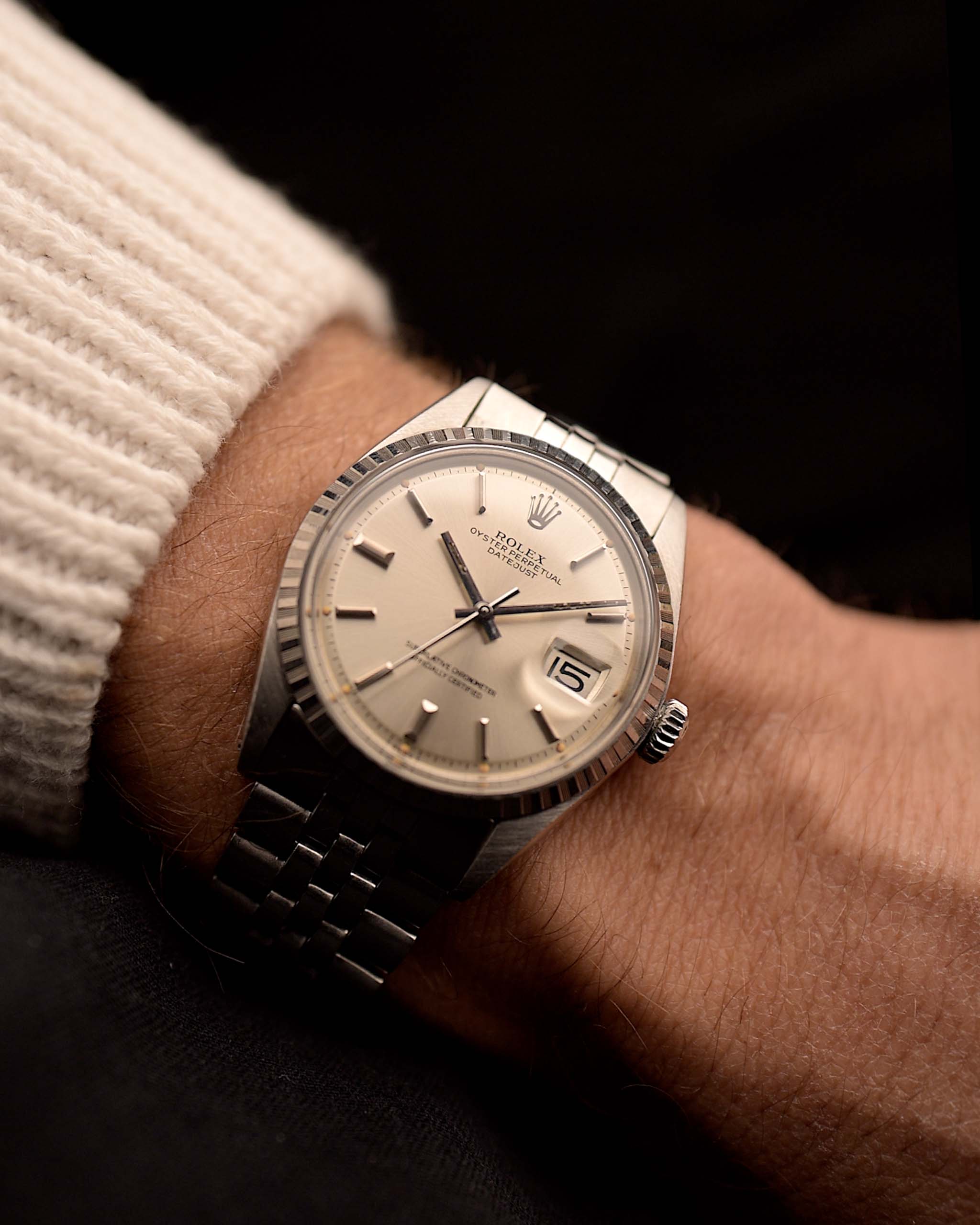 Esta Ref. 1603 de 1973 encarna a la perfección ese espíritu. Su caja Oyster de acero inoxidable de 36 mm, el bisel torneado a motor y la esfera plateada con efecto sol crean un armonioso equilibrio entre forma y función. Los índices, las agujas y el brillo han envejecido a la perfección, confiriendo al reloj un discreto encanto vintage que se puede llevar hoy en día sin esfuerzo.