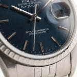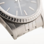 Esta pieza en particular de 1990 destaca por su esfera azul océano profundo con efecto sol en un estado excepcional, con un lume uniformemente envejecido y una caja muy robusta con un bisel torneado a motor.