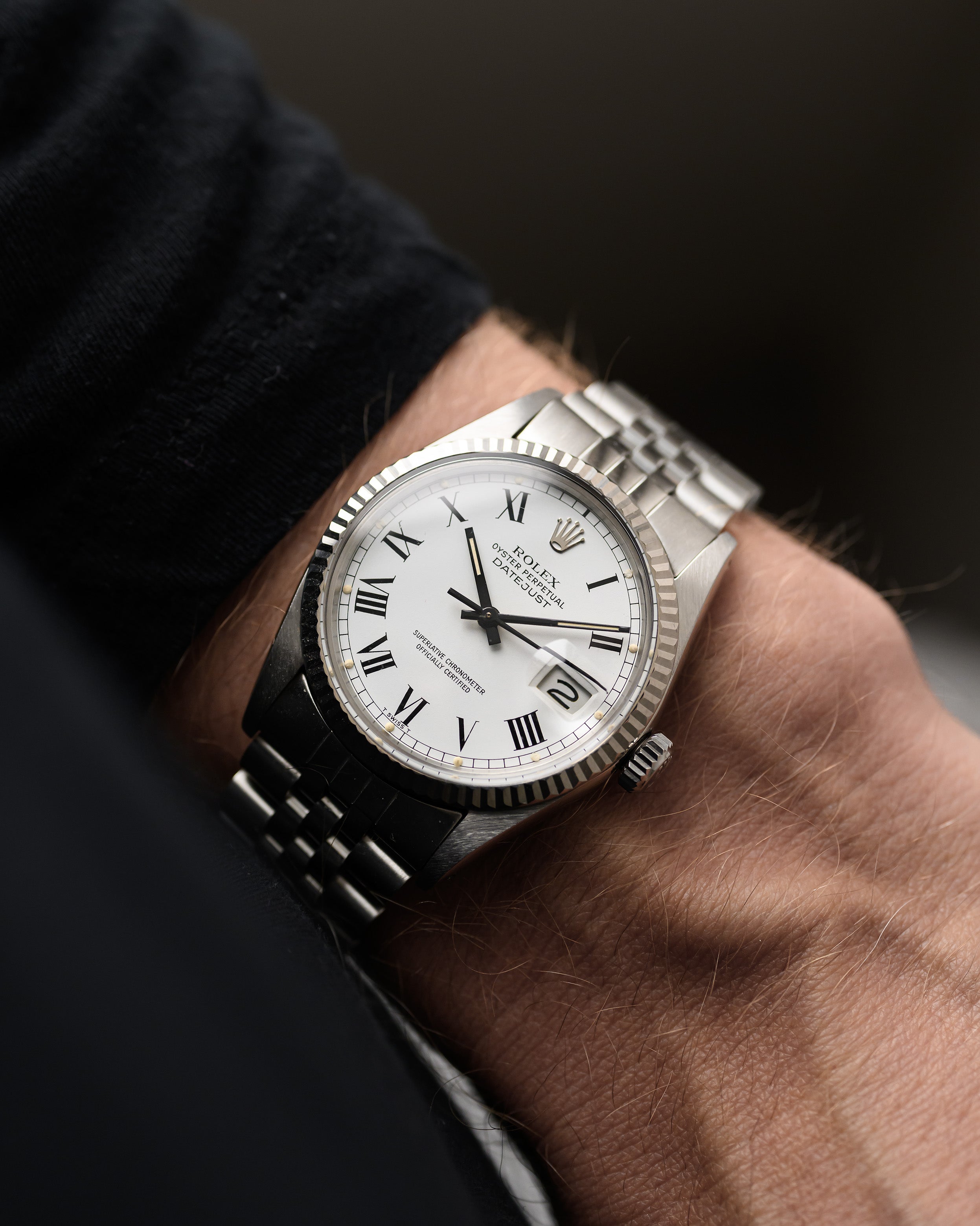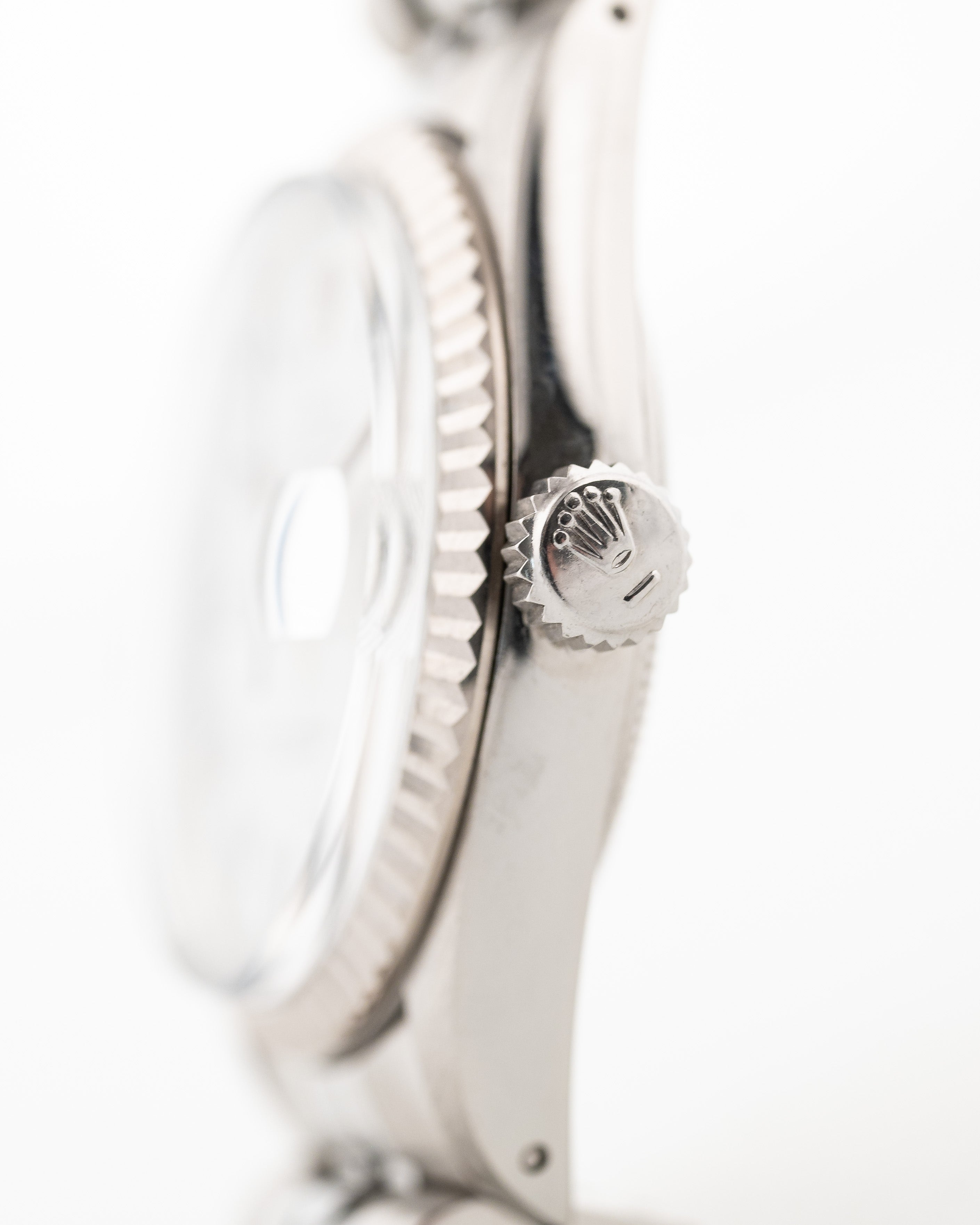 Esta pieza en particular de 1984 destaca por su bisel estriado de oro blanco, una esfera Buckley blanca muy rara e impecable y una caja muy robusta con bordes afilados en un estado excepcional.