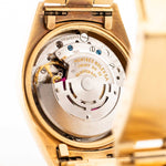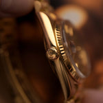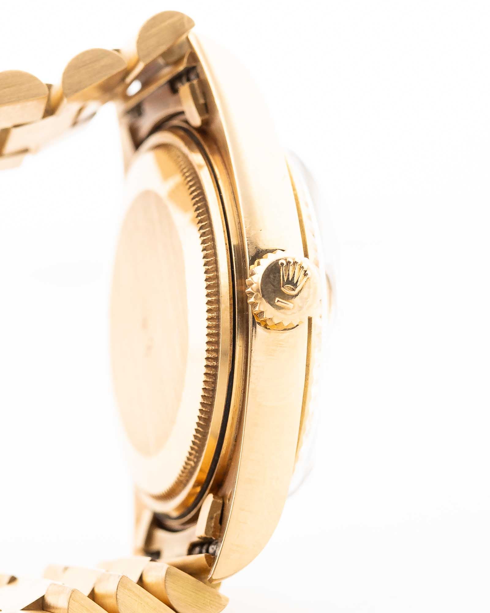 El Rolex Day-Date se encuentra en la cima de la elegancia vintage, y este modelo Ref. 1803 de 1973 es un ejemplo especialmente cautivador. Con una caja de oro amarillo macizo de 18 quilates, este modelo combina las proporciones clásicas del Day-Date con una de las esferas más deseadas de la época: una esfera dorada tipo «pie pan» con textura de lino. Su superficie texturizada refleja la luz de forma magnífica, lo que le confiere al reloj un carácter refinado que lo distingue de las configuraciones estándar.