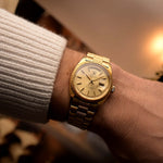 Impulsado por el robusto calibre Rolex 1556, este Day-Date ofrece fiabilidad mecánica con un lujo atemporal. El brazalete President, acabado en textura Moiré a juego, encarna la esencia del modelo: comodidad, elegancia y distinción en cada curva.