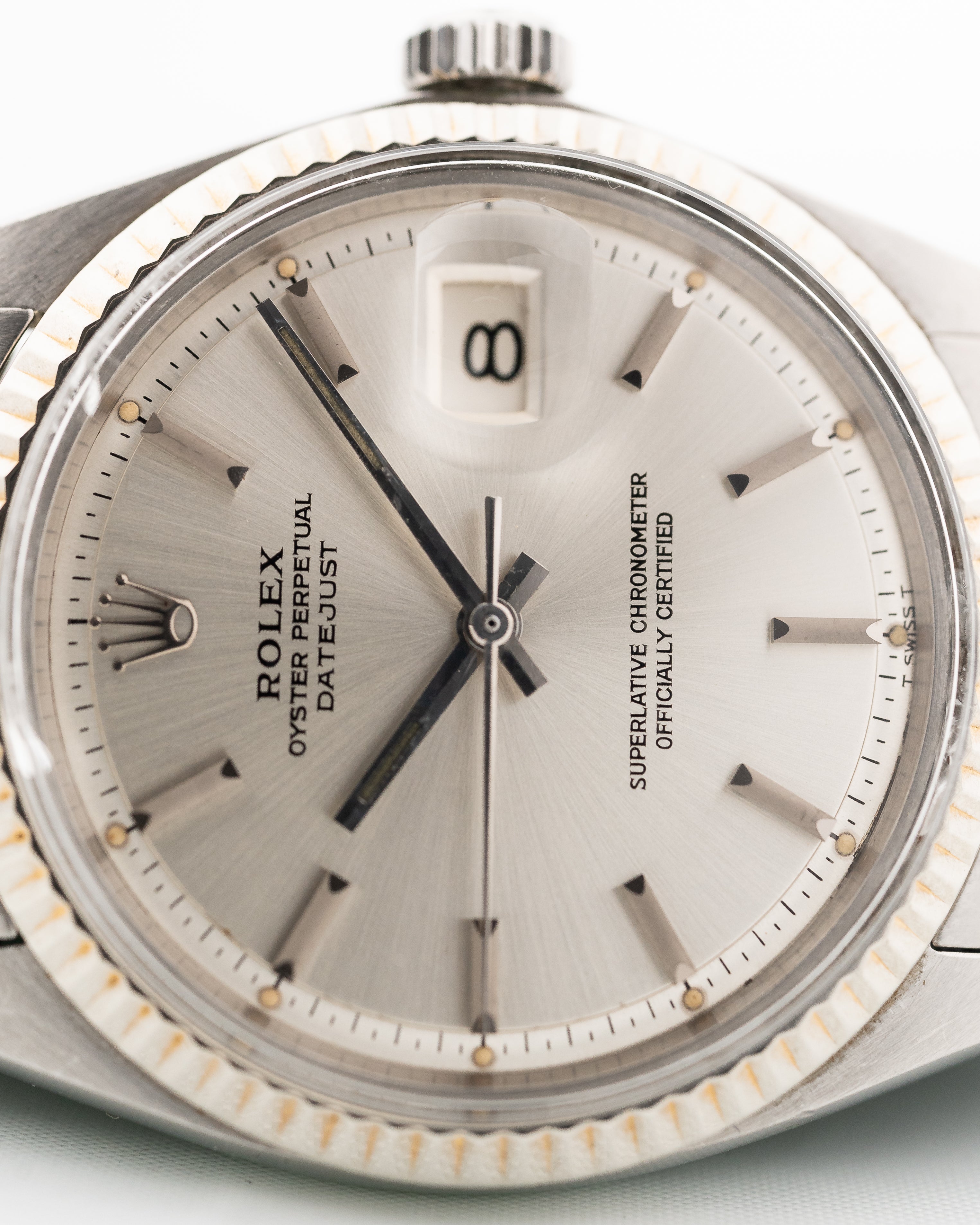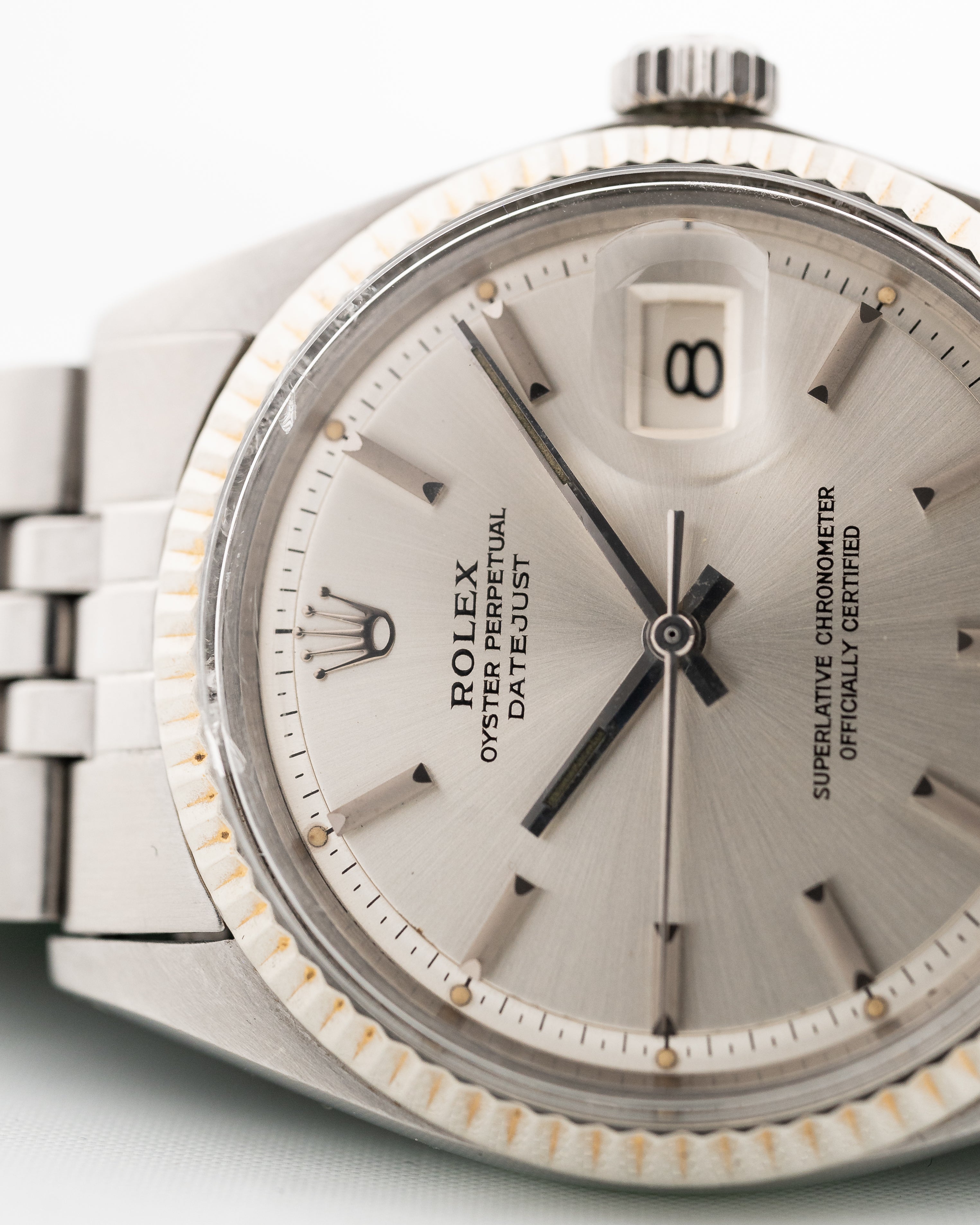Esta pieza en particular, de 1970, destaca por su bisel estriado de oro blanco de 18 quilates, una impecable esfera plateada en forma de pastel y una caja muy robusta con bordes afilados en un estado excepcional.