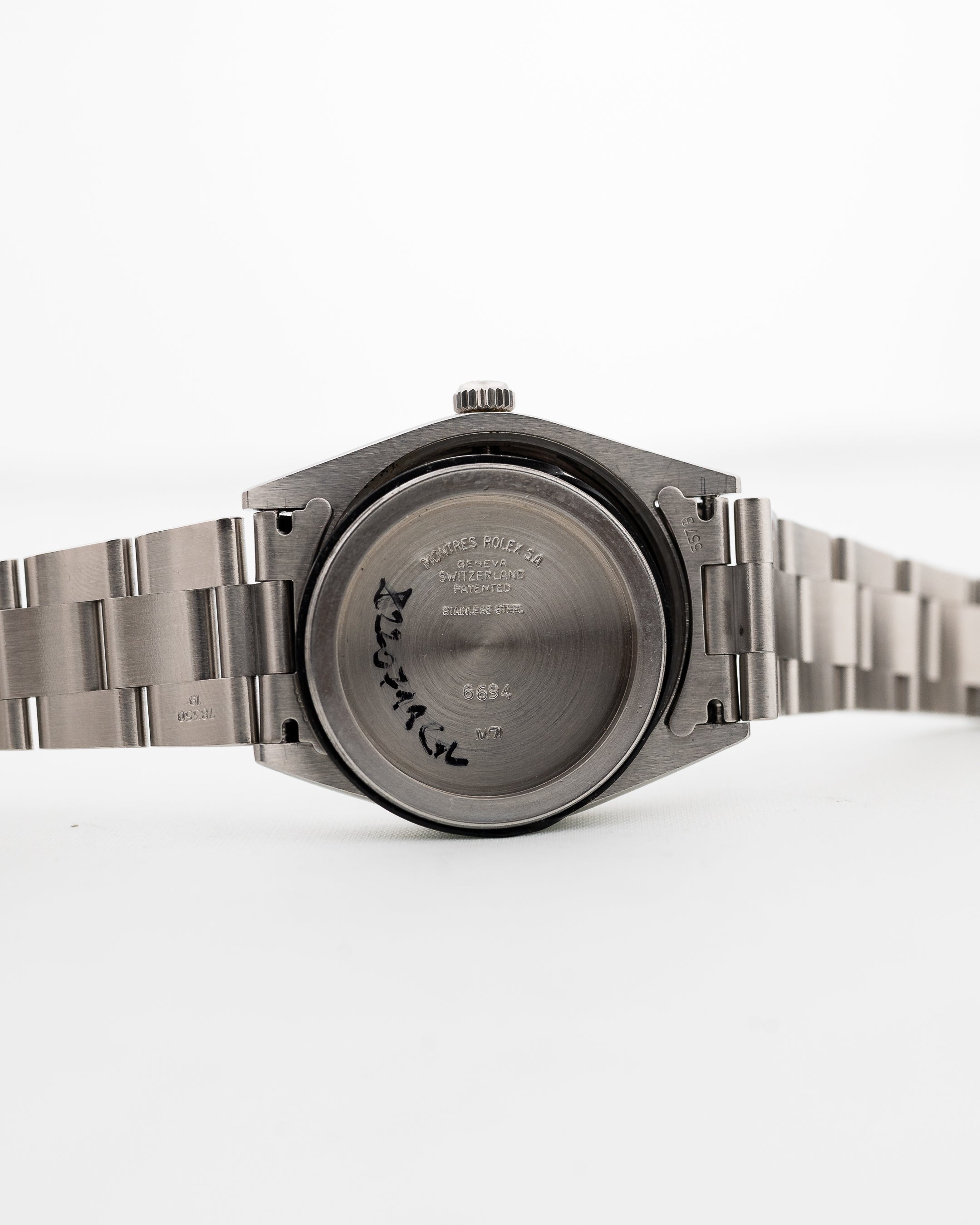 Esta pieza en particular de 1971 destaca por su impecable esfera gris con efecto sol y su robusta caja con bordes afilados, en perfecto estado.