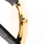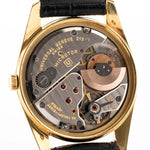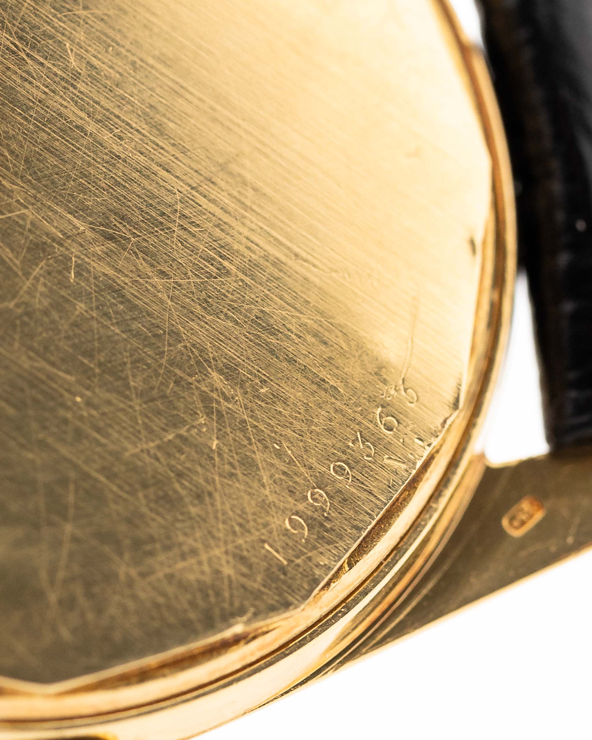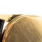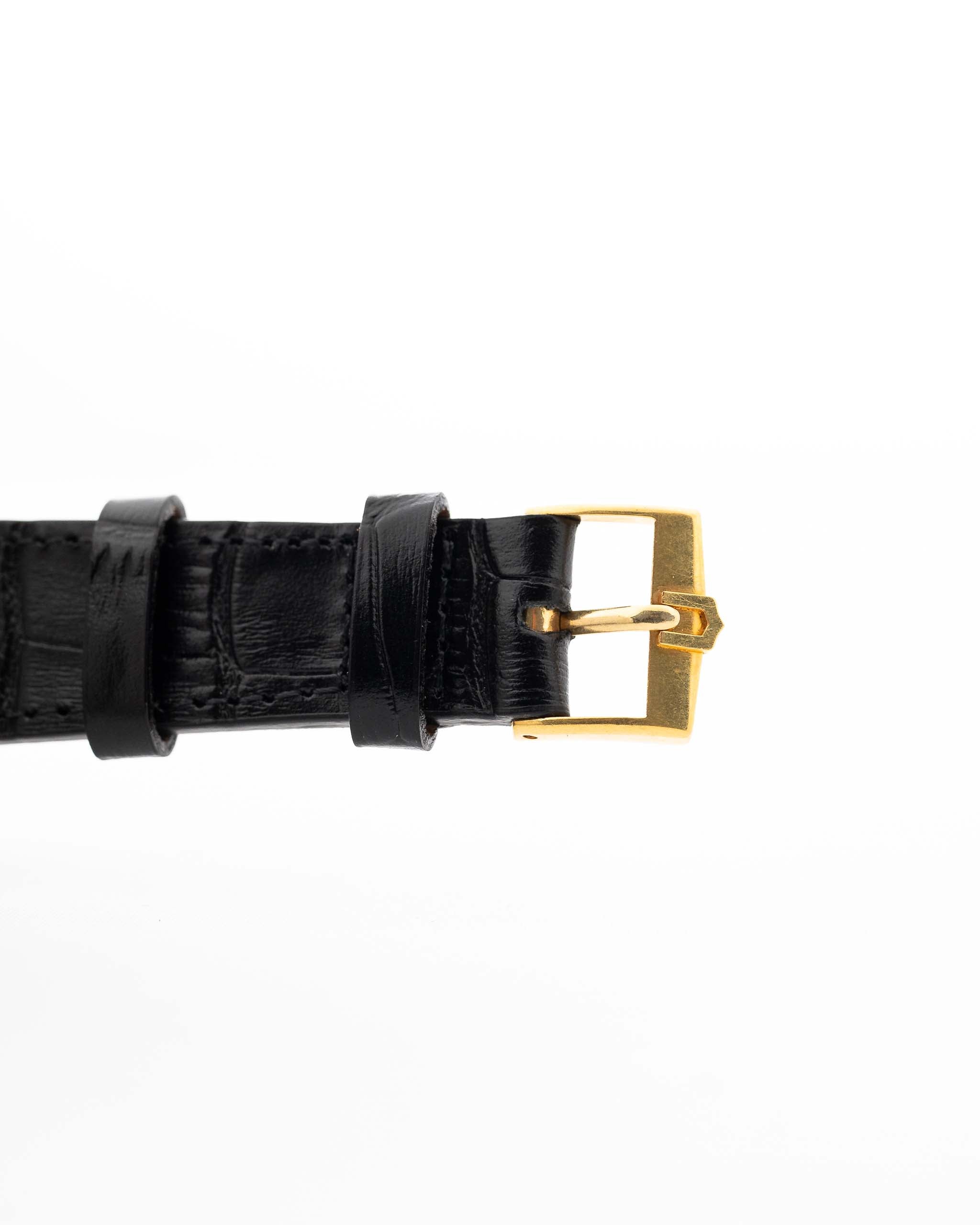 Esta rara ref. 104503-3 es una de las ejecuciones Polerouter más elegantes jamás producidas. Elaborado en oro amarillo macizo de 18 quilates, el reloj presenta unas asas esbeltas, una caja de 34 mm bellamente proporcionada y una llamativa esfera negra en forma de cruz que irradia un lujo discreto. La corona original firmada por UG y la hebilla chapada en oro siguen presentes, detalles que hacen de esta una excepcional pieza de coleccionista.