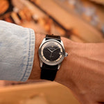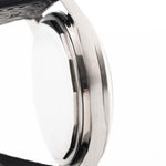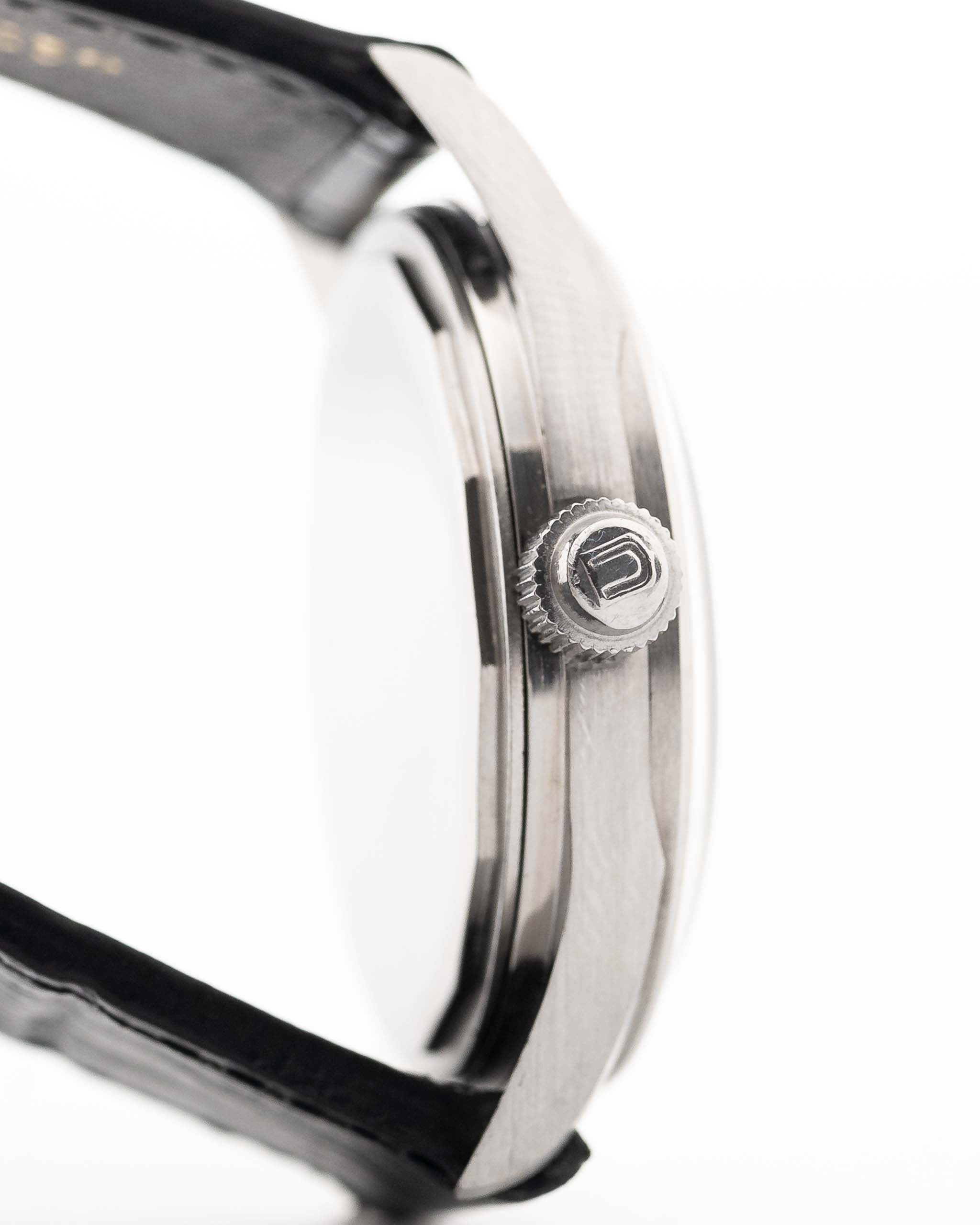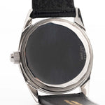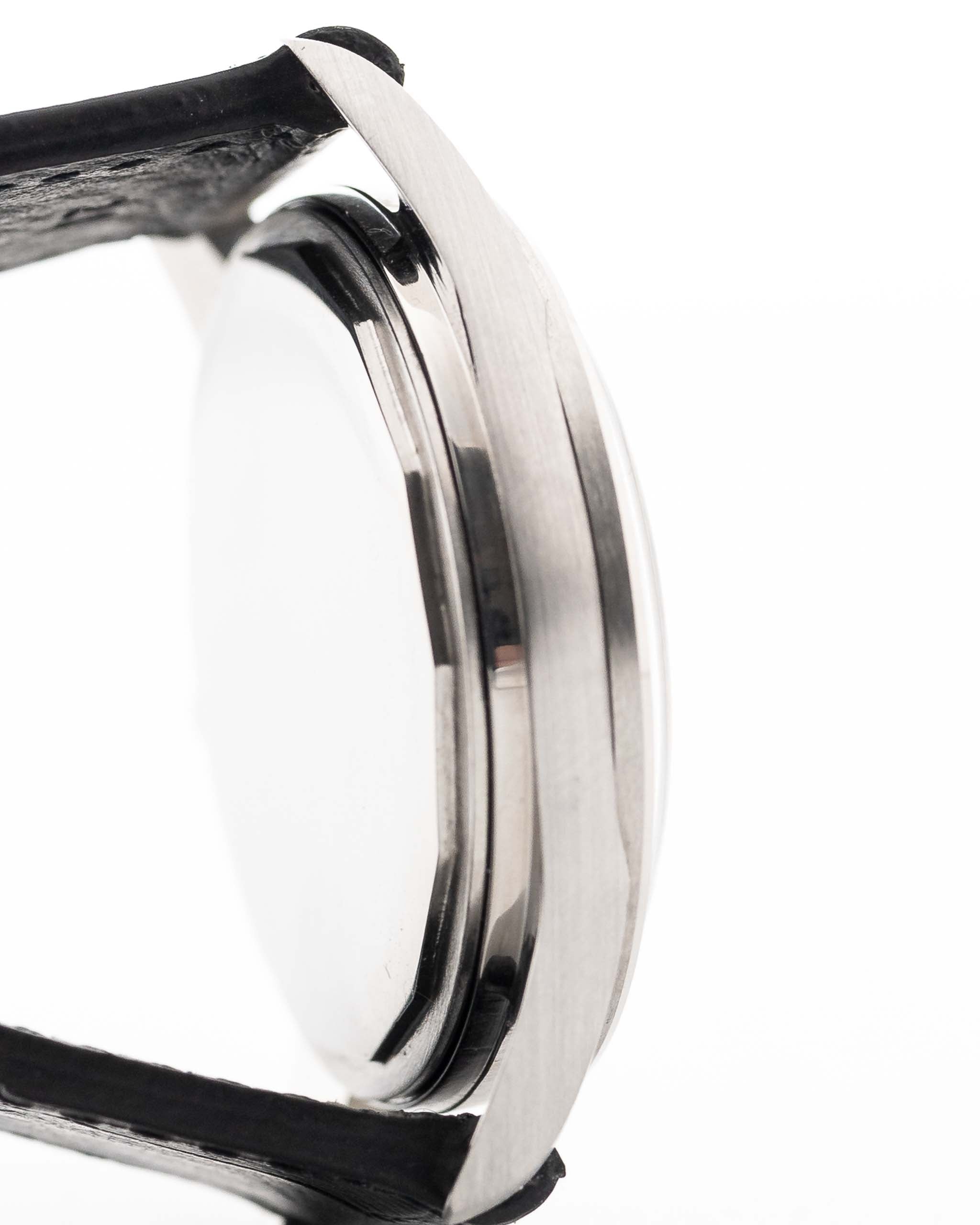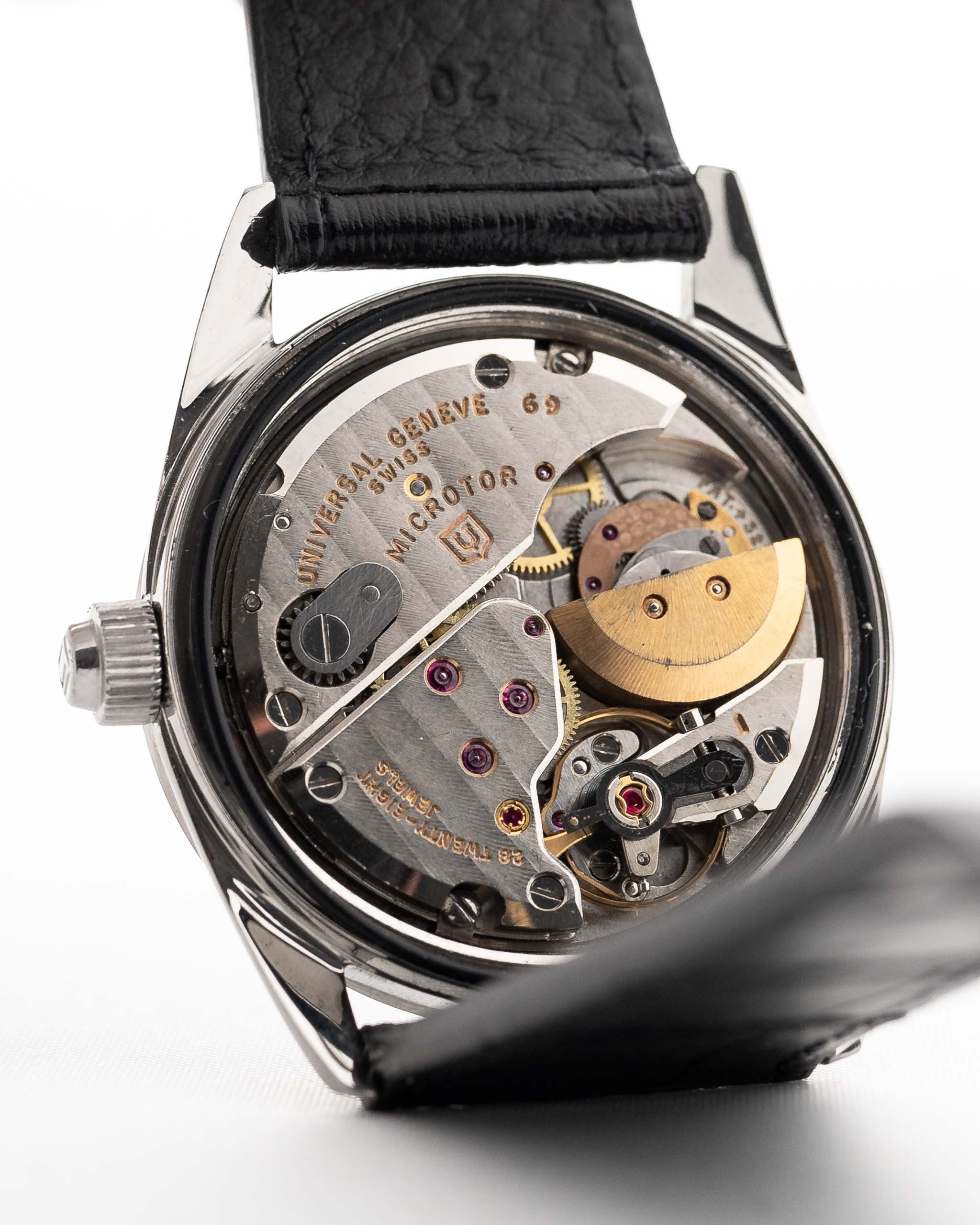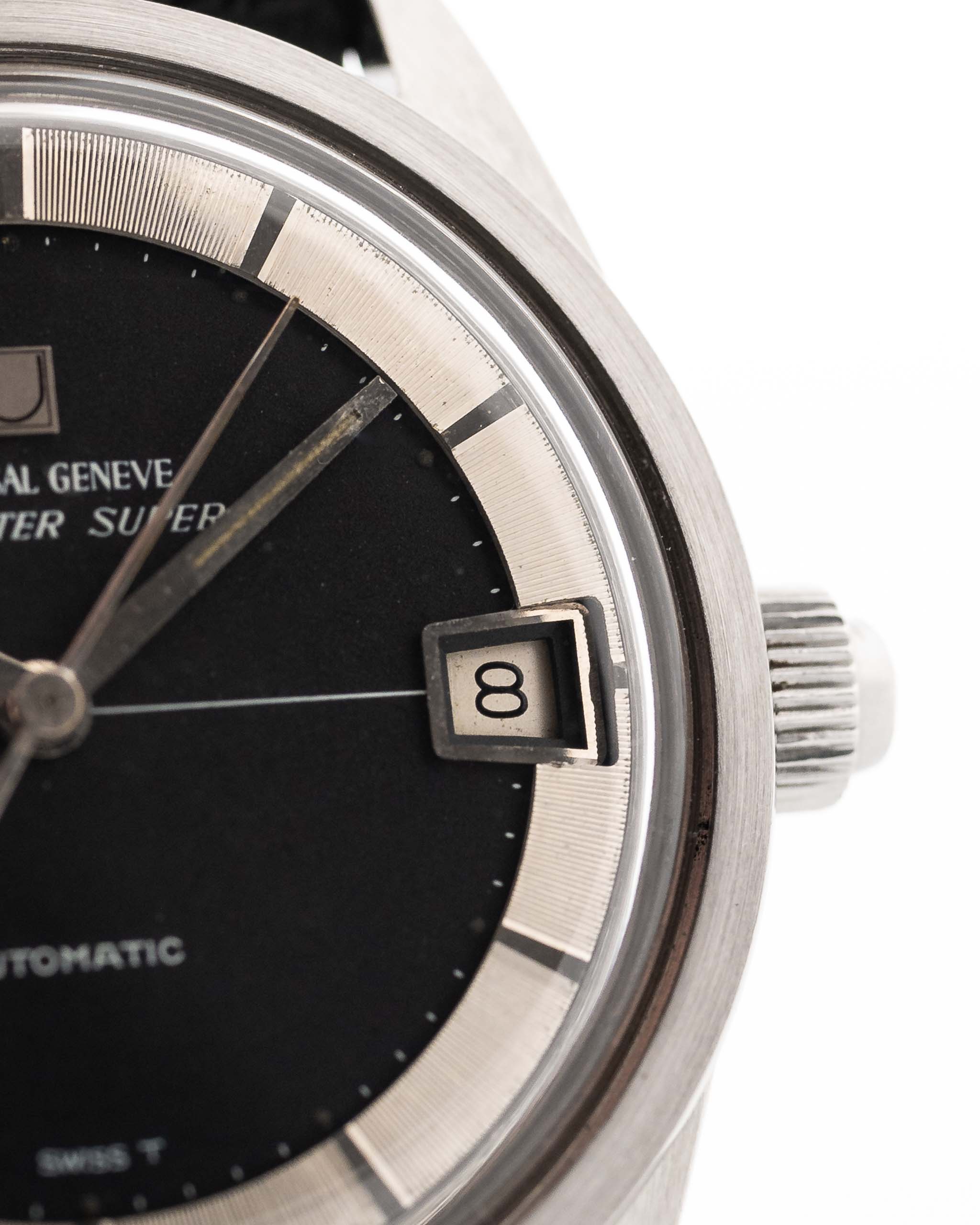 Su esfera negra en forma de cruz emparejada con un anillo de capítulos de acero espejado crea un llamativo juego de luces, elevando esta pieza mucho más allá de un reloj herramienta tradicional. La caja, en excelente estado, ha sido pulida según las especificaciones originales de la fábrica Universal Genève, preservando sus bordes afilados y su encanto vintage.