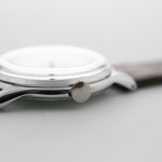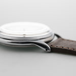 Equipado con una caja de acero de 35 mm, asas dobladas hacia abajo y una preciosa esfera plateada, no hay nada mejor que este reloj. La esfera ha envejecido maravillosamente, y cuenta con números arábigos y un segundero azul, lo que eleva aún más el juego de vestir de este reloj.