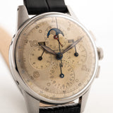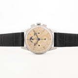 Nuestra versión con la referencia 22258 de los años 50 no es sólo un gran ejemplo de este modelo, sino también una gran demostración de por qué el Tri Compax es tan ávidamente buscado. Presenta una hermosa caja de acero inoxidable con asas en ángulo y una disposición de la esfera que es para morirse.