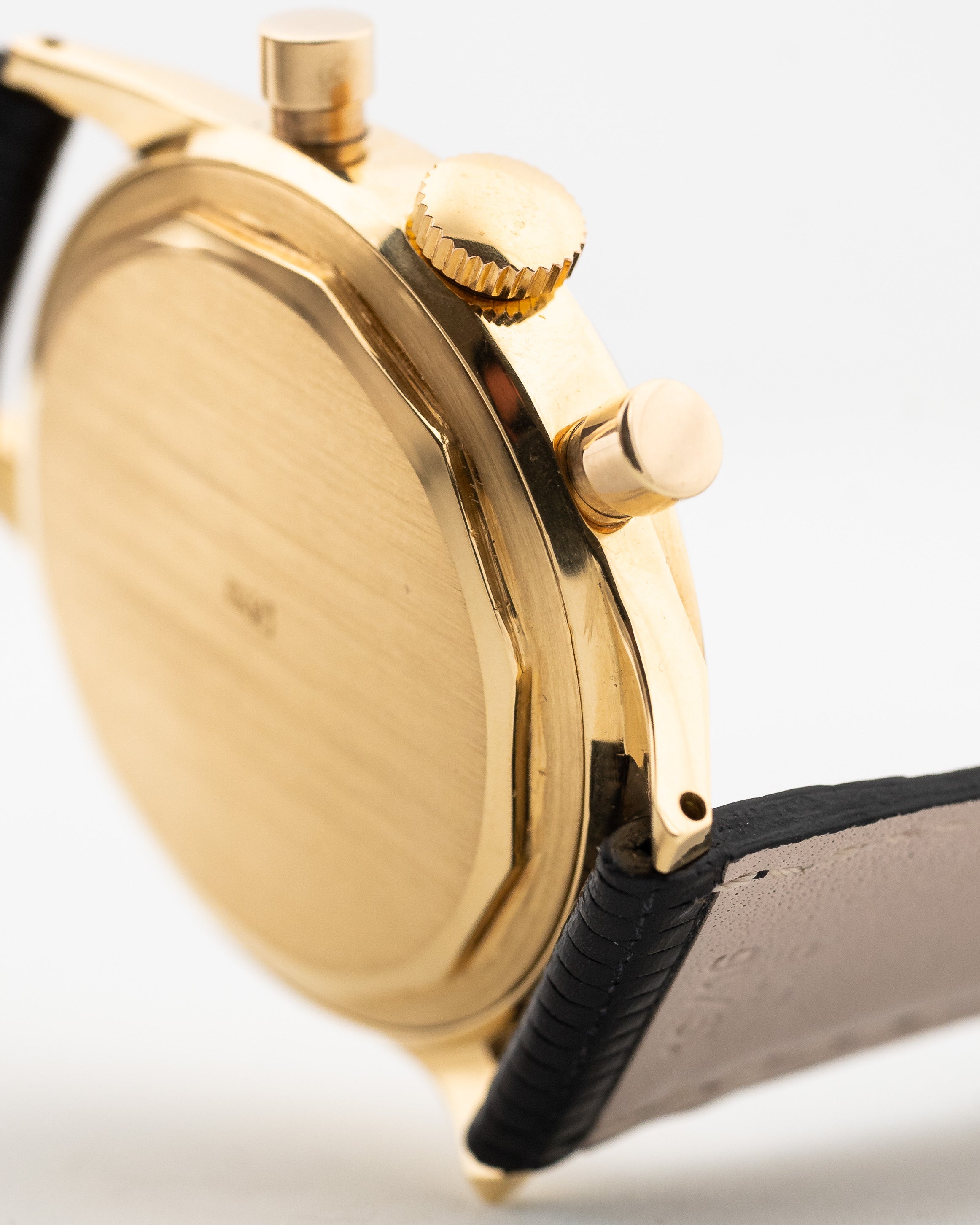Este Universal Geneve Uni-Compax es un fantástico ejemplo de lo que el fabricante hizo tan bien en la década de 1940. La caja Jumbo de oro amarillo de 18 quilates con pulsadores redondos alberga el deseable movimiento calibre 285.